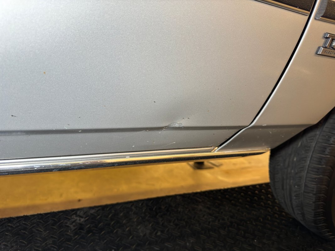 Bright Silver Metallic covers the car which is accented by a chrome grille, a red pinstripe, and black side molding. A pair of hood vents contribute a touch of sportiness to the square car and wire wheel covers dress it up for an evening out on the town. Lined taillights sit above the protruding rear bumper and the canvas folding top is in good condition and has a glass rear window. Dual headlights sit back in a chrome bezel with a slightly canted front fascia that is subtly and yet distinctly Chrysler, confirmed by the Pentastar hood ornament on the nose. Overall, the body and paint are in decent condition with some imperfections. These include blotches of mismatched paint, numerous scratches and scuffs, dings, along with some touched up chips and body work.