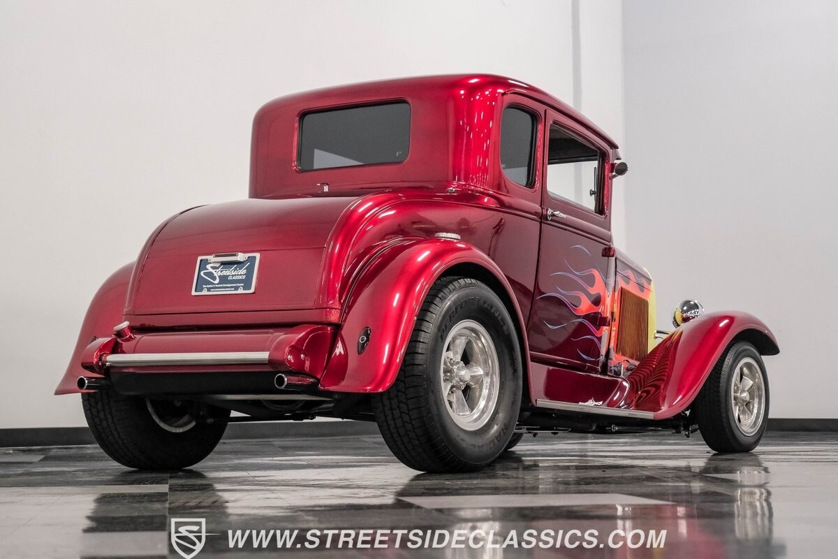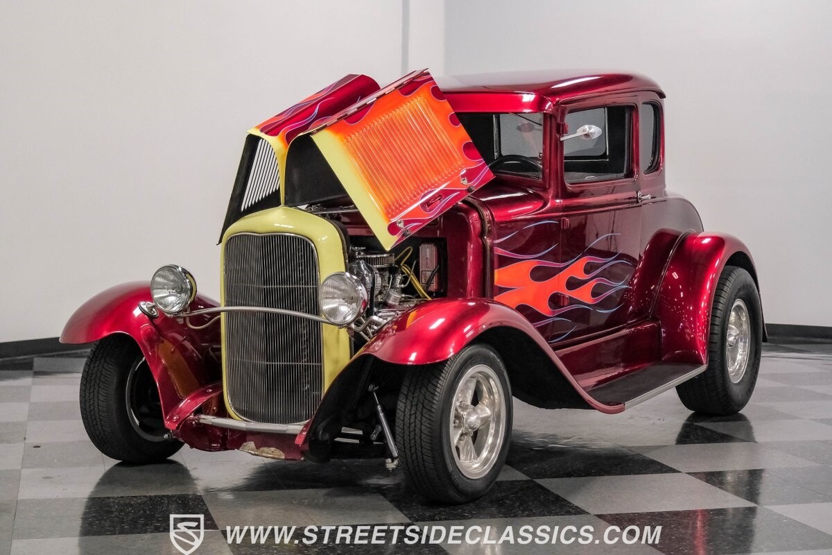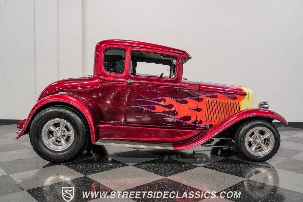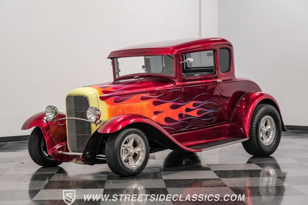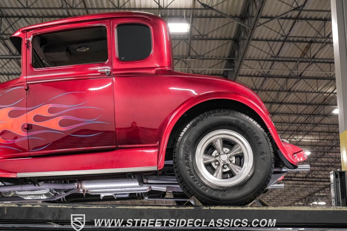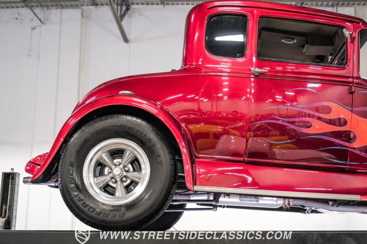 This 1931 Ford 5-Window Rumble Seat Coupe grabs attention with its Candy Apple Red Metallic paint and custom airbrushed flames. The all-steel body sits low on a custom chassis, sporting 14" American Racing wheels up front and 15" in the rear. Nitto 175/65R14 tires lead the charge, with beefy 265/70R15 "Performance Radial LT" rubber in back. Chrome accents and engine louvers add classic hot rod flair, while the functional rumble seat offers a unique throwback feature.