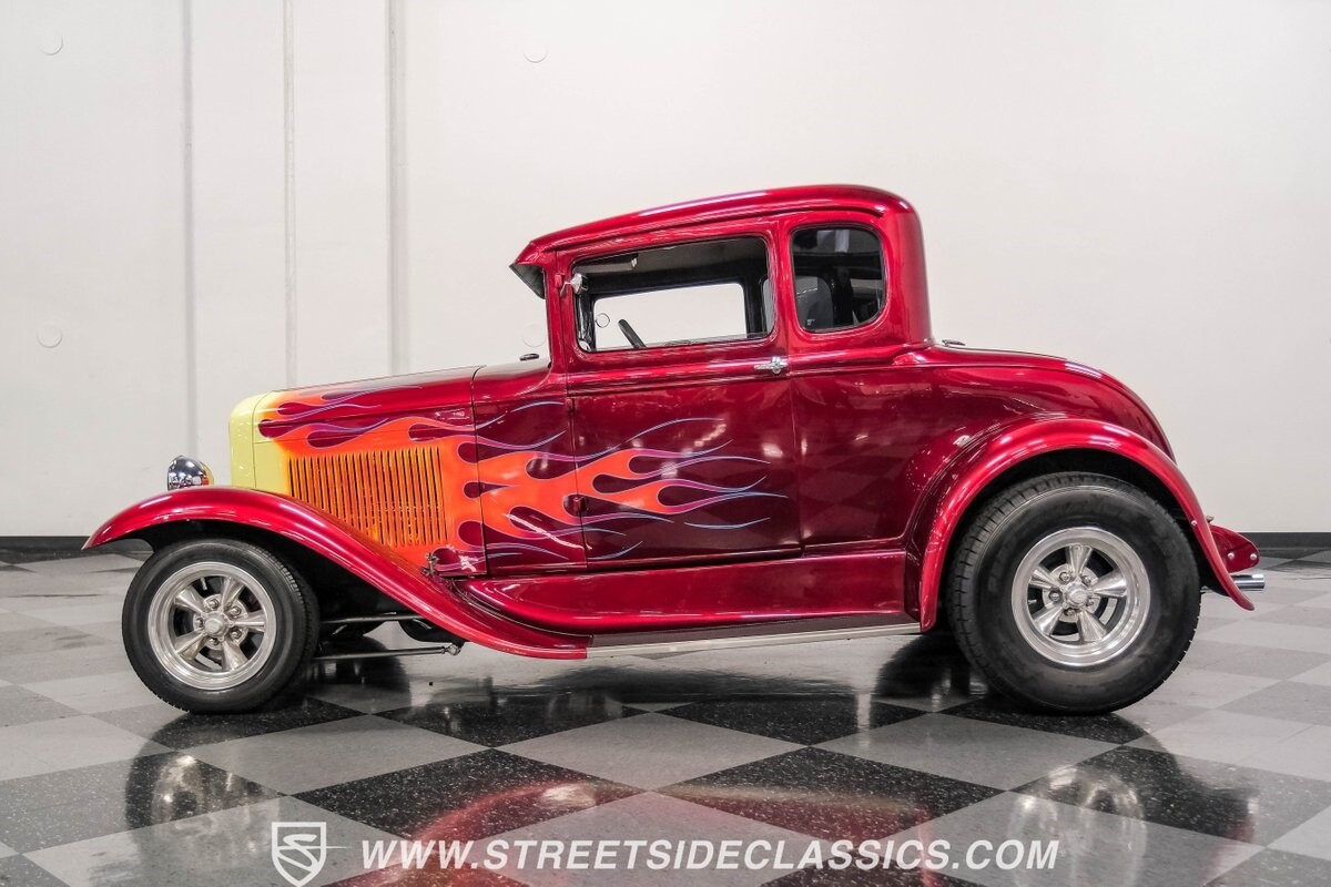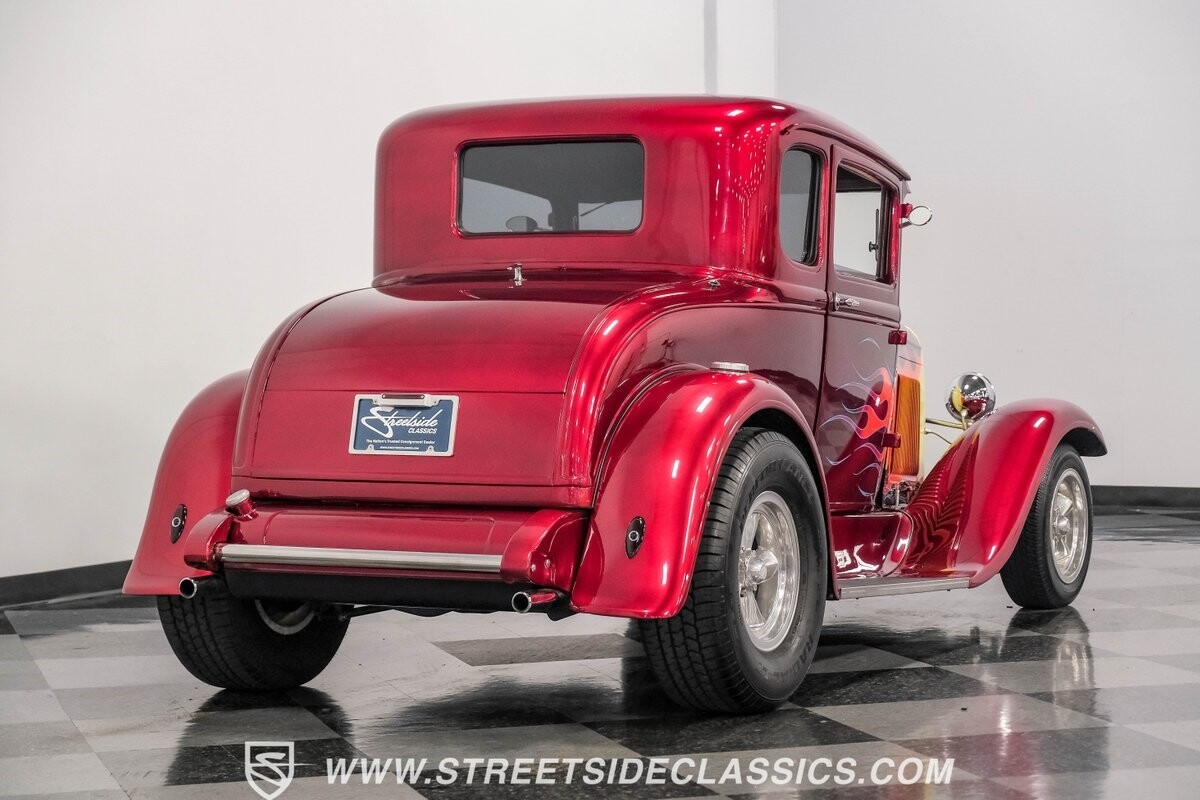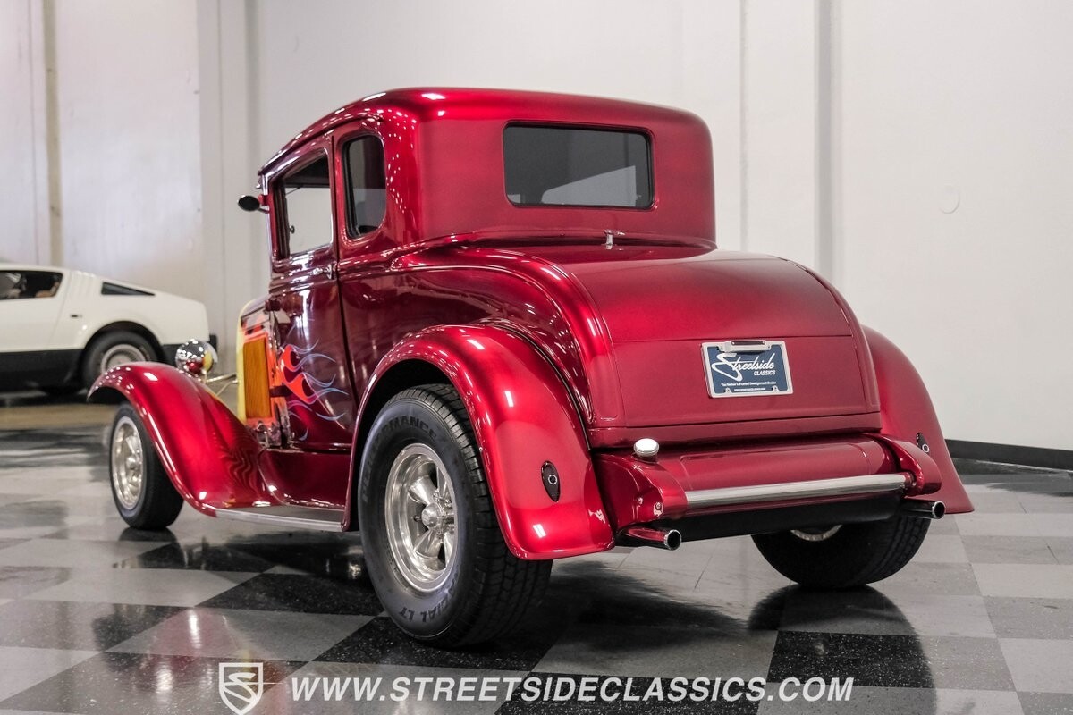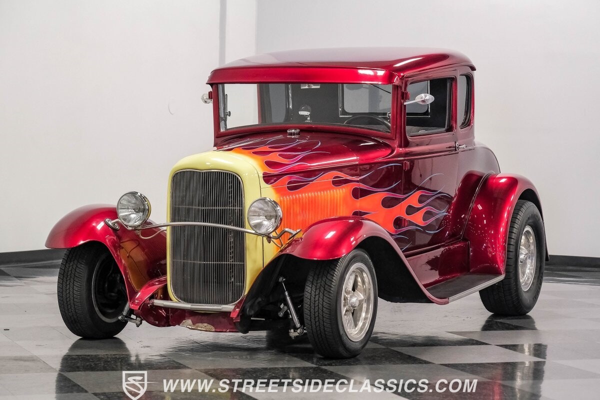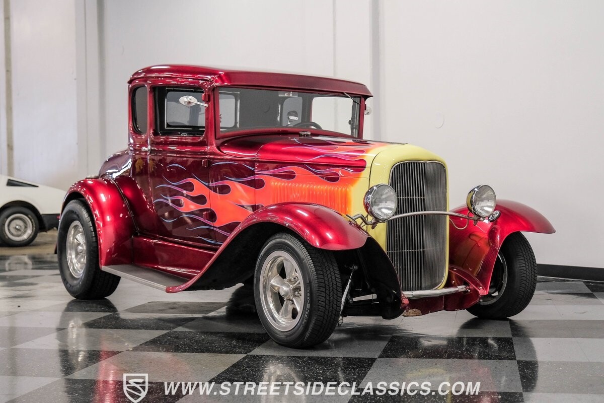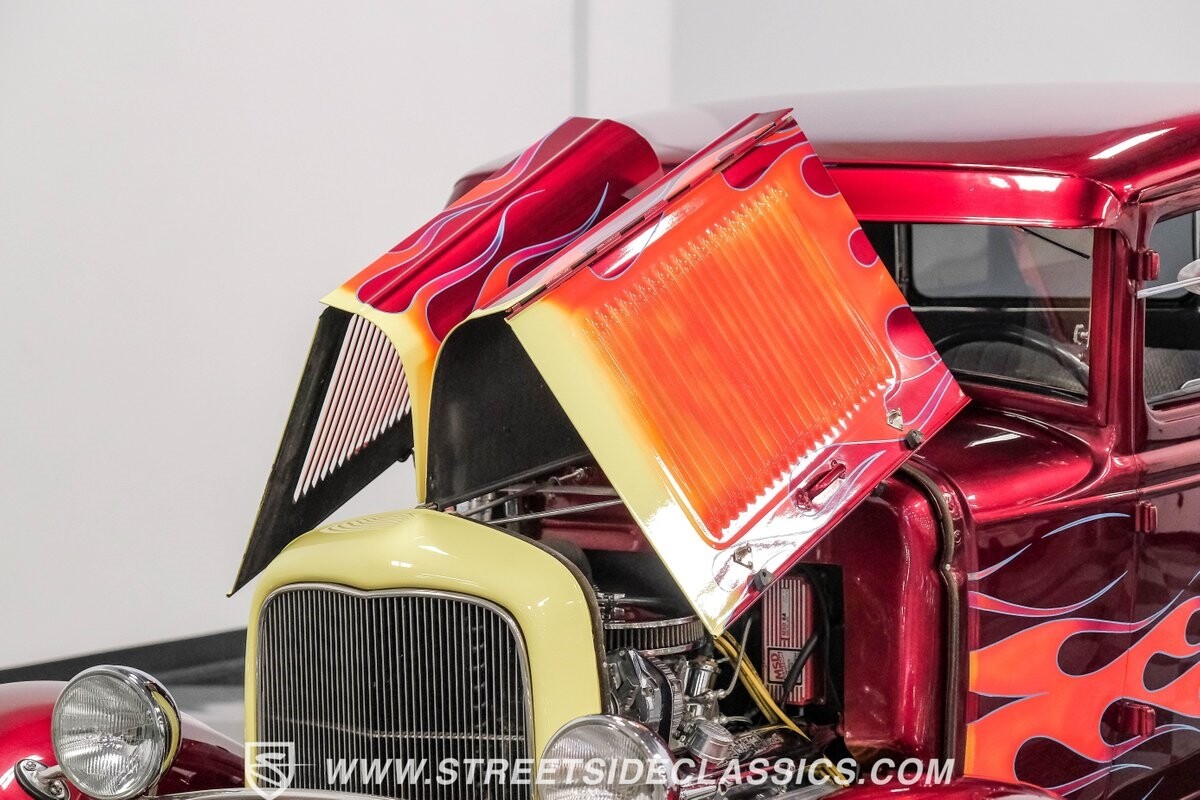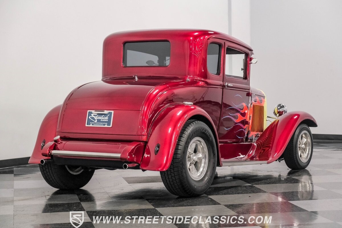 This 1931 Ford 5-Window Rumble Seat Coupe grabs attention with its Candy Apple Red Metallic paint and custom airbrushed flames. The all-steel body sits low on a custom chassis, sporting 14" American Racing wheels up front and 15" in the rear. Nitto 175/65R14 tires lead the charge, with beefy 265/70R15 "Performance Radial LT" rubber in back. Chrome accents and engine louvers add classic hot rod flair, while the functional rumble seat offers a unique throwback feature.