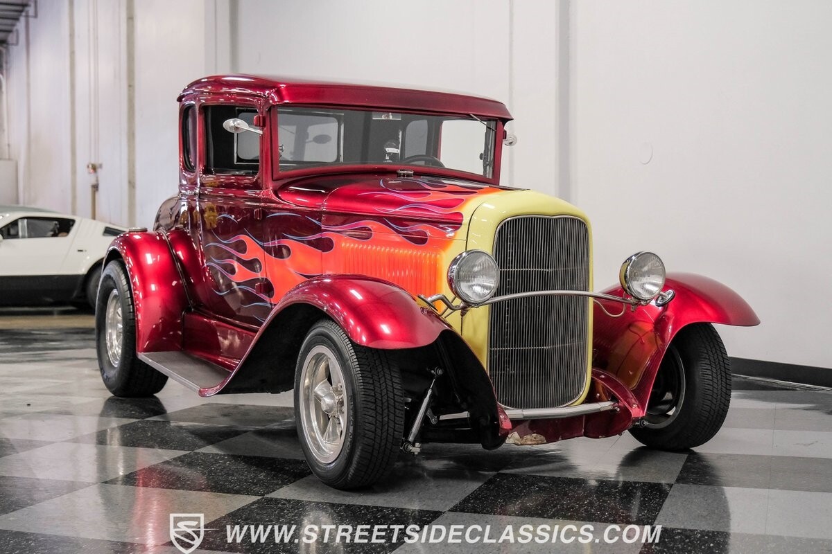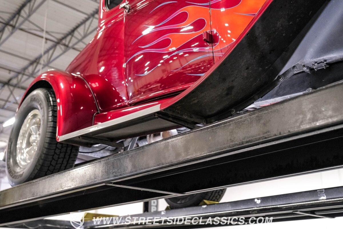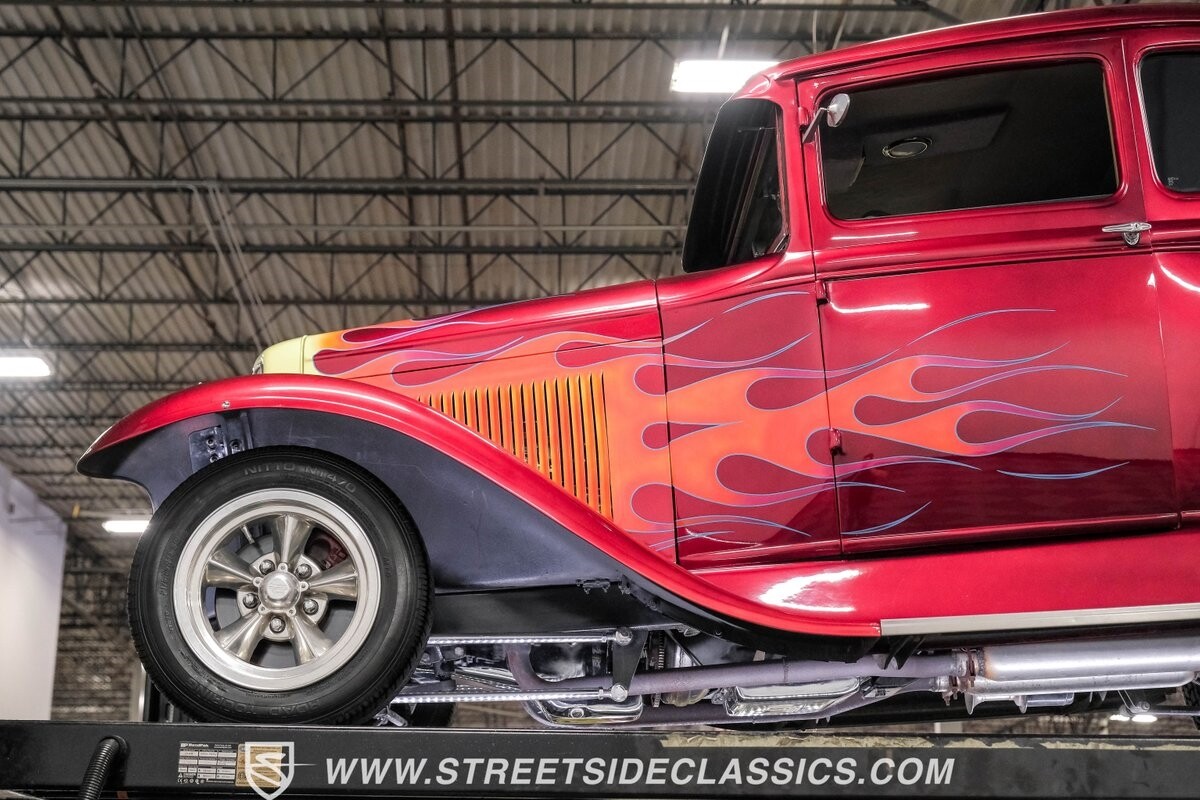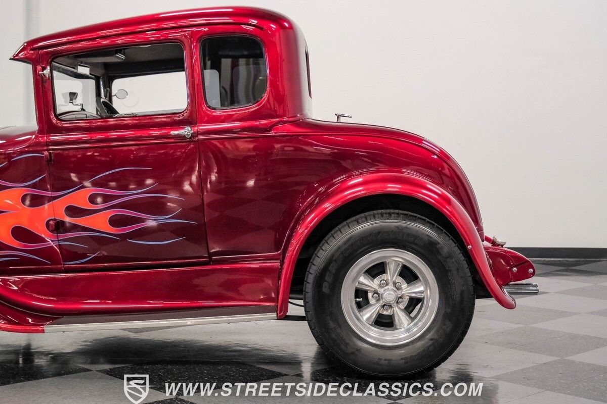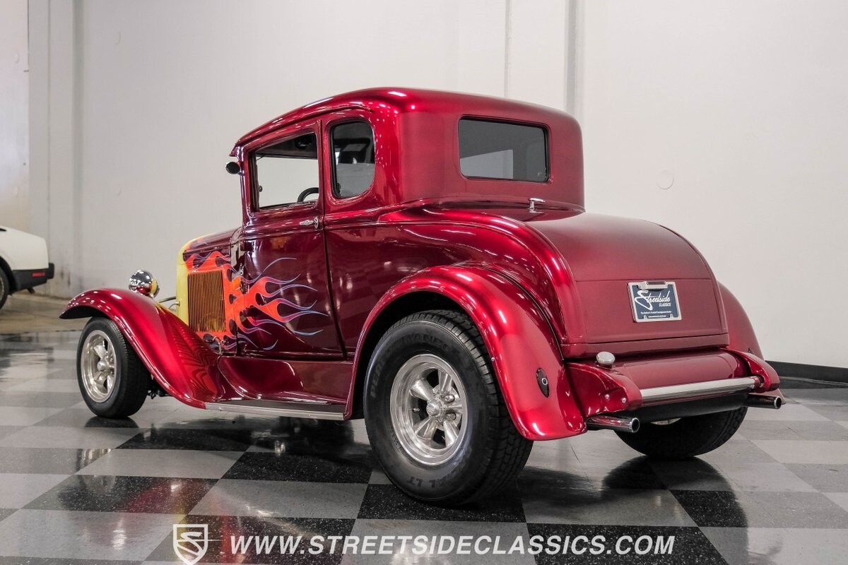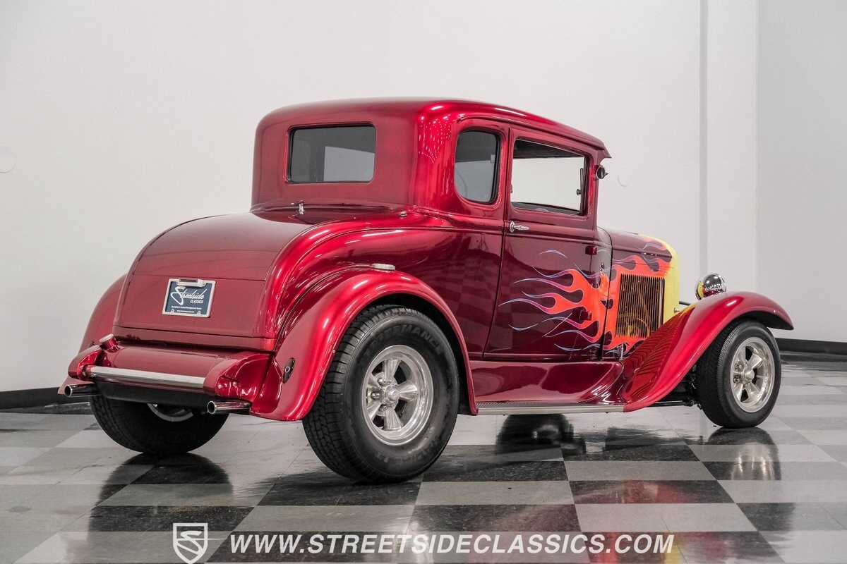 This 1931 Ford 5-Window Rumble Seat Coupe grabs attention with its Candy Apple Red Metallic paint and custom airbrushed flames. The all-steel body sits low on a custom chassis, sporting 14" American Racing wheels up front and 15" in the rear. Nitto 175/65R14 tires lead the charge, with beefy 265/70R15 "Performance Radial LT" rubber in back. Chrome accents and engine louvers add classic hot rod flair, while the functional rumble seat offers a unique throwback feature.