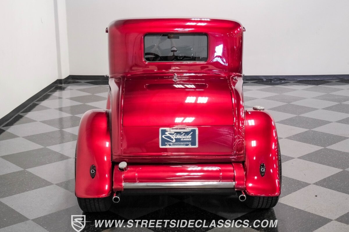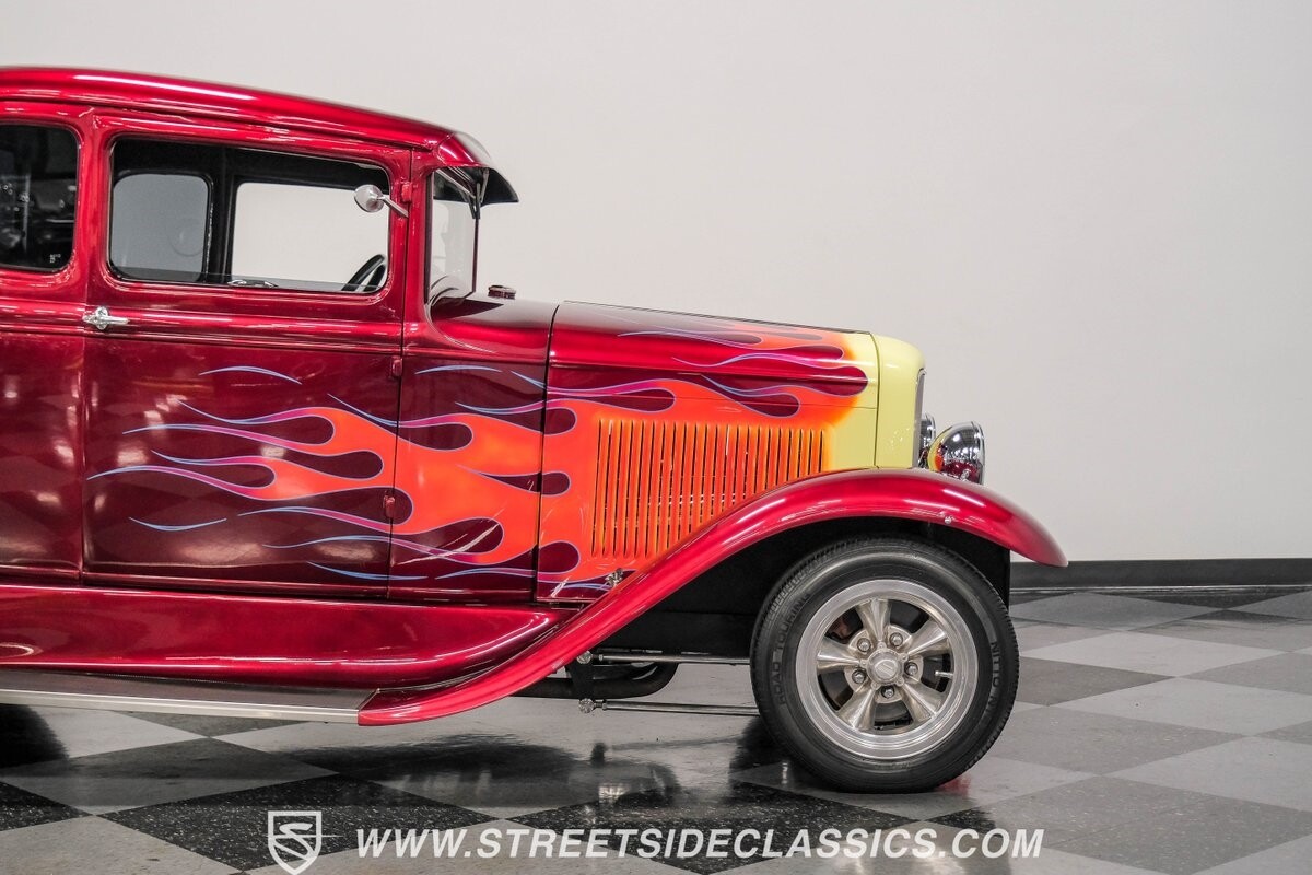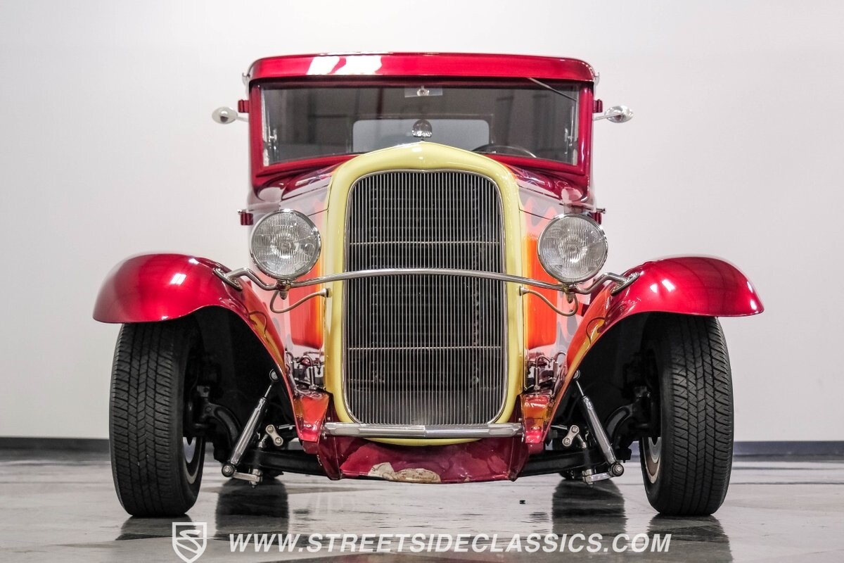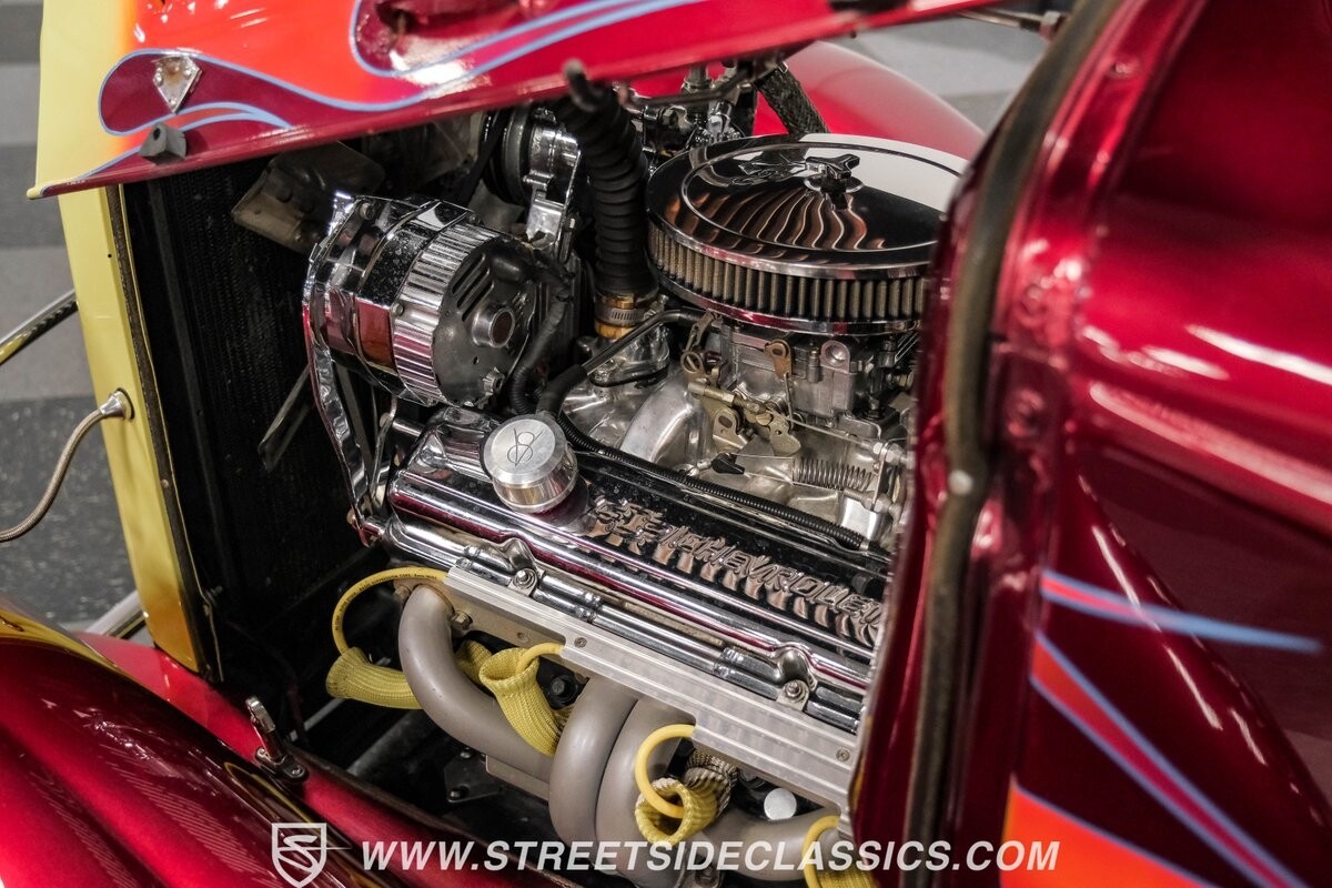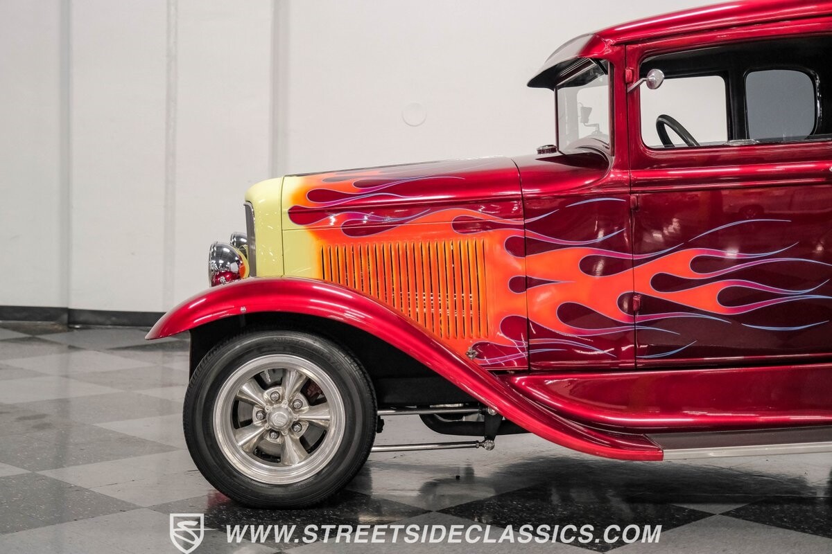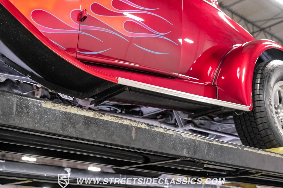 This 1931 Ford 5-Window Rumble Seat Coupe grabs attention with its Candy Apple Red Metallic paint and custom airbrushed flames. The all-steel body sits low on a custom chassis, sporting 14" American Racing wheels up front and 15" in the rear. Nitto 175/65R14 tires lead the charge, with beefy 265/70R15 "Performance Radial LT" rubber in back. Chrome accents and engine louvers add classic hot rod flair, while the functional rumble seat offers a unique throwback feature.