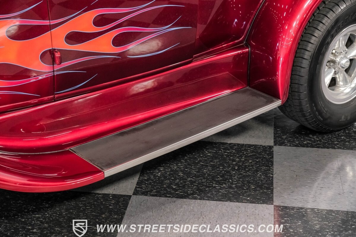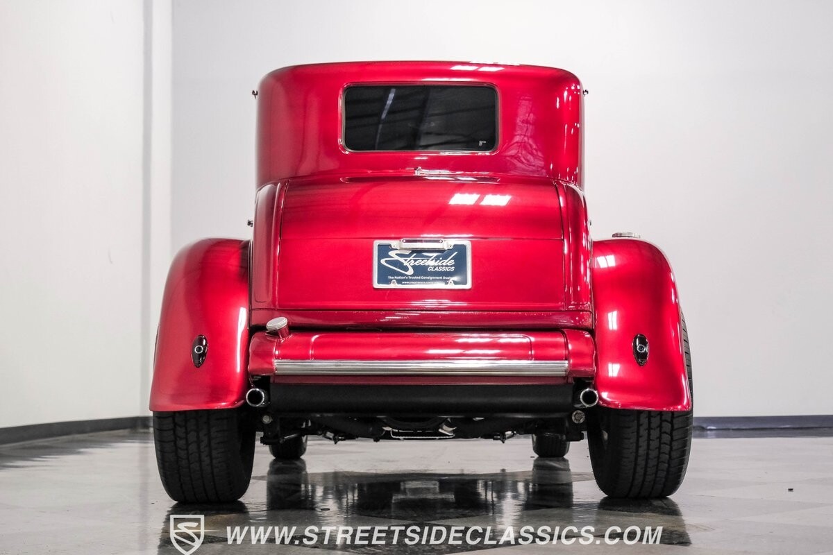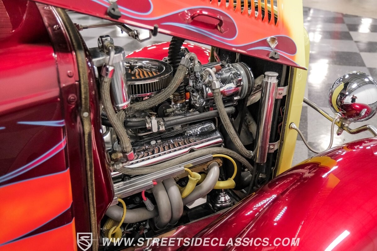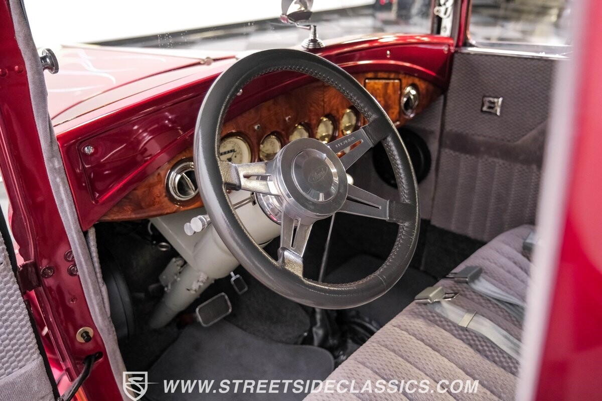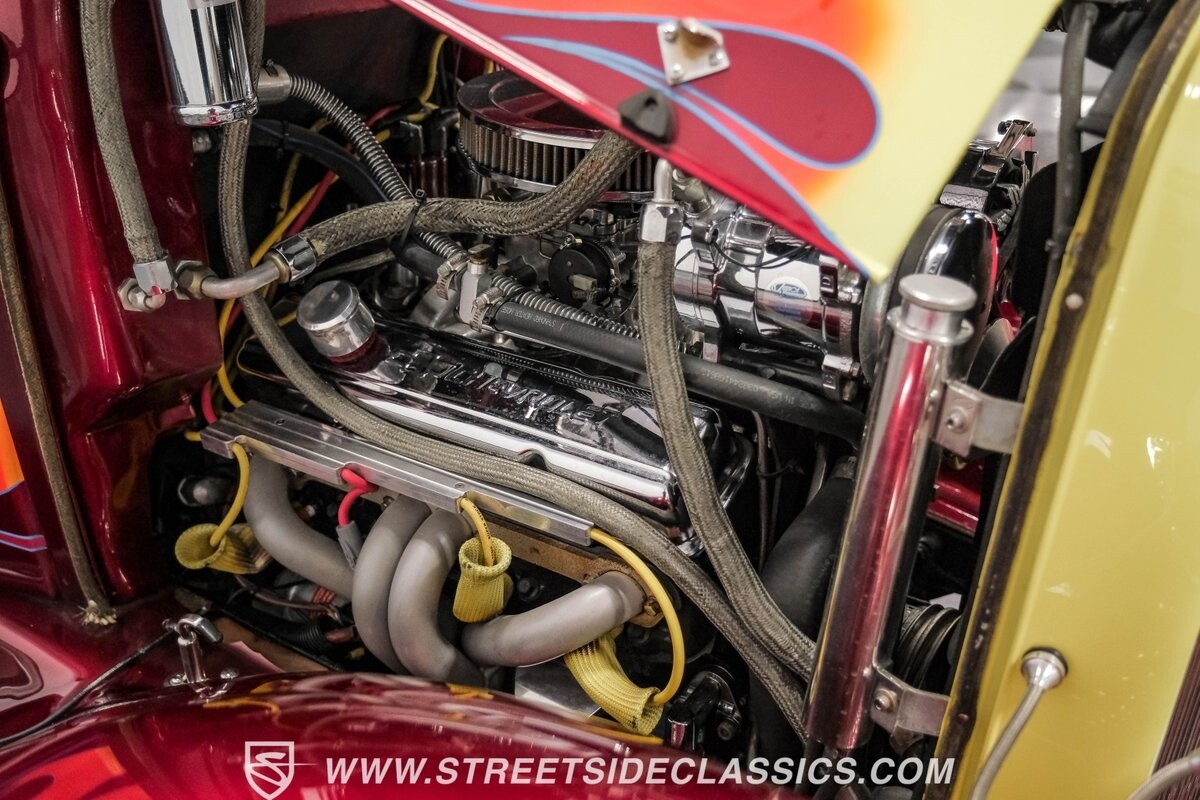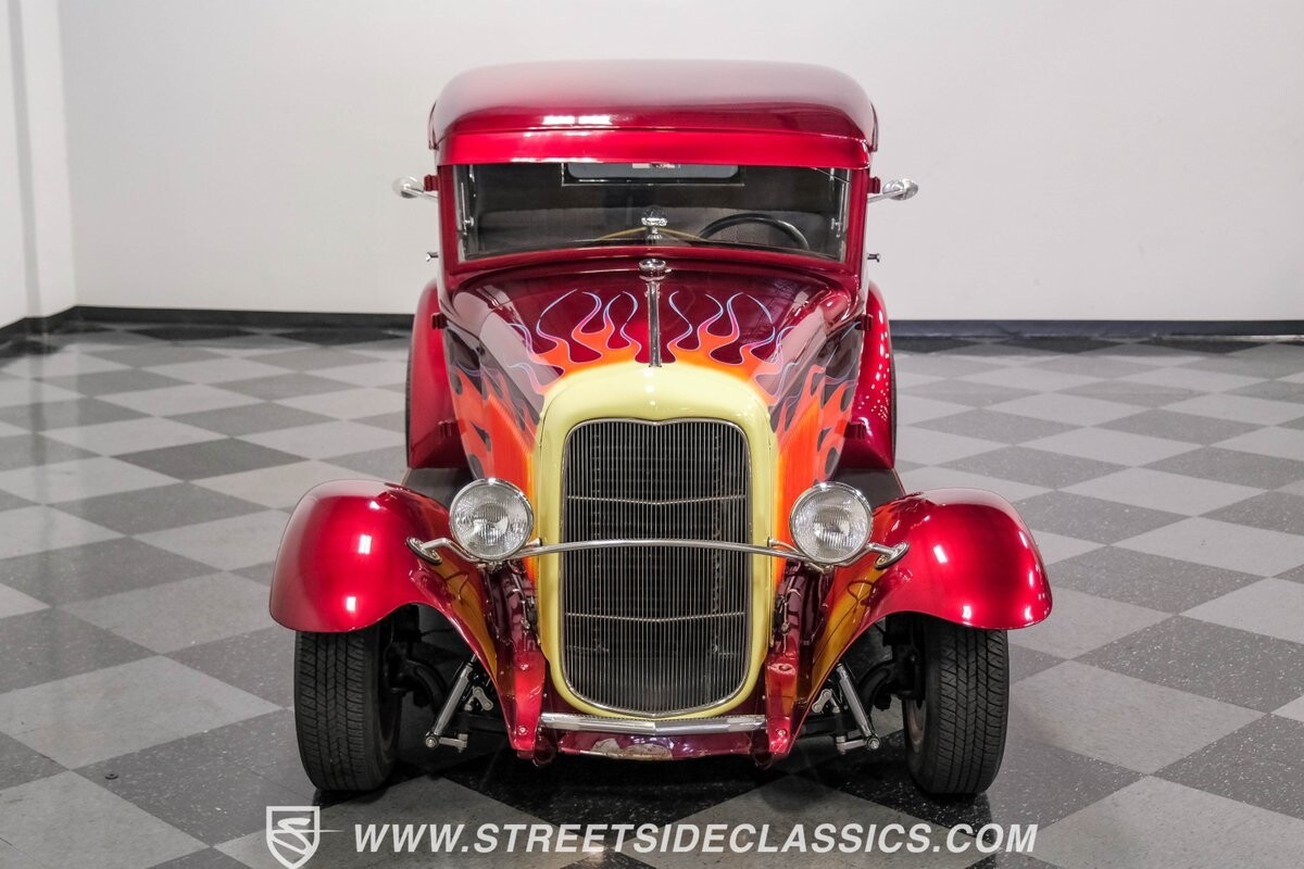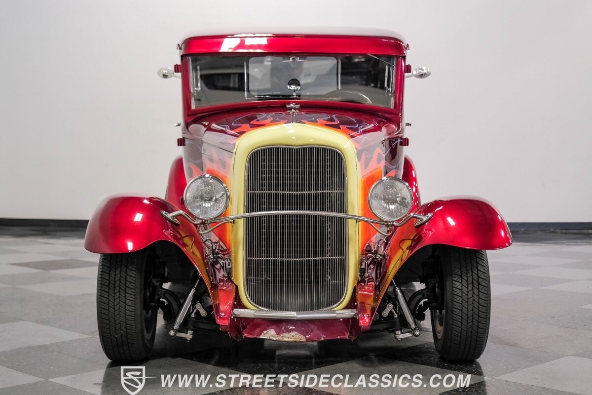This 1931 Ford 5-Window Rumble Seat Coupe grabs attention with its Candy Apple Red Metallic paint and custom airbrushed flames. The all-steel body sits low on a custom chassis, sporting 14" American Racing wheels up front and 15" in the rear. Nitto 175/65R14 tires lead the charge, with beefy 265/70R15 "Performance Radial LT" rubber in back. Chrome accents and engine louvers add classic hot rod flair, while the functional rumble seat offers a unique throwback feature.