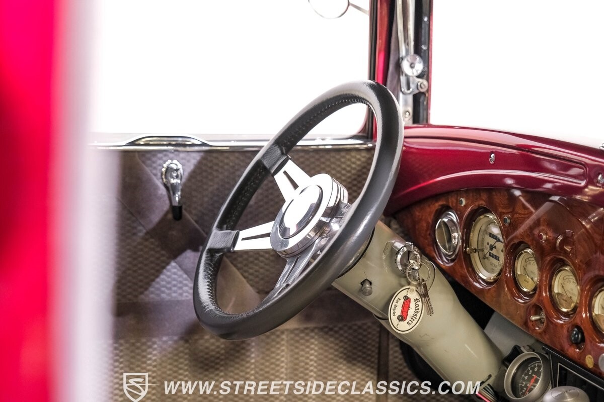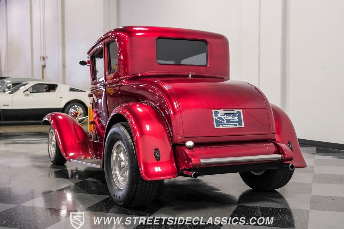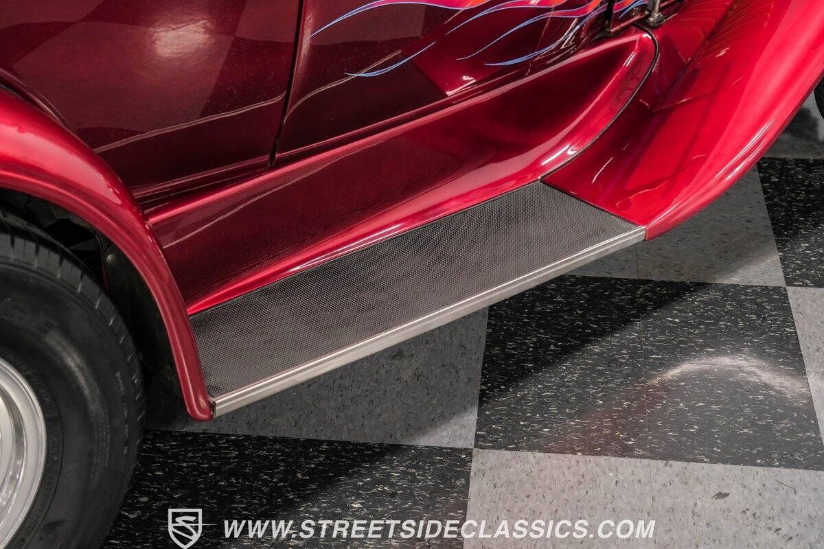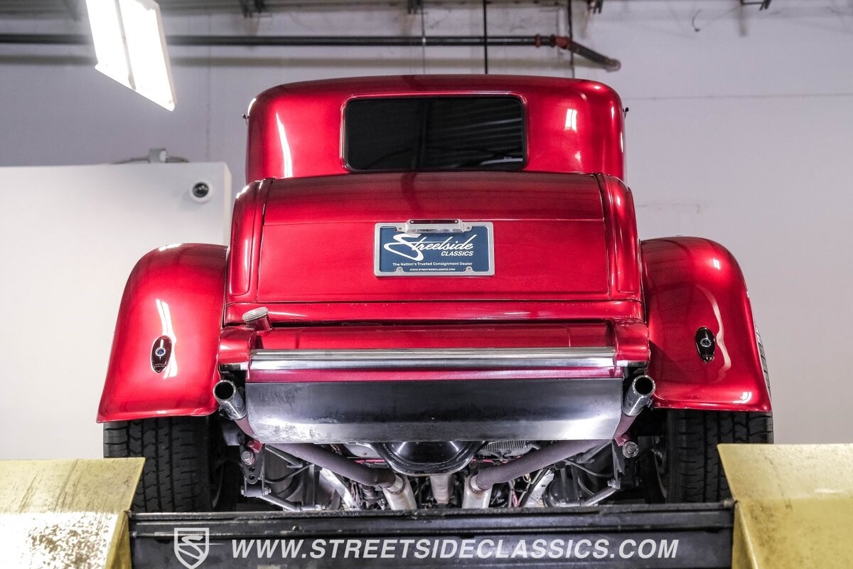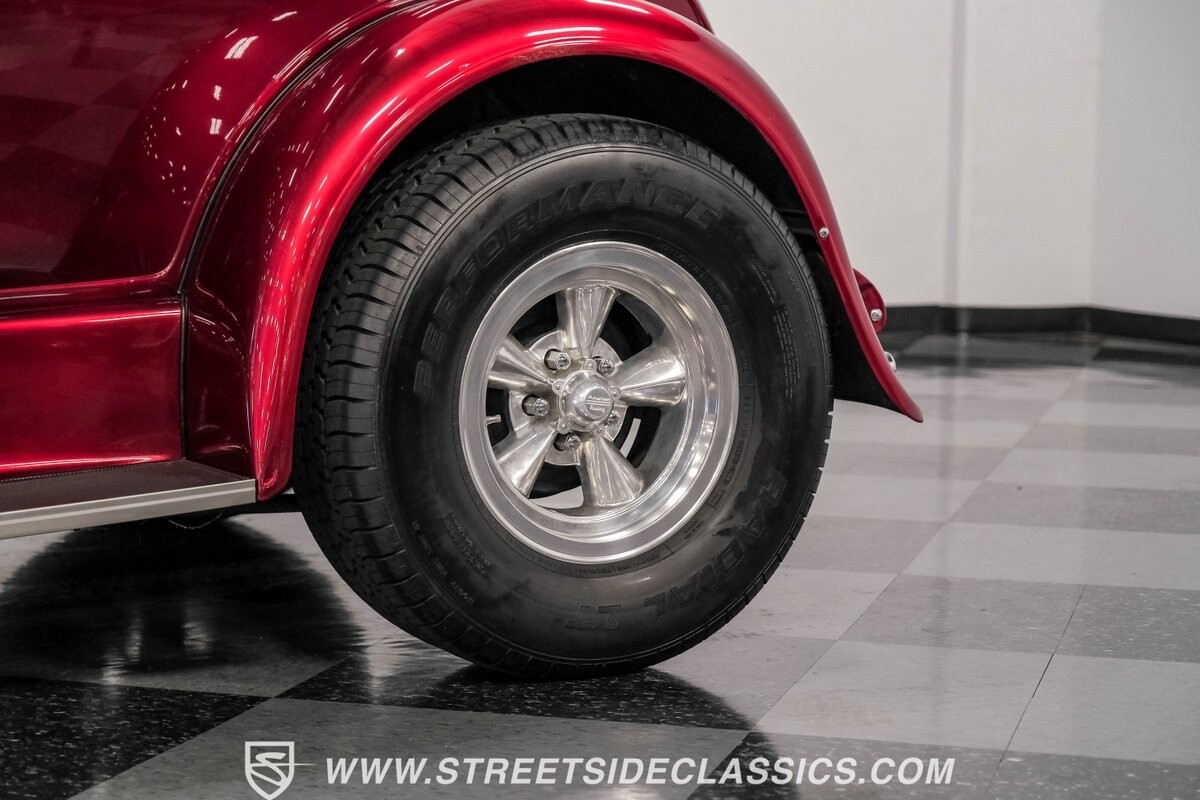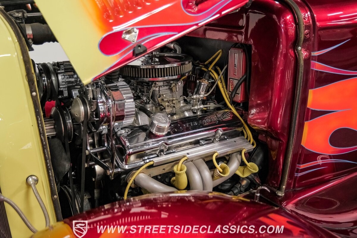 This 1931 Ford 5-Window Rumble Seat Coupe grabs attention with its Candy Apple Red Metallic paint and custom airbrushed flames. The all-steel body sits low on a custom chassis, sporting 14" American Racing wheels up front and 15" in the rear. Nitto 175/65R14 tires lead the charge, with beefy 265/70R15 "Performance Radial LT" rubber in back. Chrome accents and engine louvers add classic hot rod flair, while the functional rumble seat offers a unique throwback feature.
