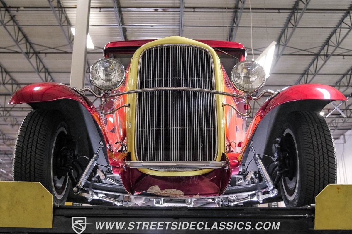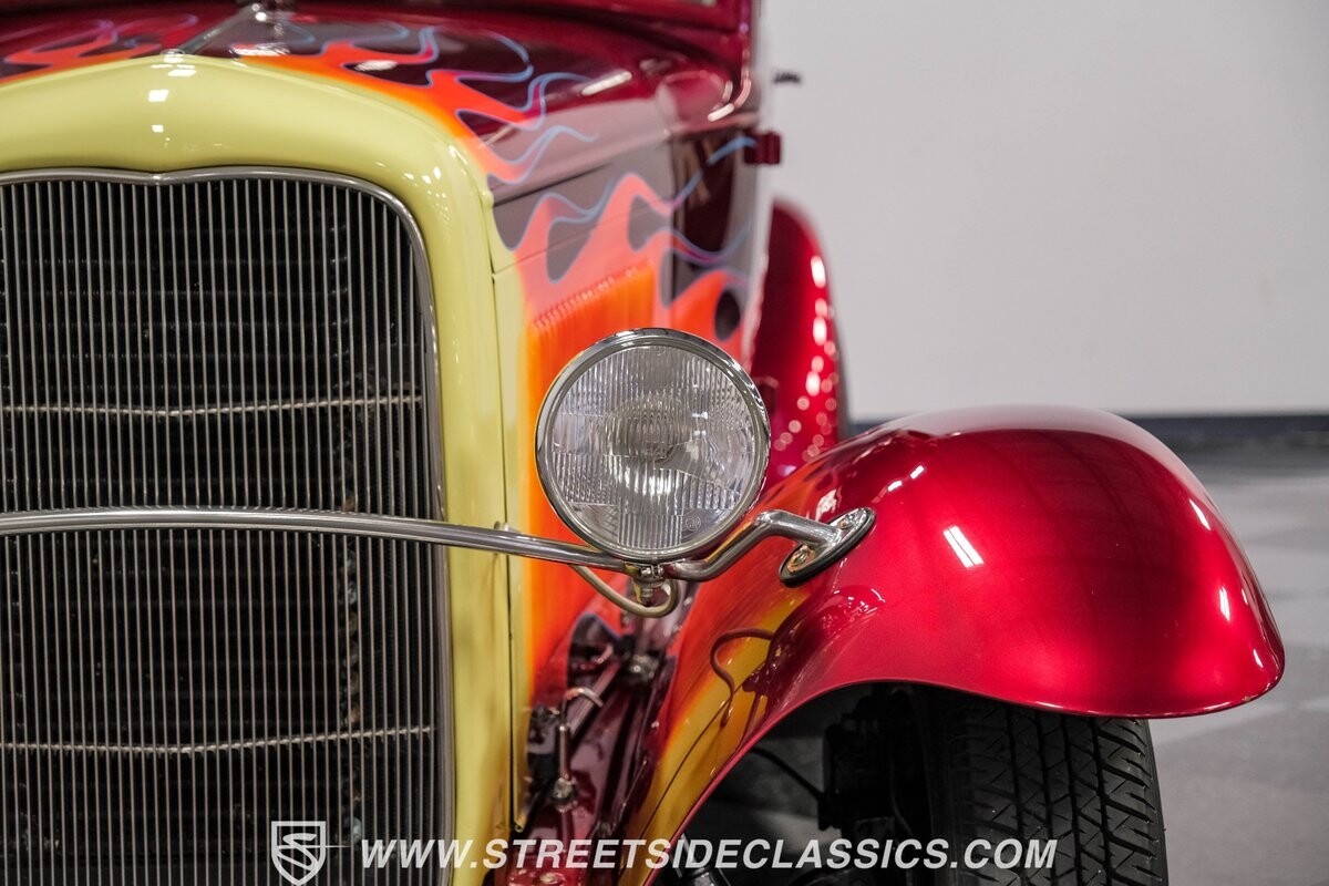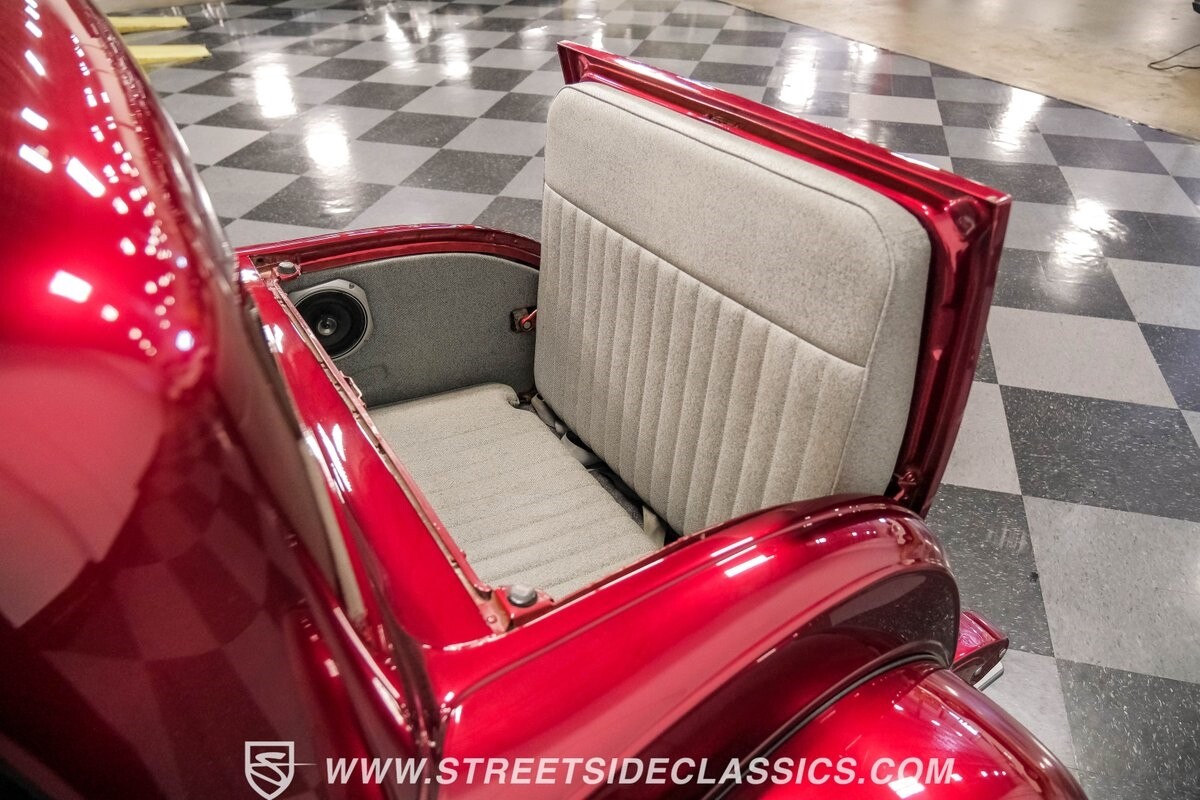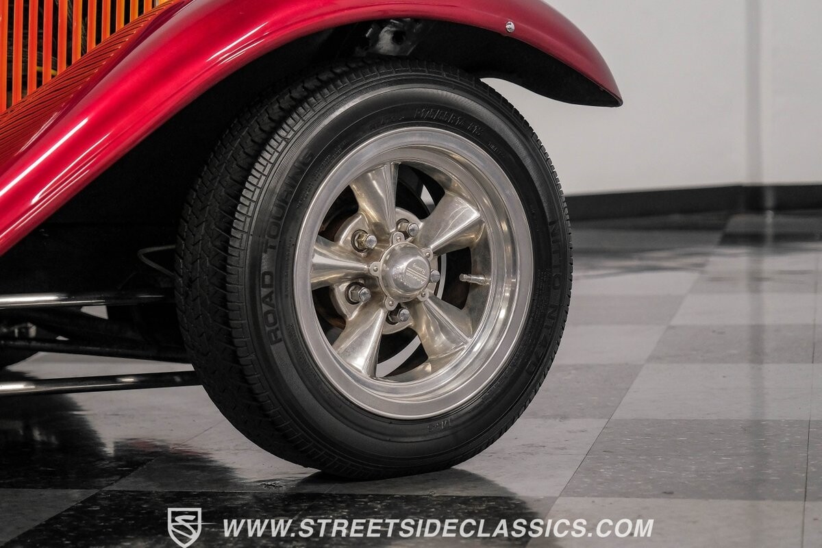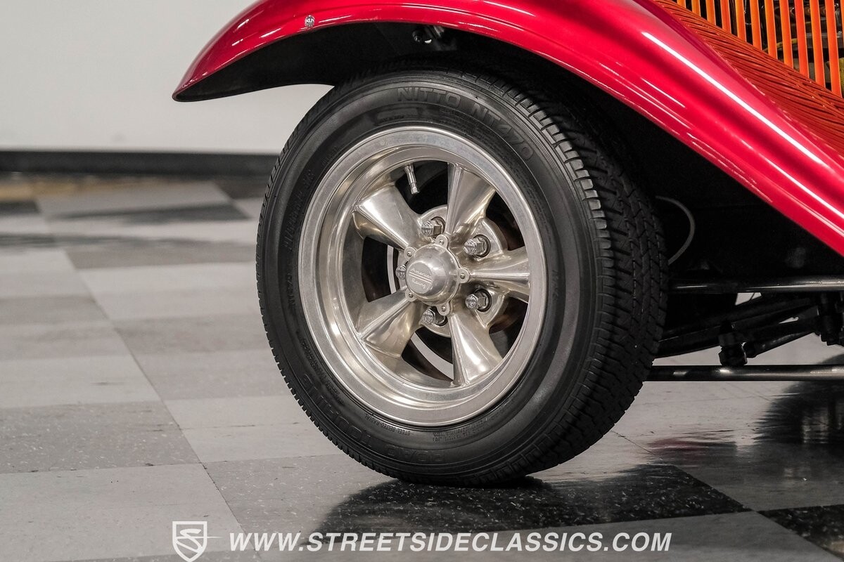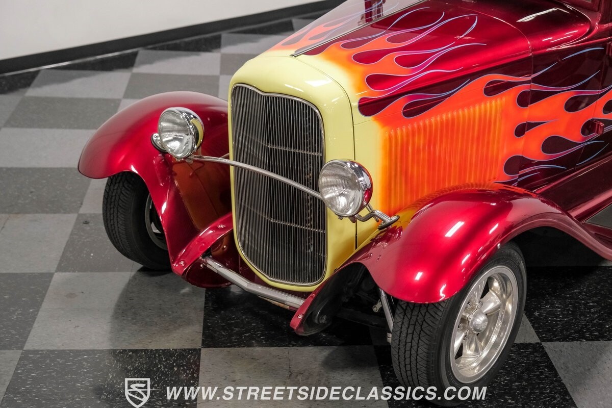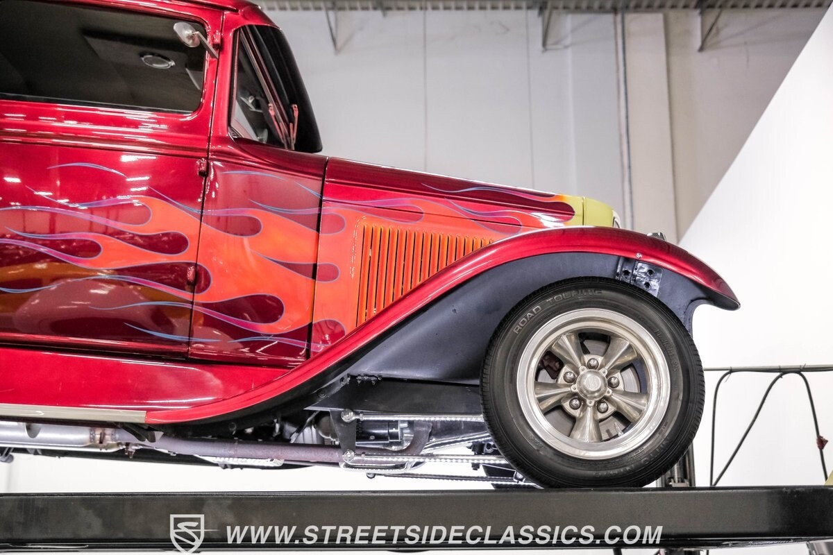 This 1931 Ford 5-Window Rumble Seat Coupe grabs attention with its Candy Apple Red Metallic paint and custom airbrushed flames. The all-steel body sits low on a custom chassis, sporting 14" American Racing wheels up front and 15" in the rear. Nitto 175/65R14 tires lead the charge, with beefy 265/70R15 "Performance Radial LT" rubber in back. Chrome accents and engine louvers add classic hot rod flair, while the functional rumble seat offers a unique throwback feature.