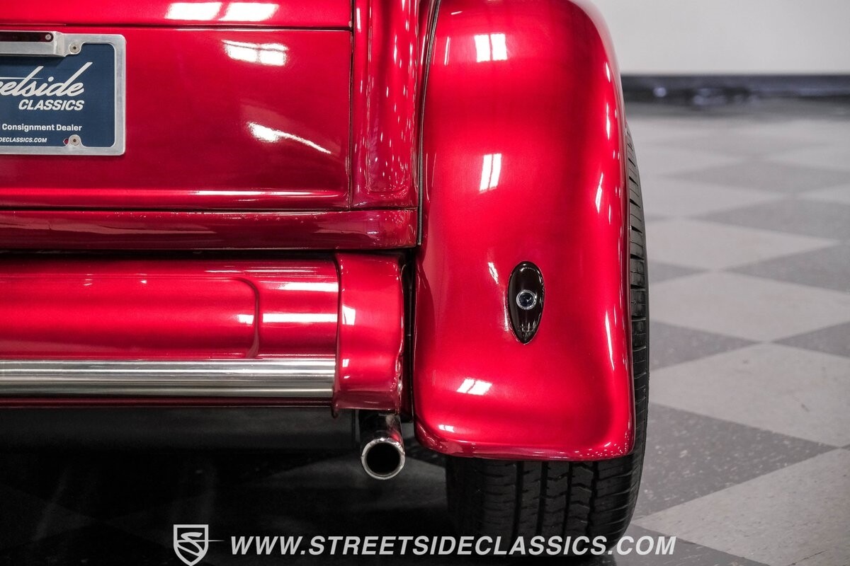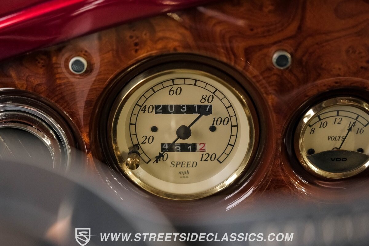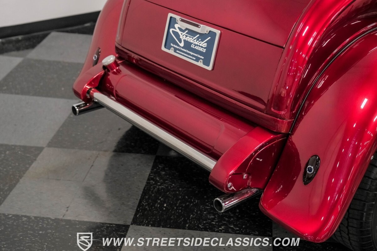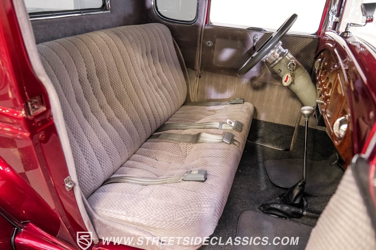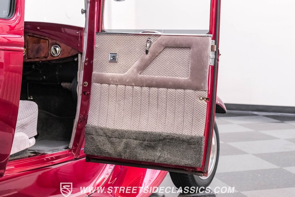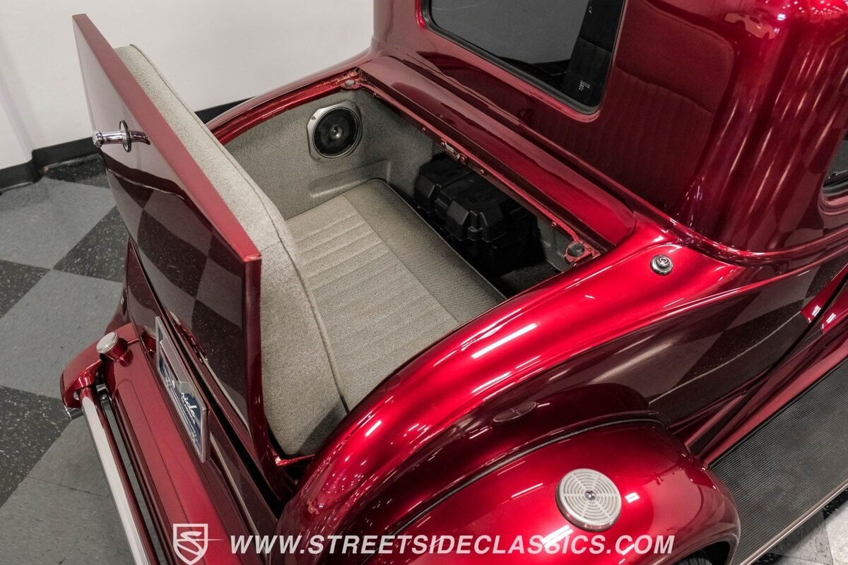 This 1931 Ford 5-Window Rumble Seat Coupe grabs attention with its Candy Apple Red Metallic paint and custom airbrushed flames. The all-steel body sits low on a custom chassis, sporting 14" American Racing wheels up front and 15" in the rear. Nitto 175/65R14 tires lead the charge, with beefy 265/70R15 "Performance Radial LT" rubber in back. Chrome accents and engine louvers add classic hot rod flair, while the functional rumble seat offers a unique throwback feature.