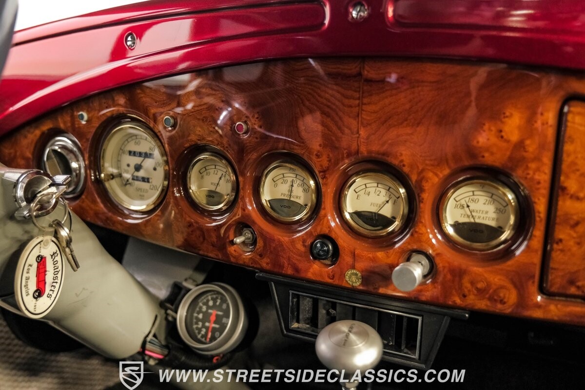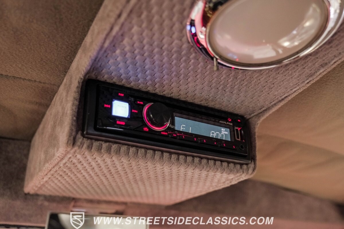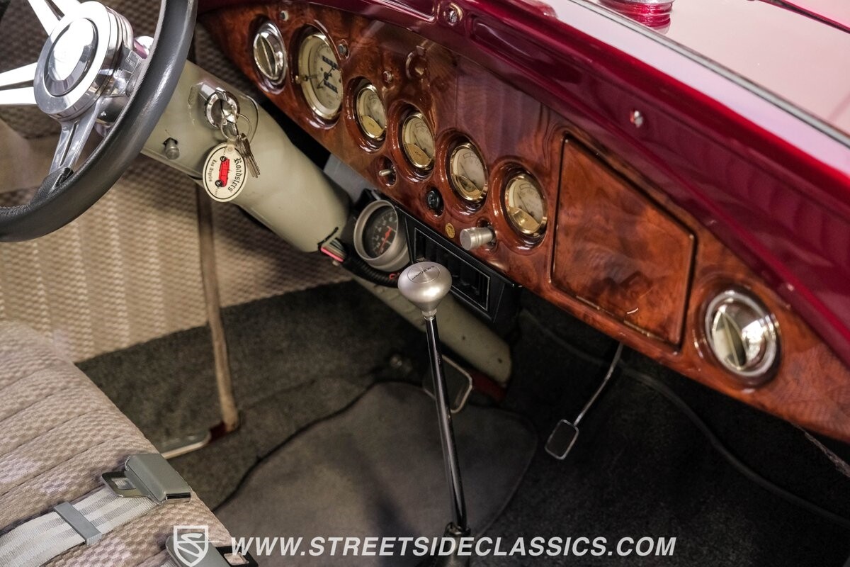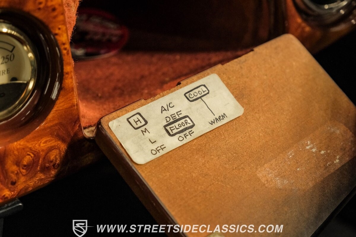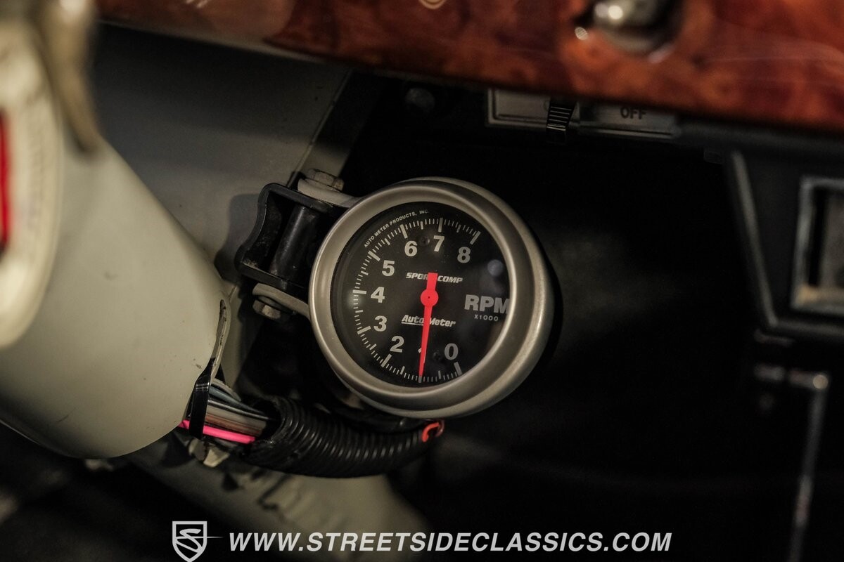 Inside, custom gray cloth wraps the bench seat, complemented by a wood dash insert housing VDO classic gauges. The Lecarra steering wheel sits atop a tilt column, with an Auto Meter tach keeping tabs on engine revs. A custom overhead console houses the Alpine stereo system, while power windows and AC vents integrated into the dash blend modern comfort with vintage style. The Lokar shifter stands ready to command the transmission.
