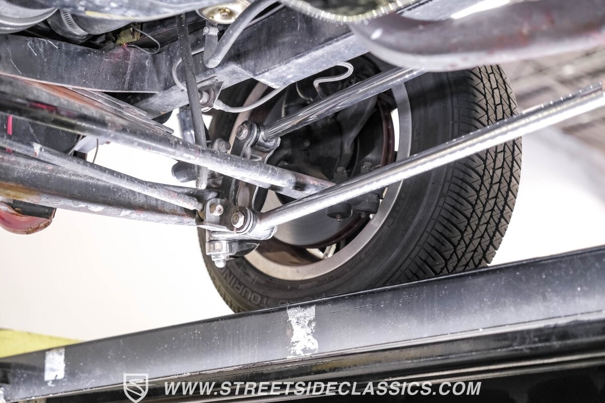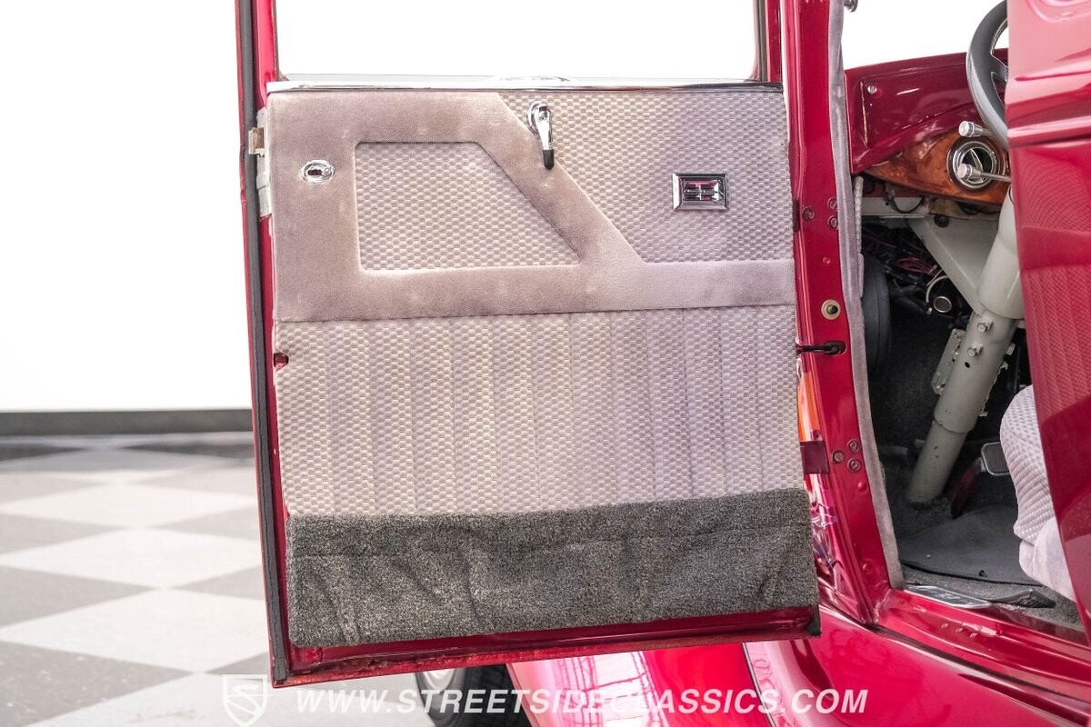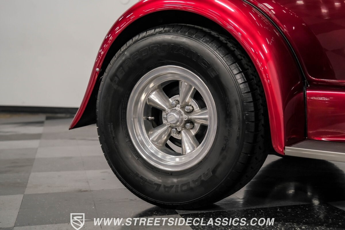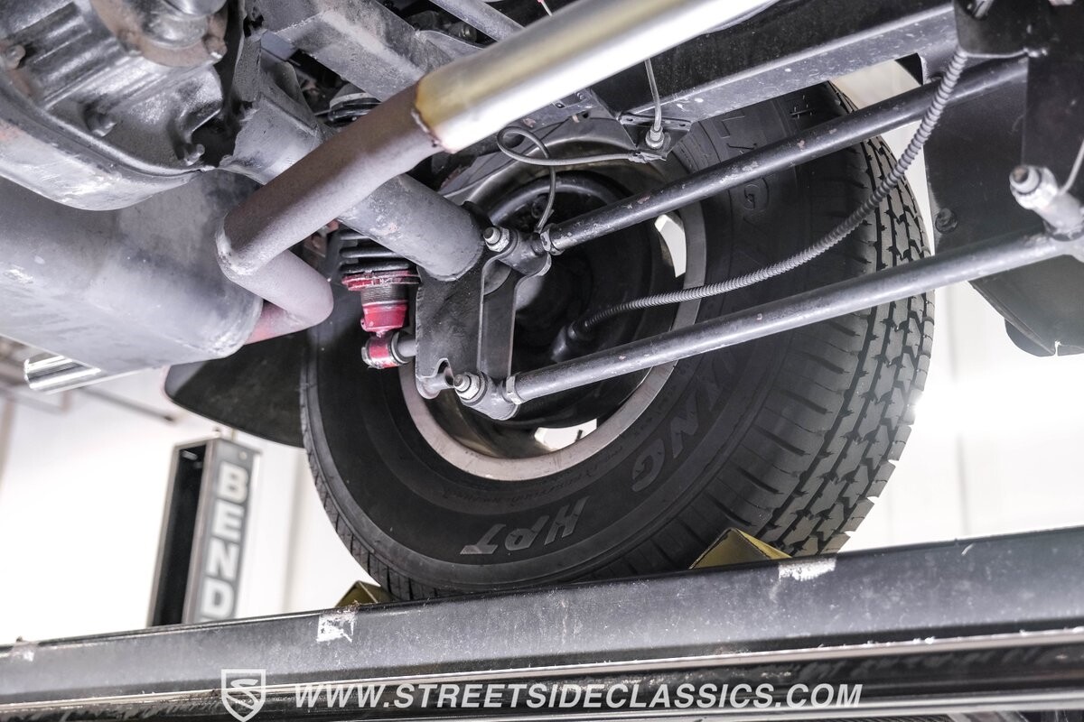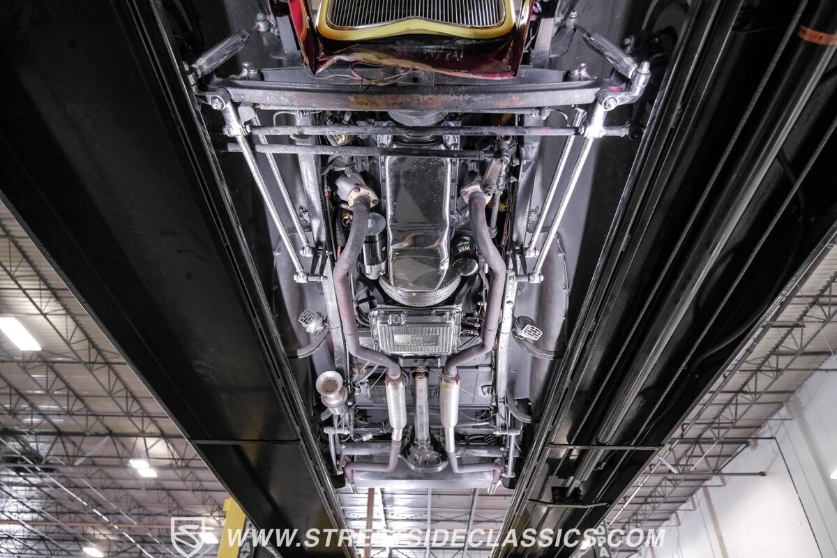 Open the hood to reveal a 350 V8 crate engine, breathing through a 4-barrel carburetor and shorty headers. The TH350 3-speed automatic transmission puts power to a Ford 9-inch rear end. A mono-leaf spring front suspension pairs with a 4-link and coilover setup in back for improved handling. Disc brakes up front provide reliable stopping power, while the dual exhaust with glasspack-style mufflers delivers a proper hot rod rumble.