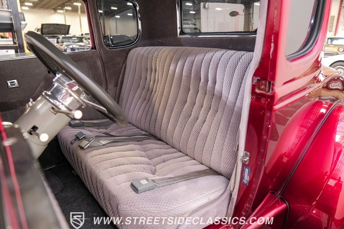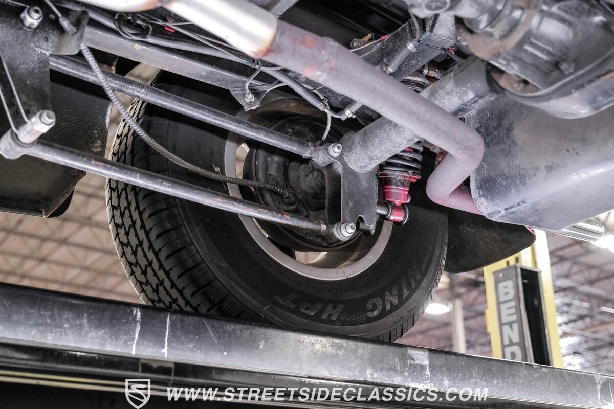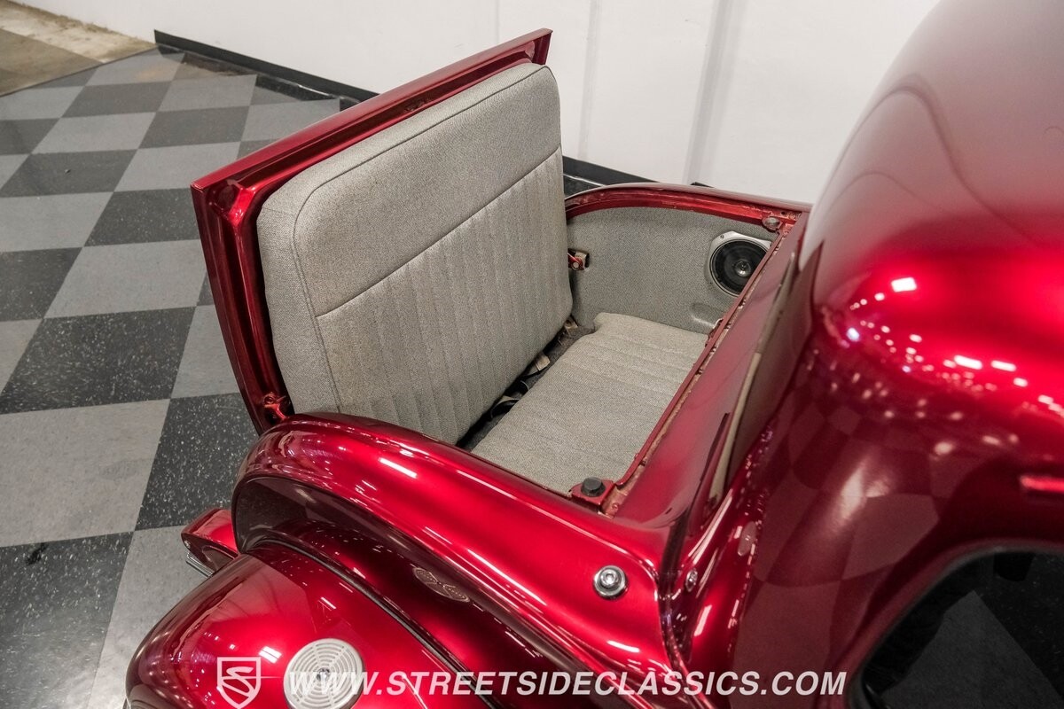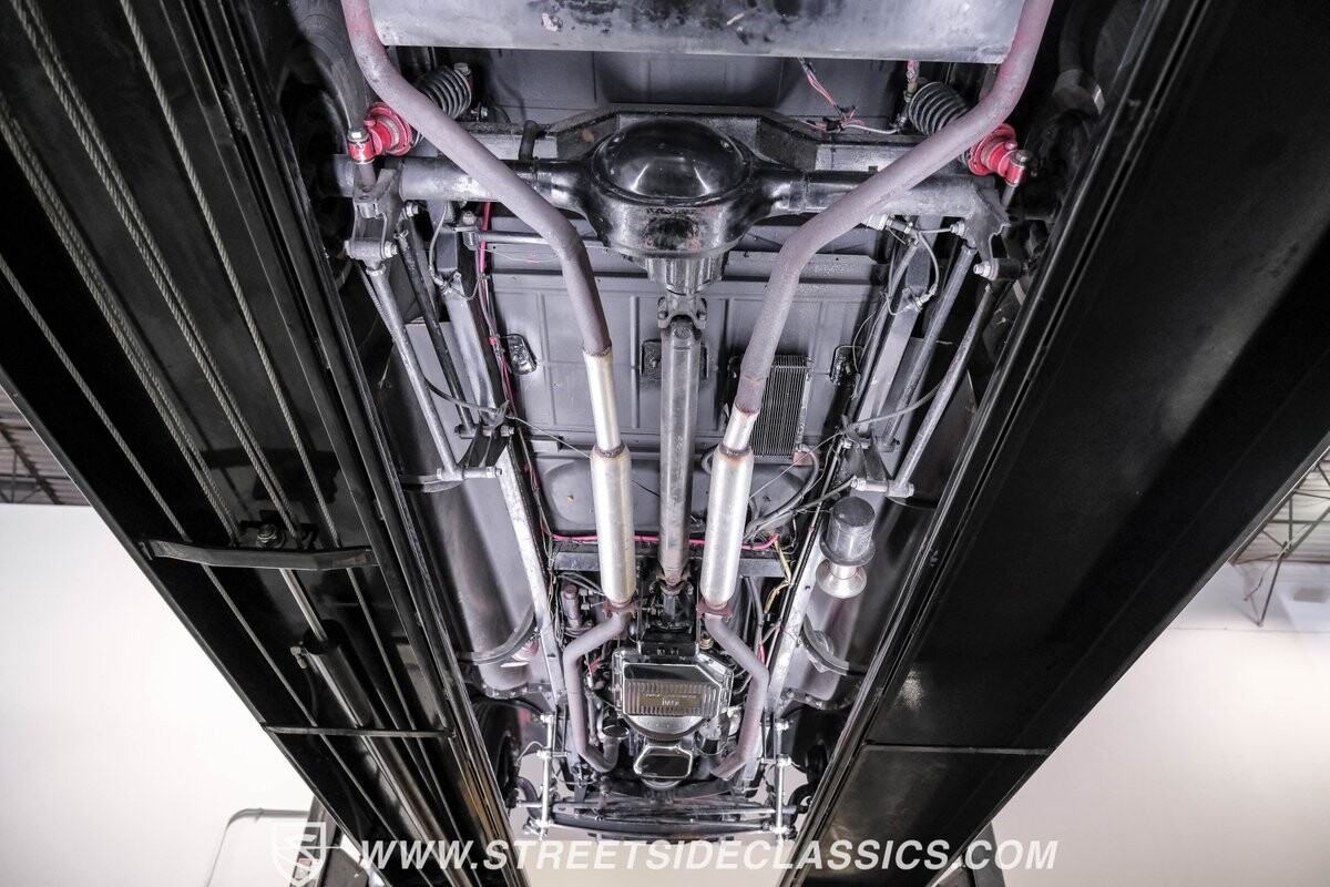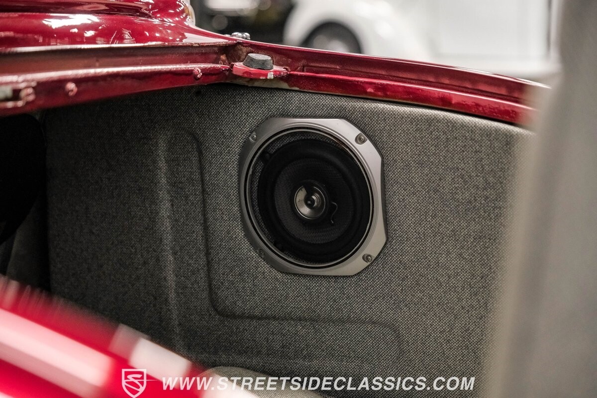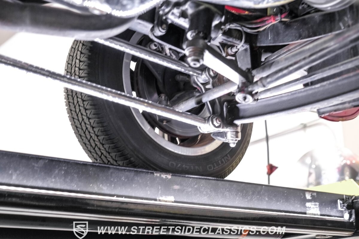 Open the hood to reveal a 350 V8 crate engine, breathing through a 4-barrel carburetor and shorty headers. The TH350 3-speed automatic transmission puts power to a Ford 9-inch rear end. A mono-leaf spring front suspension pairs with a 4-link and coilover setup in back for improved handling. Disc brakes up front provide reliable stopping power, while the dual exhaust with glasspack-style mufflers delivers a proper hot rod rumble.