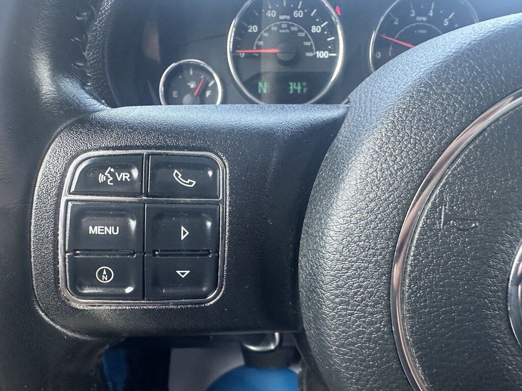 -One Owner CarFax-, Clean CarFax, 17 x 7.5 Aluminum Wheels, 4-Wheel Disc Brakes, 6 Speakers, ABS brakes, Air Conditioning, AM/FM radio, Anti-Spin Differential Rear Axle, Black 3-Piece Hard Top, Brake assist, CD player, Cloth Bucket Seats, Compass, Connectivity Group, Deep Tint Sunscreen Windows, Driver door bin, Driver vanity mirror, Electronic Stability Control, Freedom Panel Storage Bag, Front 1-Touch Down Power Windows, Front Bucket Seats, Front Center Armrest w/Storage, Front fog lights, Leather Wrapped Steering Wheel, Low tire pressure warning, Outside temperature display, Passenger door bin, Passenger vanity mirror, Power Convenience Group, Power Heated Mirrors, Power Locks, Power steering, Quick Order Package 24S, Radio: Uconnect 130 CD/MP3, Rear Window Defroster, Rear Window Wiper/Washer, Remote Keyless Entry, Remote USB Port, Security Alarm, SIRIUS Satellite Radio, Speed control, Steering wheel mounted audio controls, Tachometer, Tilt steering wheel, Tinted Rear Quarter & Liftgate Windows, Traction control, Trailer Sway Damping, Trip computer, Tubular Side Steps, Uconnect Voice Command w/Bluetooth, Variably intermittent wipers, Vehicle Information Center.