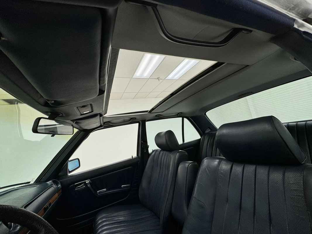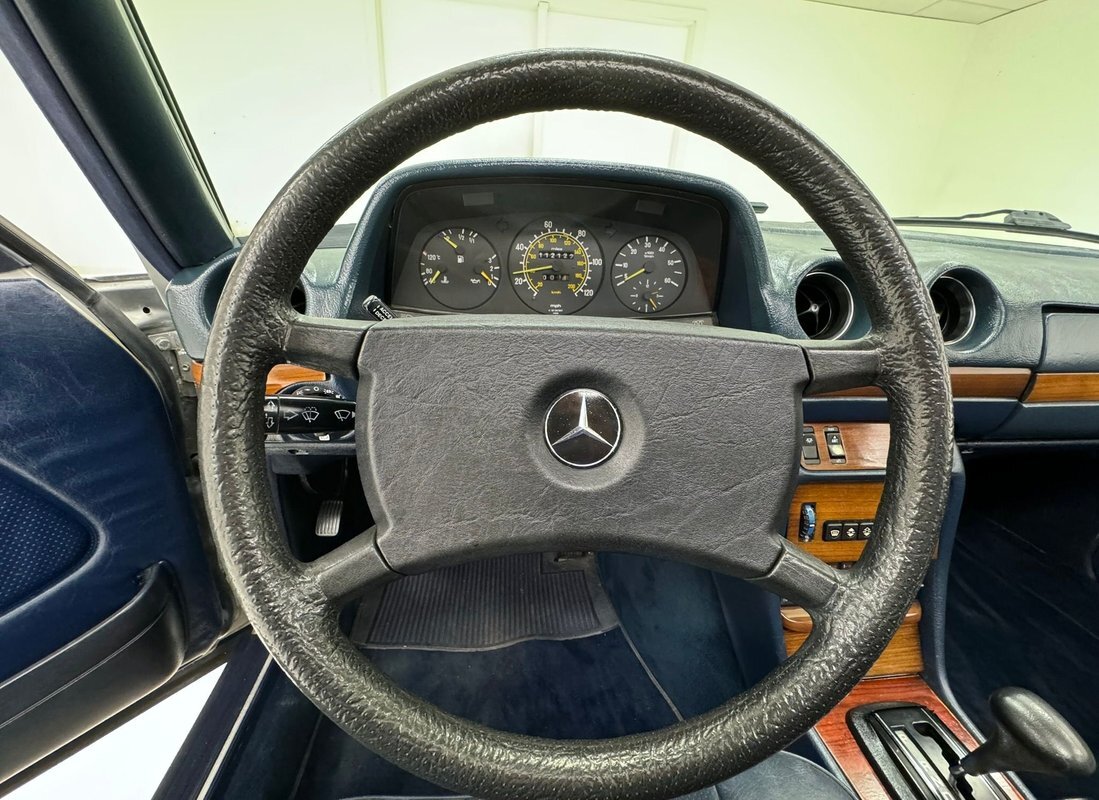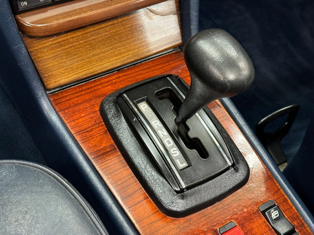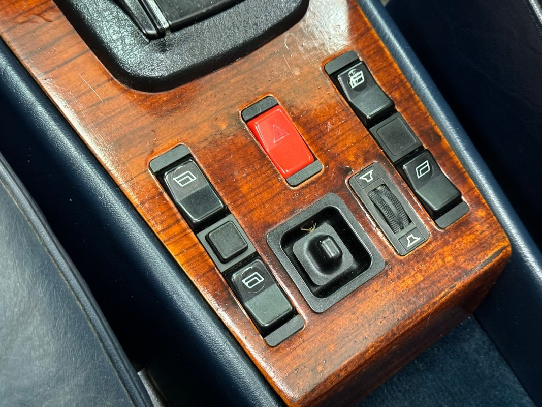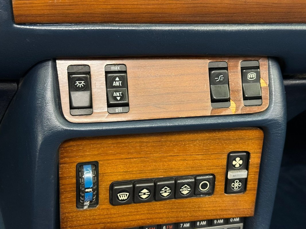 MB Tex and leather in dark blue and in very nice, gently used condition covers the bucket seats in front and bench seat in back. Immaculate dark blue carpeting covers all the lower surfaces. A very nice dash and center console house all correct working gauges, and climate controls, and some burl veneer is seen mixing in with the blue vinyl coverings of the console. Very slight cracks are noted on this burl lacquer. The fully working AM/FM/Cassette radio is nestled between the dash, and console. The glovebox door is slightly out of alignment, but this is really the only major fault that can be noticed when picking through with a fine-tooth comb.