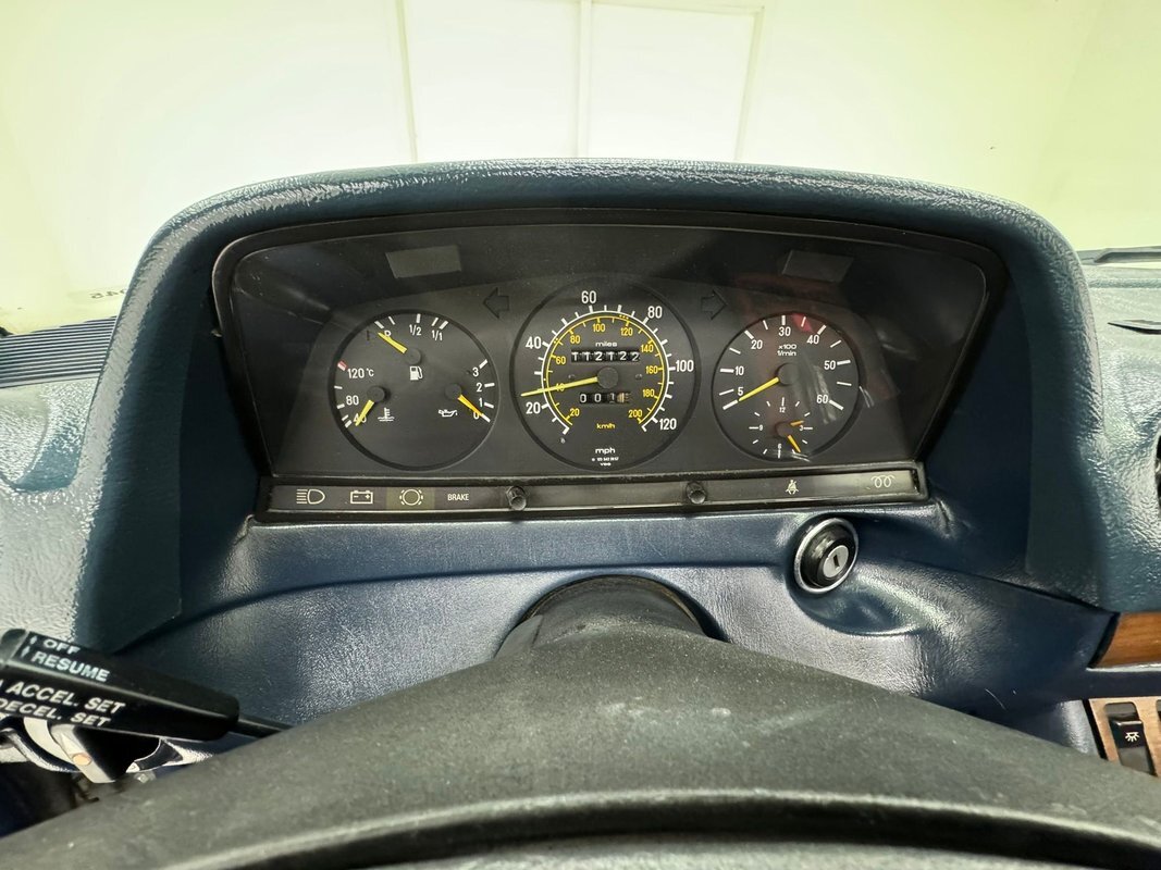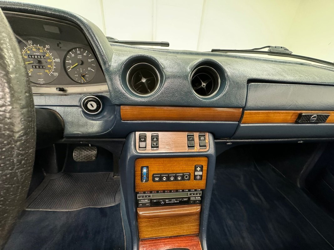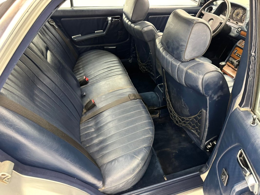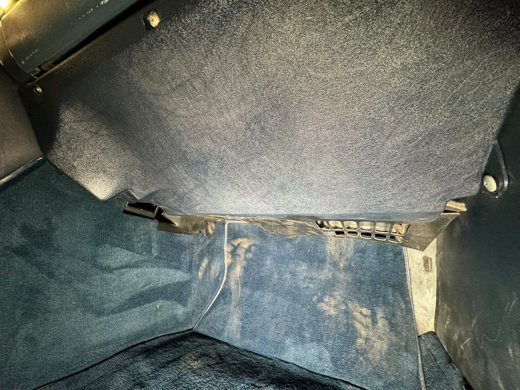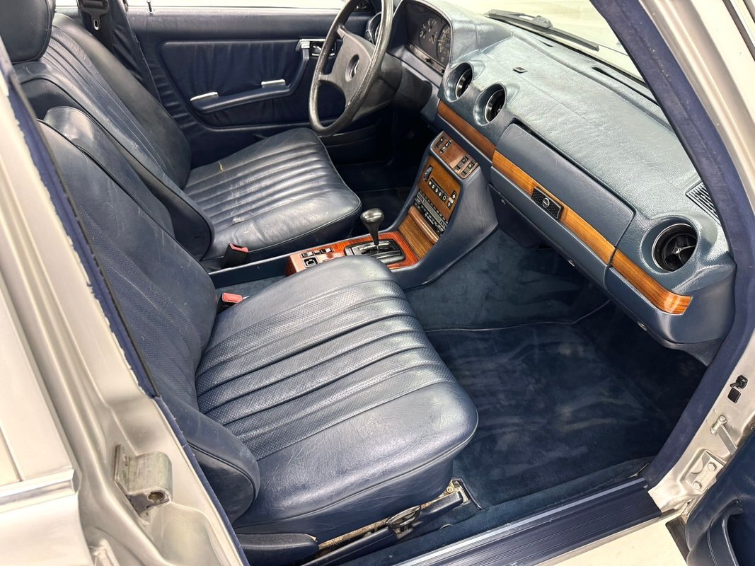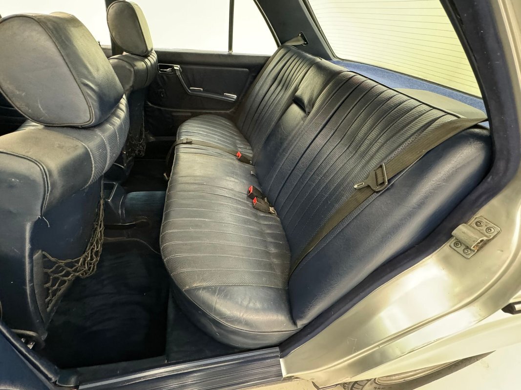 MB Tex and leather in dark blue and in very nice, gently used condition covers the bucket seats in front and bench seat in back. Immaculate dark blue carpeting covers all the lower surfaces. A very nice dash and center console house all correct working gauges, and climate controls, and some burl veneer is seen mixing in with the blue vinyl coverings of the console. Very slight cracks are noted on this burl lacquer. The fully working AM/FM/Cassette radio is nestled between the dash, and console. The glovebox door is slightly out of alignment, but this is really the only major fault that can be noticed when picking through with a fine-tooth comb.