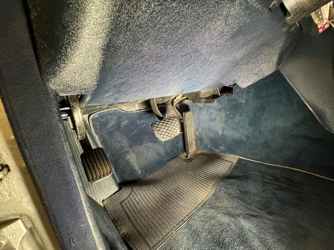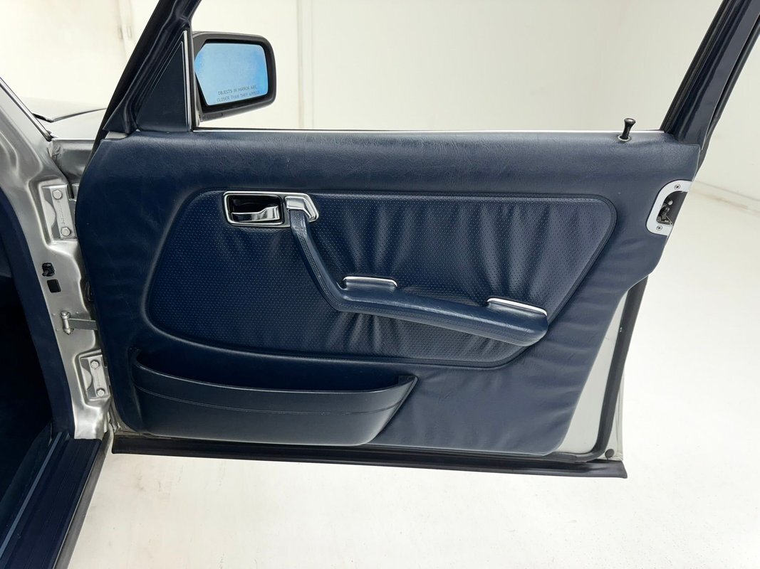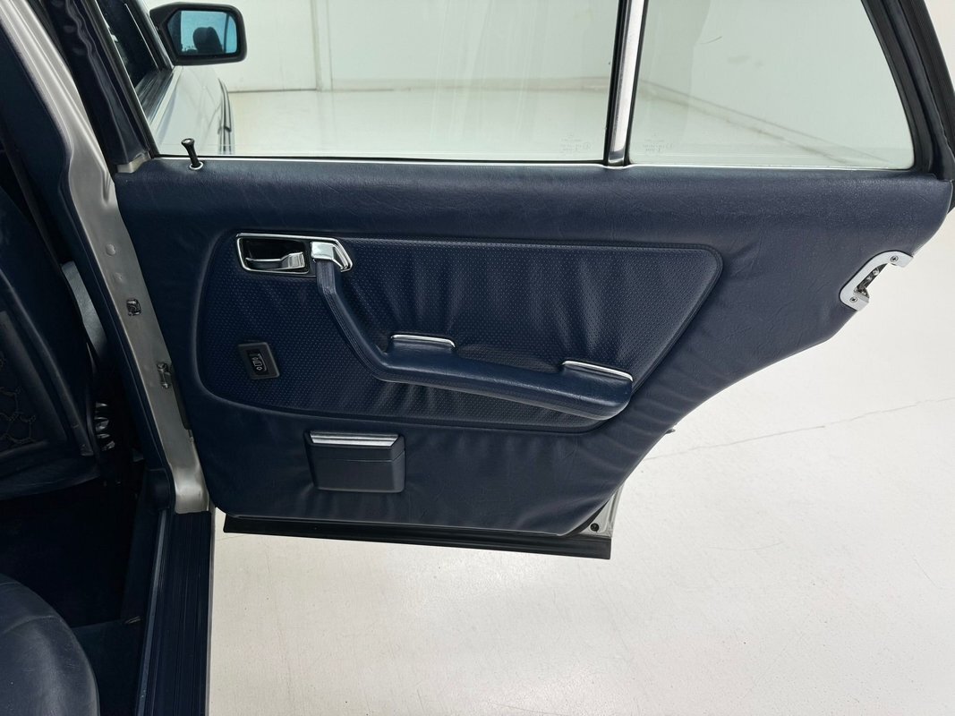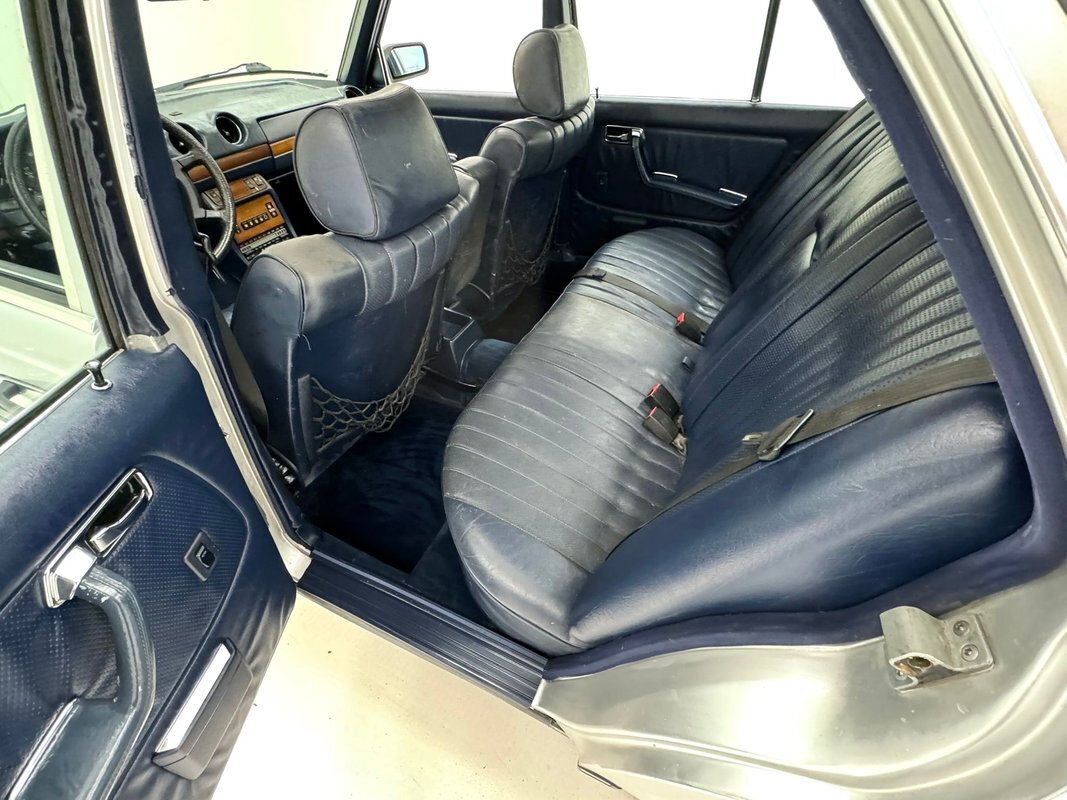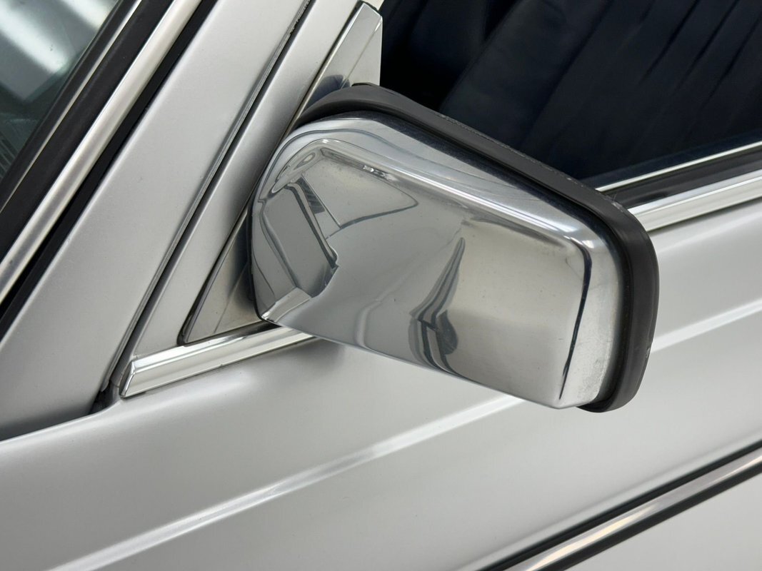MB Tex and leather in dark blue and in very nice, gently used condition covers the bucket seats in front and bench seat in back. Immaculate dark blue carpeting covers all the lower surfaces. A very nice dash and center console house all correct working gauges, and climate controls, and some burl veneer is seen mixing in with the blue vinyl coverings of the console. Very slight cracks are noted on this burl lacquer. The fully working AM/FM/Cassette radio is nestled between the dash, and console. The glovebox door is slightly out of alignment, but this is really the only major fault that can be noticed when picking through with a fine-tooth comb.