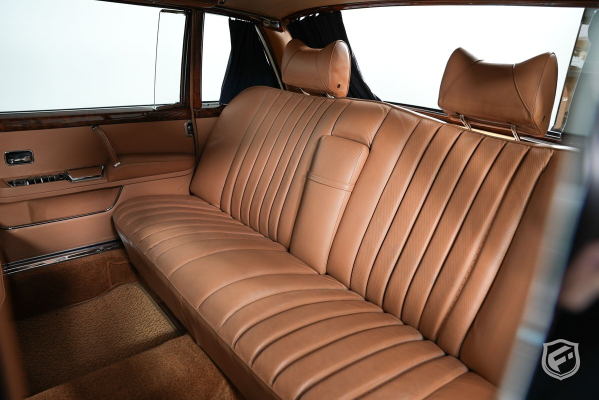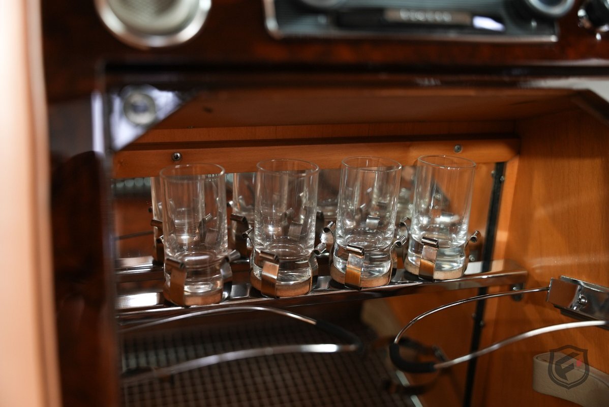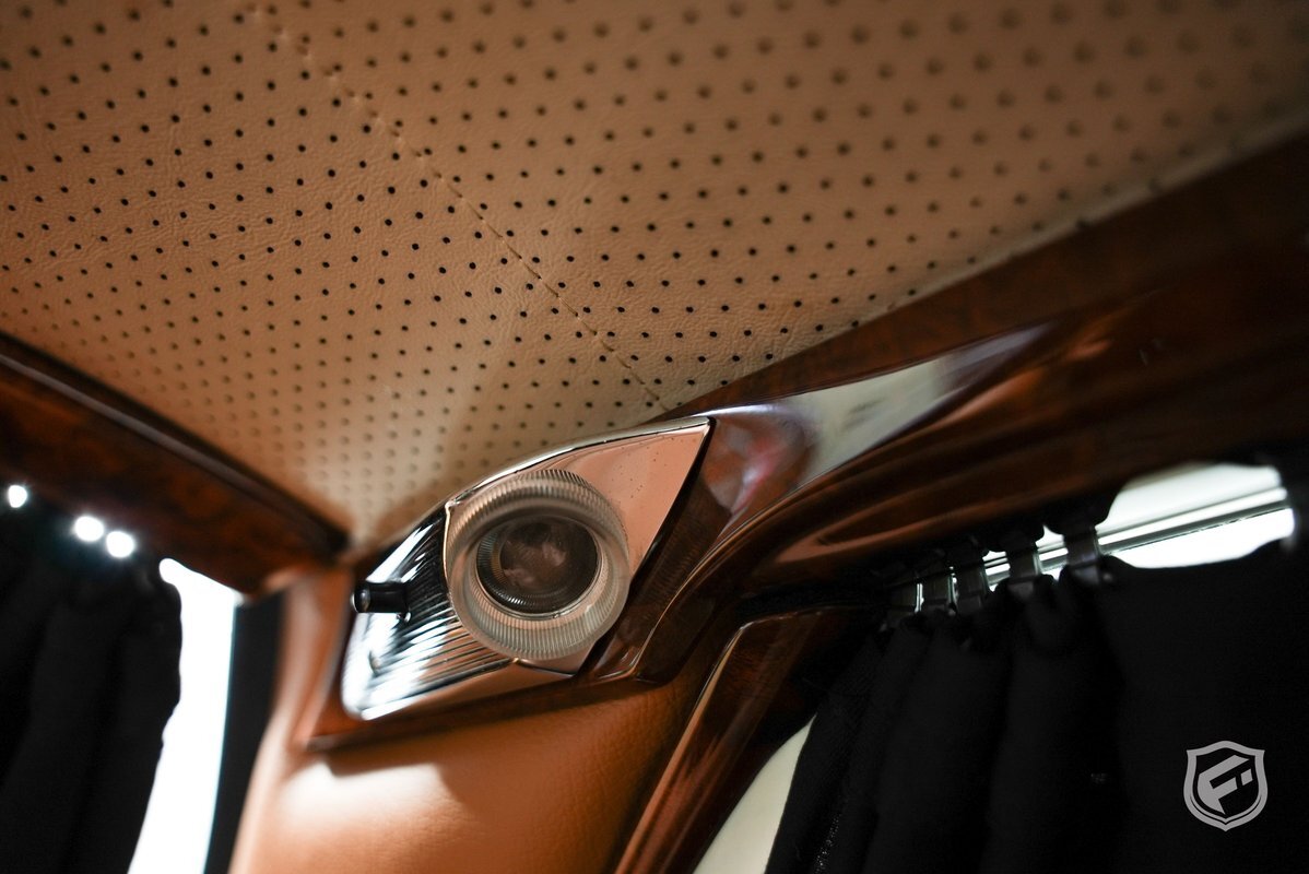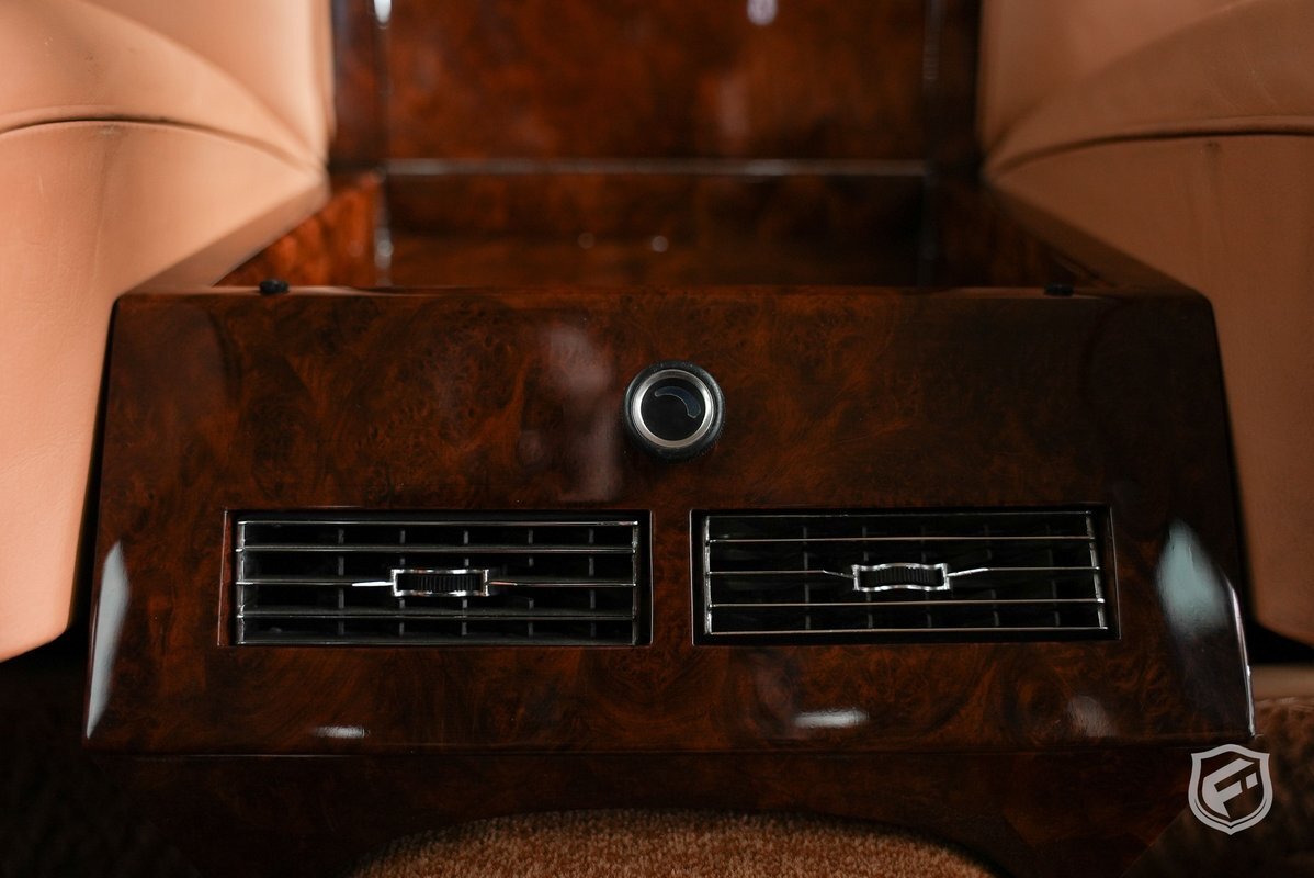 The cabin is divided by a half partition and inward-facing seats that were also reupholstered. Rear cabin equipment includes a speaker system, air conditioning controls, footrests, curtains, and a chilled drink cabinet in the center console.