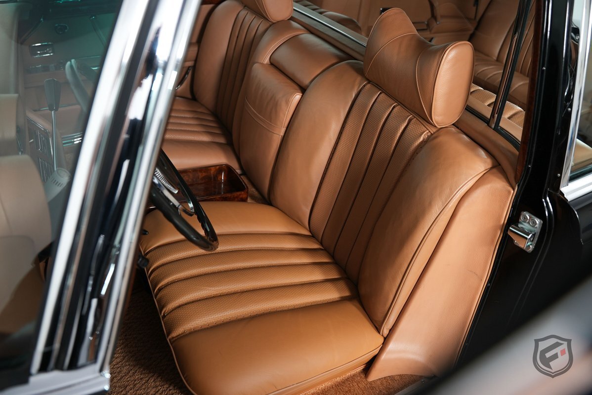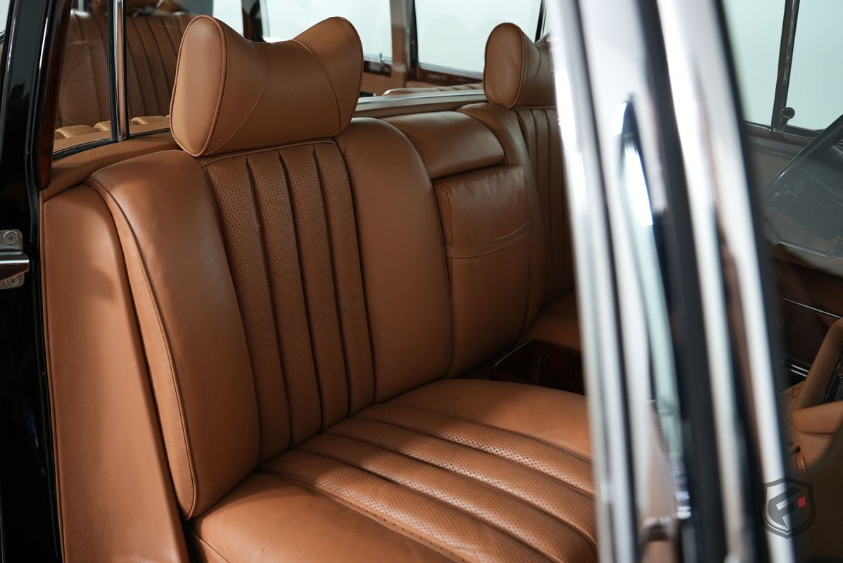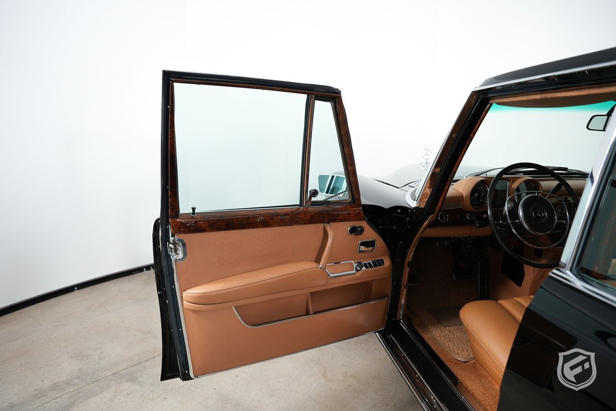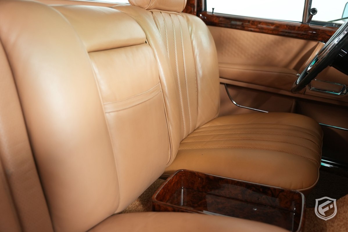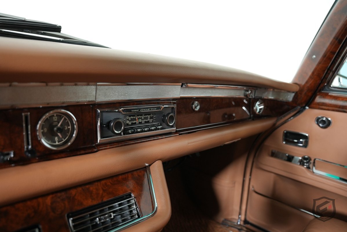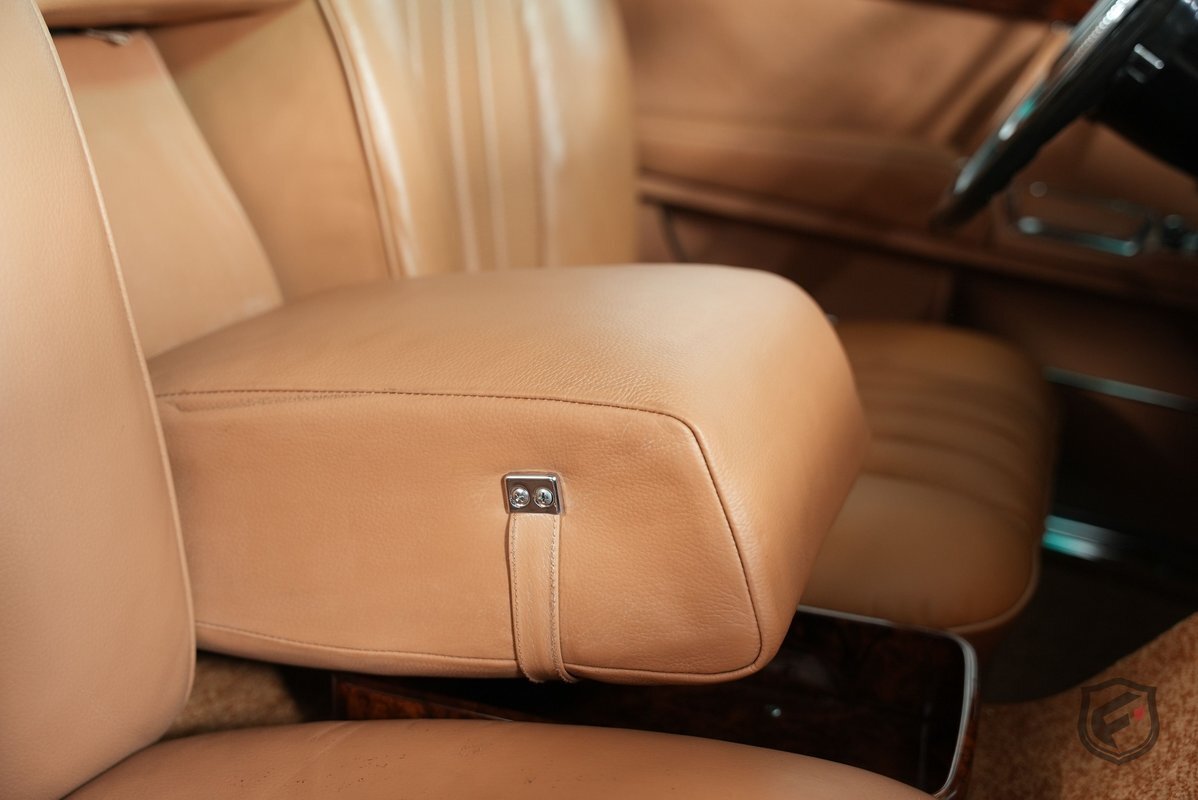 A refurbishment totaling over $150k was completed in 2014. Work included refinishing the body in black, reupholstering the Bamboo leather interior, renewing the burl wood trim, and overhauling the suspension, brakes, and exhaust system. The cabin is upholstered in Bamboo leather (249) with matching carpets and features burl wood trim, a front Becker Mexico radio, and a hydraulic system that powers the windows, central locks, and adjustment of the front and rear seats.