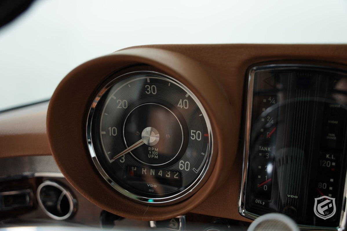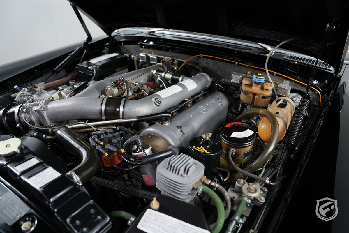 Power is provided by a 6.3-liter M100 V8 paired with a four-speed automatic transmission. The 6.3-liter M100 V8 features single overhead camshafts and Bosch mechanical fuel injection. Factory-rated output was 300 horsepower and 434 lb-ft of torque, which is sent to the rear wheels via a column-shifted four-speed automatic transmission. The engine and transmission have been refurbished. A stainless steel Timevalve Manufacturing exhaust system has also been installed.