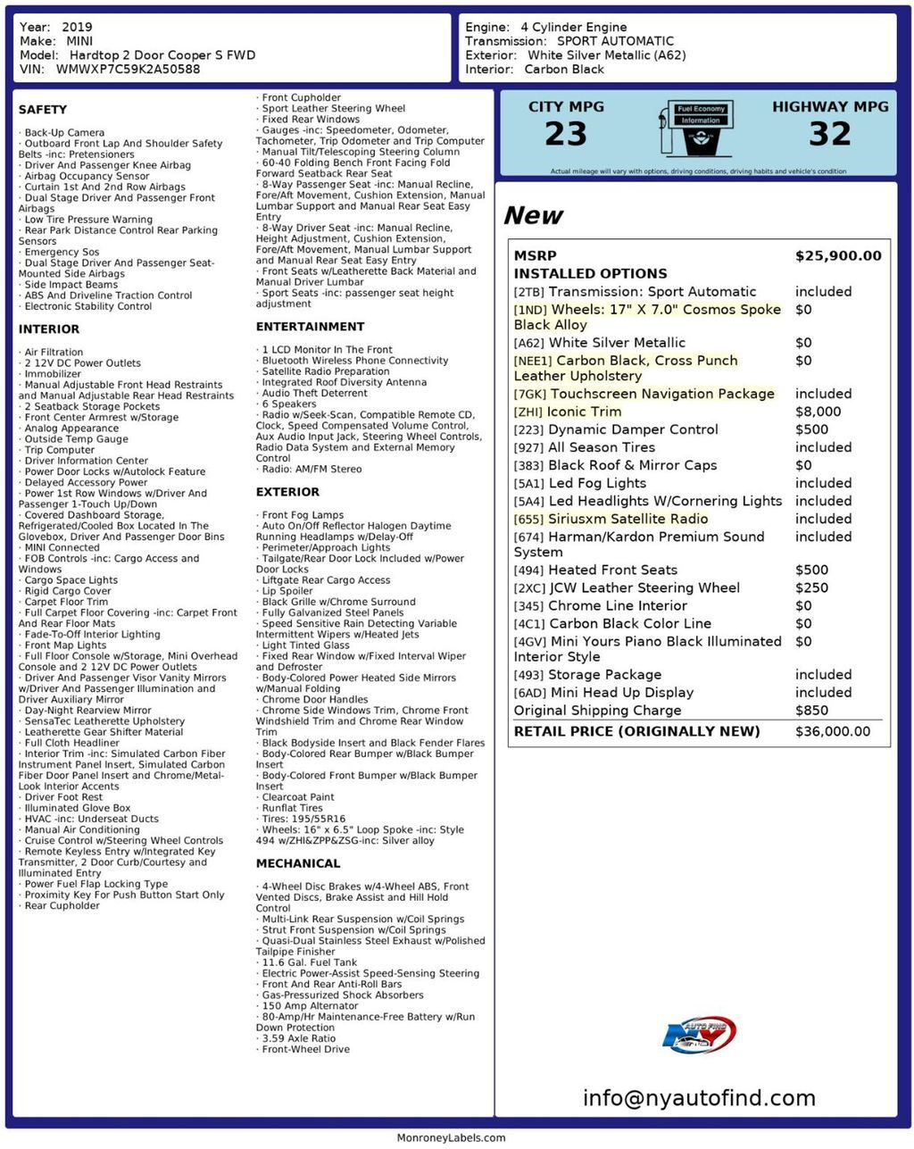 Take a look at this 2019 White Silver Metallic MINI Cooper S with Carbon Black Cross Punch Leather Interior, a Clean Carfax and only One Owner. Iconic is the word for this car and not only because it comes with the incredibly valuable Iconic Trim which has an absolute boat load of amazing features, but because this car is one of a kind with looks like this. It even has an ideal one owner clean history and a Remote Control Exhaust System. Do not miss this work of art. It comes equipped with a 2.0L 4-cylinder engine paired to a Sport Automatic Transmission, Iconic Trim (with Panoramic Sunroof, MINI Navigation, 17 Rail Spoke 2-Tone Alloy Wheels, LED Fog Lights, Active Driving Assistant, LED Headlights with Cornering Lights, Storage Package, Auto-Dimming Interior and Exterior Mirrors, Comfort Access Keyless Entry, Harman/Kardon Premium Sound System, Power Folding Mirrors, Piano Black Interior Surface, Automatic Climate Control, SiriusXM Satellite Radio, Piano Black Exterior, MINI Heads Up Display, Touchscreen Navigation Package, MINI Connected Services, Advanced Real Time-Traffic Information, Apple CarPlay Compatibility, Remote Services, MINI Assist eCall, MINI TeleServices, MINI Connected XL, Wireless Charging and Enhanced Bluetooth, MINI Yours Leather Steering Wheel), Dynamic Damper Control, Black Roof and Mirror Caps, Heated Front Seats, JCW Leather Steering Wheel, Chrome Line Interior, Carbon Black Color Line, Piano Black Illuminated Interior Style, Cruise Control, Steering Wheel Controls, AM/FM Radio, Power Windows, Power Locks, Air Conditioning and so much more. Every NY Auto Find vehicle comes with a complimentary Limited Warranty and a Carfax Vehicle Report. Our vehicles are priced to sell quickly. Please call to check availability and to schedule an appointment. -