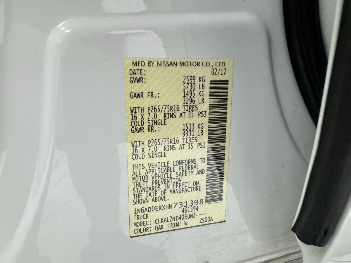 Every road leads to adventure in our One Owner 2017 Nissan Frontier Desert Runner Crew Cab 4X2 brought to you in Glacier White! Powered by a 4.0 Liter V6 that offers 261hp while paired with a responsive 5 Speed Automatic transmission. It's outfitted with Bilstein off-road performance shocks and speed-sensitive power steering. You're rewarded with impressive capability on and off the road - along with the power to tow - and nearly 22mpg on the highway. Our Frontier Desert Runner is full of attitude that gets you noticed! Check out the alloy wheels - running boards - bedliner - and distinct satin chrome grille. Climb inside the Desert Runner cabin that offers clever storage options as well as keyless entry - full power accessories - and special Desert Runner cloth seat trim. Settle in and turn up the sound on the AM/FM/CD audio with a color display. You'll appreciate available satellite radio - Bluetooth - and a wealth of other comfort and convenience features. Of course - your safety is paramount at Nissan. With our Frontier Desert Runner - you'll find ABS - stability control - front-seat side airbags - and full-length side curtain airbags as well as other innovative systems. You work hard so now is the time to buy a truck that works even harder for you! Save this Page and Call for Availability. We Know You Will Enjoy Your Test Drive Towards Ownership!