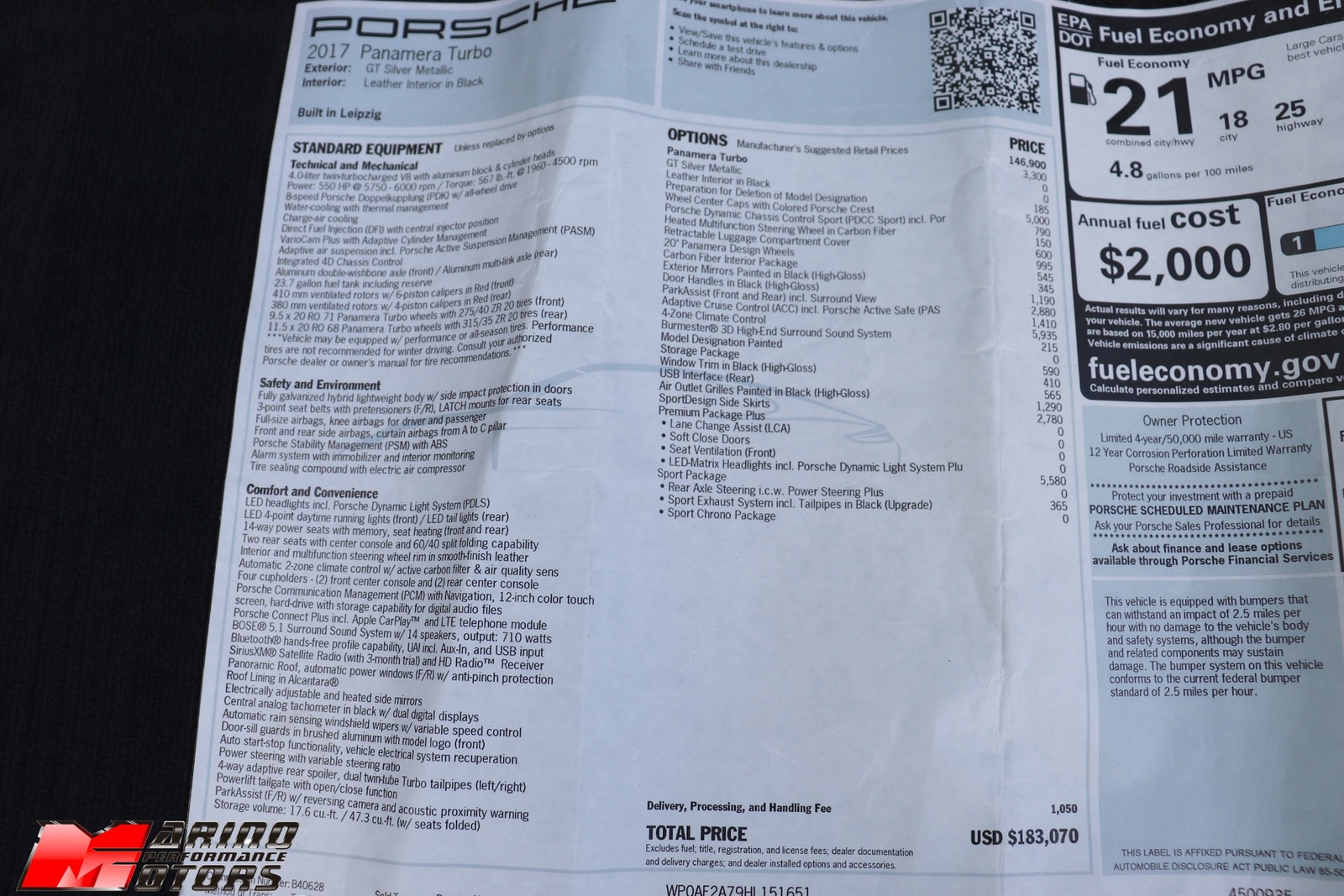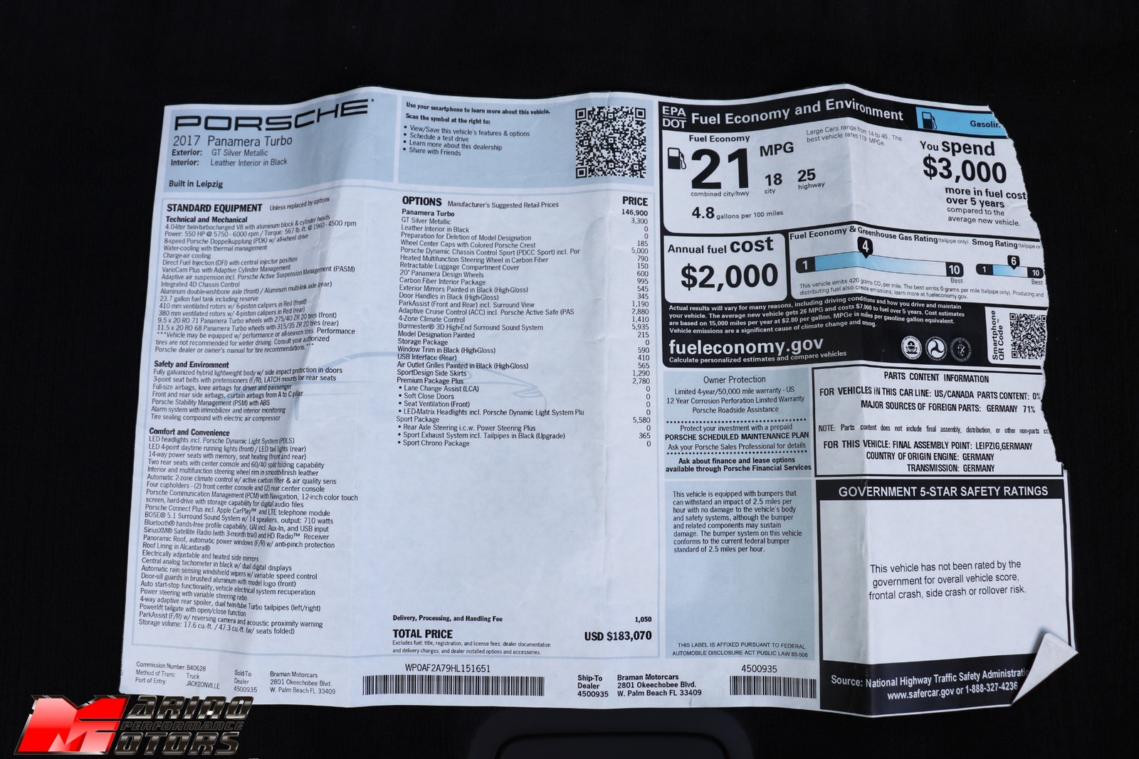 Marino Performance Motors proudly presents this highly optioned 2017 Porsche Panamera Turbo finished in GT Silver Metallic. This Panamera's options really set it apart from others. The 2017 Panamera is the first model year of the much loved new body style. Bringing the Panamera to the top with executive class luxury and world famous performance.