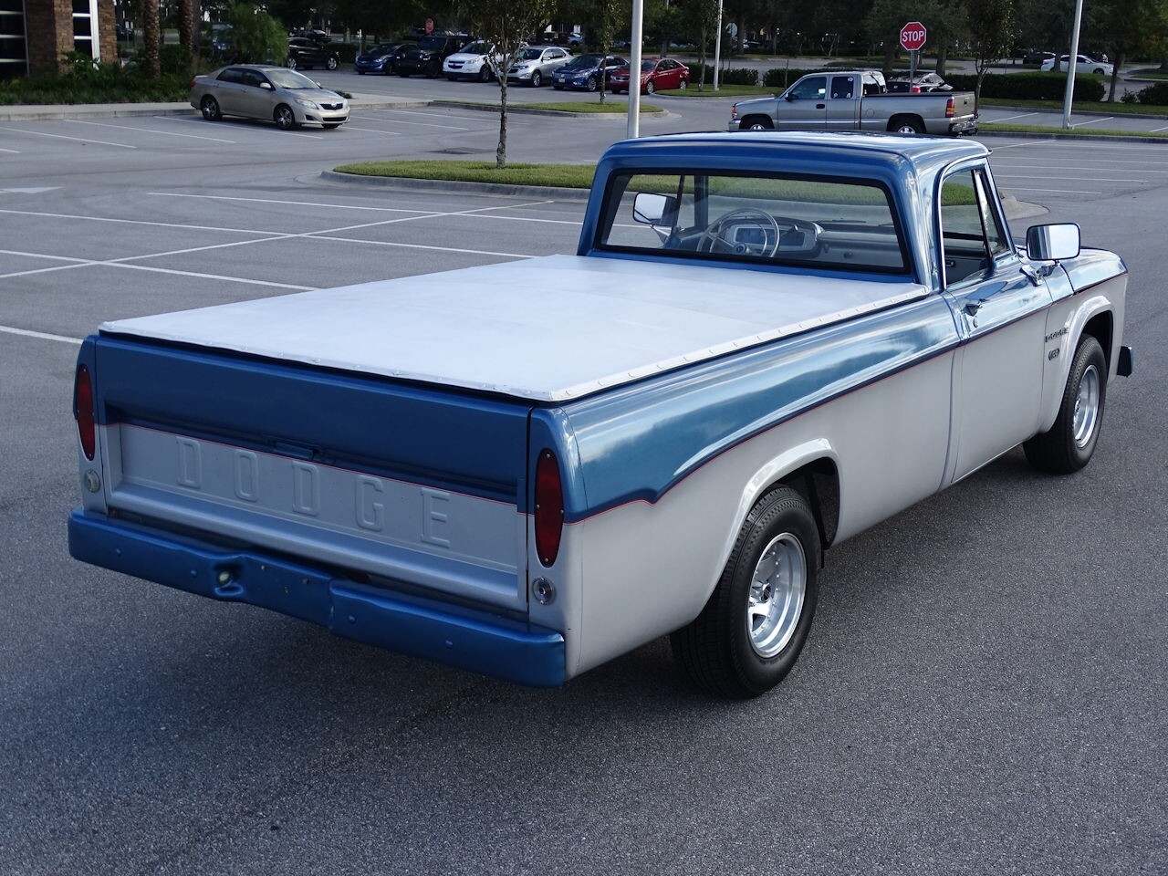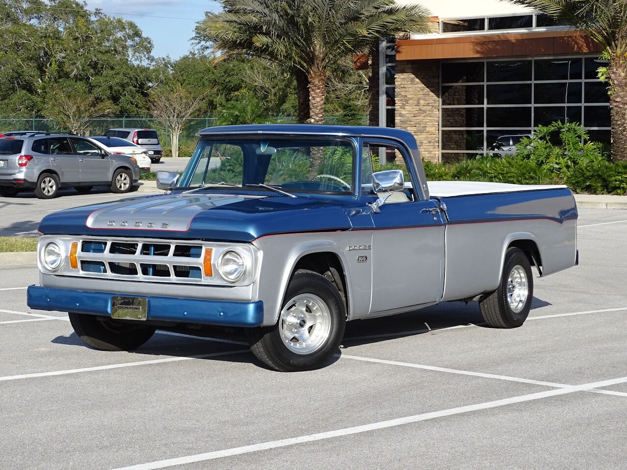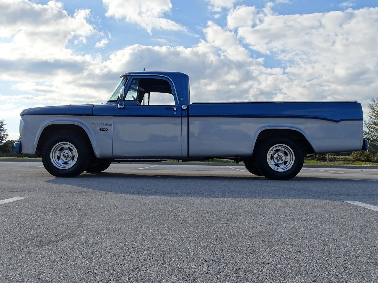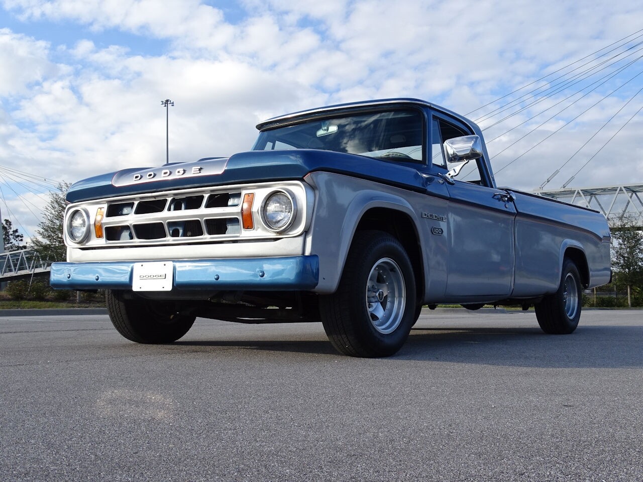Gateway Classic Cars of Orlando is proud to offer this stout and stunning 1968 Dodge D100. The D100 was Dodge's foray into the full size pickup market. With an array of engine options and bed lengths the D100 lineup was well suited for any buyer's needs. This 1968 is configured with the medium length 8 ft bed and a regular cab. The 2020 paint job is a custom 2 tone scheme of silver and blue that really accentuates the truck's sculpted body lines. The bed has a vinyl cover that gives the rear of the truck a smooth aerodynamic form. The entire look of this truck is tied together with an attractive stance thanks to the American Racing 15 inch aluminum wheels. Under the hood is a 318 V8 and is paired with an old school column shift 3 speed manual. Just imagine the things you can tow with this truck! Recent work done by the owner includes new tires, new shocks, new brakes, new clutch, new radiator and more. If you're looking for a sharp classic truck to enjoy, this is the one you want to own! Options include AM radio, vinyl interior and aluminum wheels wrapped in radial tires. This is the one you want to own. [ omitted ]. [ omitted ]. [ omitted ].