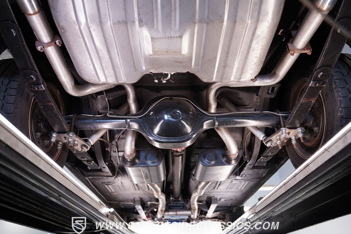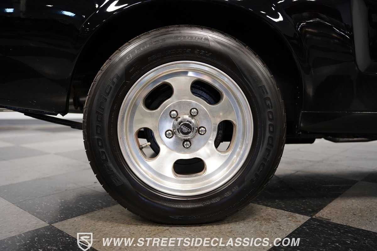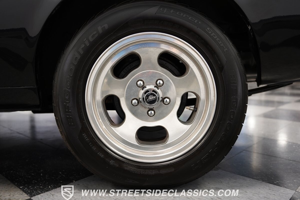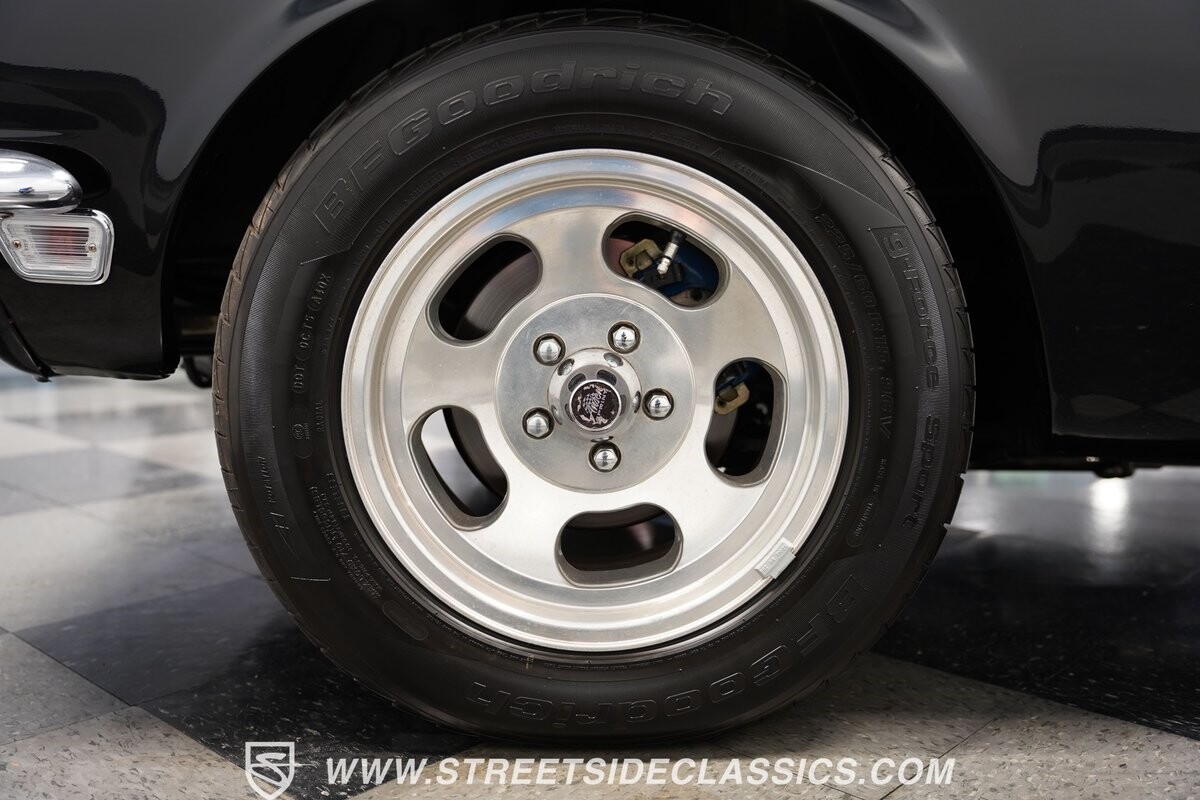 We know why you like the look of this one. The dark paint, deleted badging, and deluxe hood make this look like it could be a cousin to Bullitt Mustang. We're not saying it's trying to be a replica, but you can tell it gives a lot of the same vibe. You might feel it's a bit meaner than Steve McQueen's car since this is done in black. It's an upgraded application with a nice gloss and shine that goes well with the chrome bumpers and trim. But don't ever think of this as a museum piece. As you look through the whole car, the idea is to have one that makes an excellent impression while never hesitating to drive on the streets of San Francisco. It has cool/classic cruiser upgrades like the billet-style grille, polished dual exhaust tips, and actual Ansen Sprint slotted mag wheels.