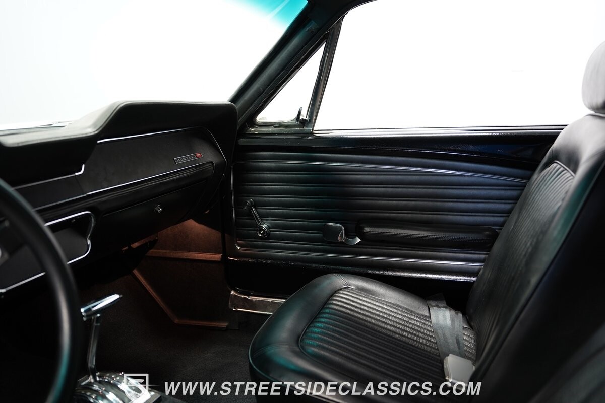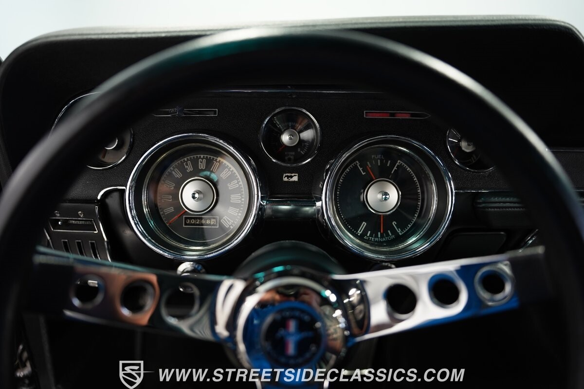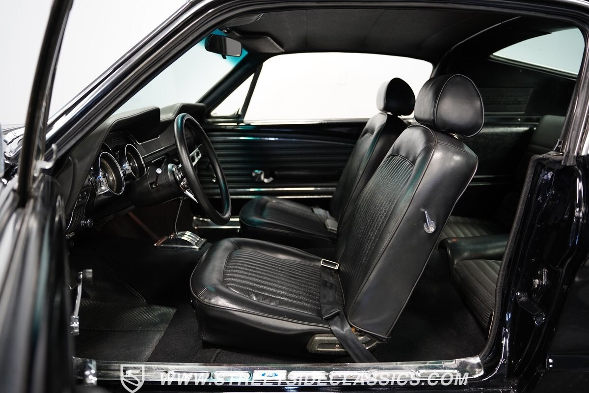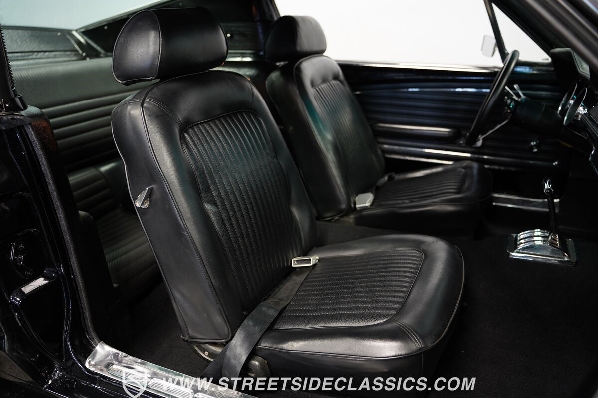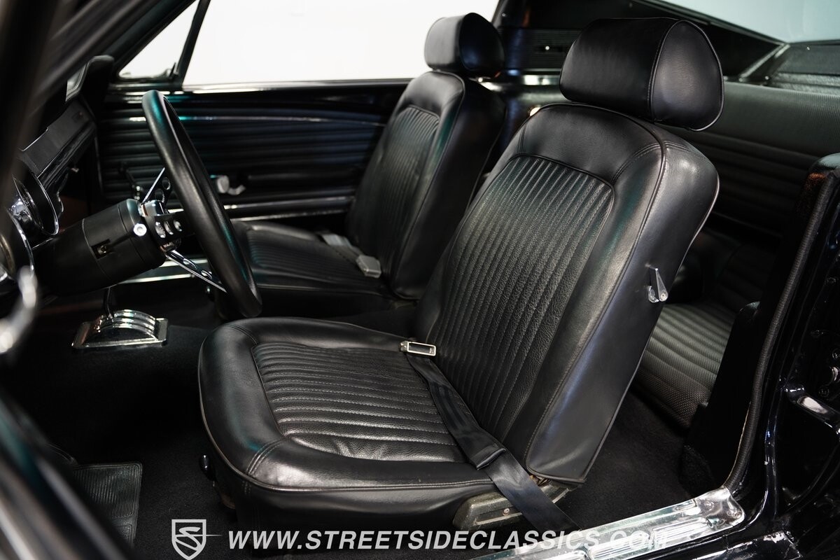 The black interior gives this pony car a full midnight style. It has a clean look with newer carpeting and a smooth dash. You'll even like the details, including the working interior lights and the fold-down rear seat. And you get the right feeling that this was made to be a driver. You have good-looking front bucket seats with headrests, an upgraded steering wheel, and a bright shifter in all this darkness that's a nice place to rest your hand.