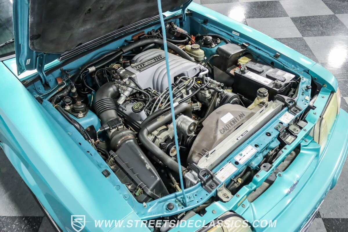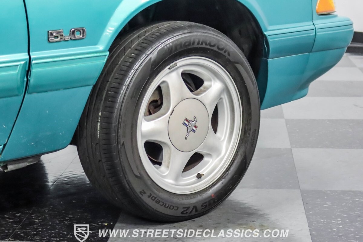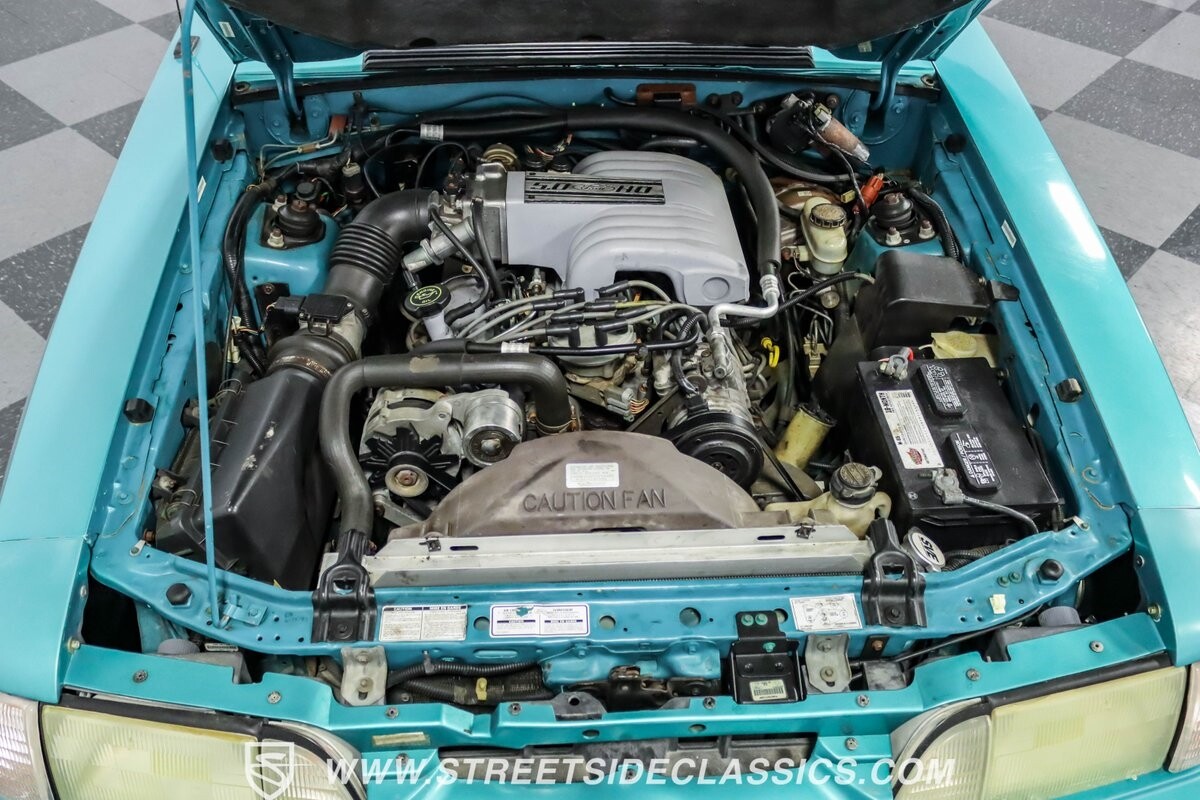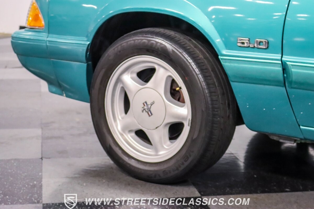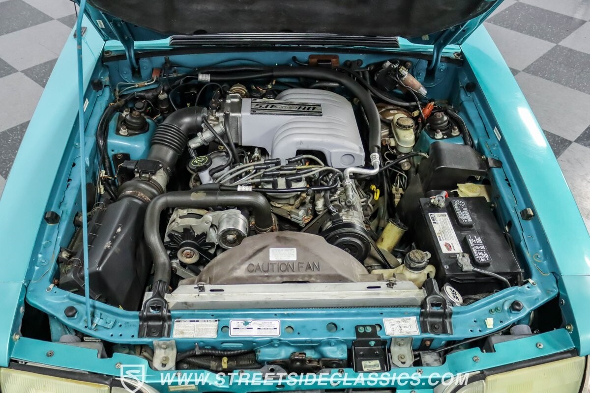 The venerable 5.0-liter HO V8 under the hood was the go-to powerplant in the 1990s and it remains fast and fun today. The hard part is finding one that hasn't been modified, raced and abused, but this one appears to be almost entirely stock, with the welcome exception of an upgraded Flowmaster X-pipe dual exhaust system for some added horsepower. Still wearing its original intake manifold, throttle body and even the stock valve covers, it is one of those untouched cars that just seems to run and drive better than most. Thanks to the quick-shifting 5-speed manual transmission, it snaps through traffic with real authority, and the original 8.8-inch rear end has relatively tall gears inside so it is awesome on the highway. 16-inch five-spoke wheels look great on the Fox body and carry Hankook performance radials that give it the right Mustang stance.