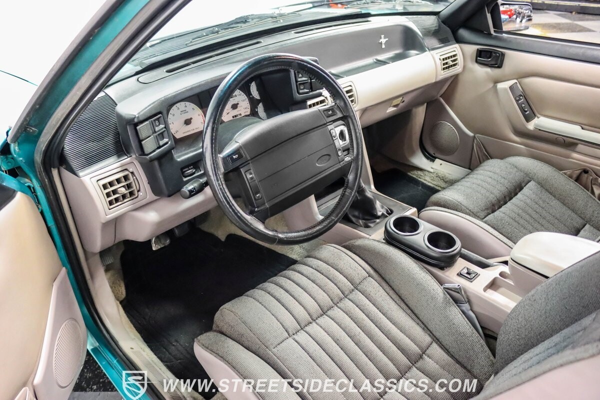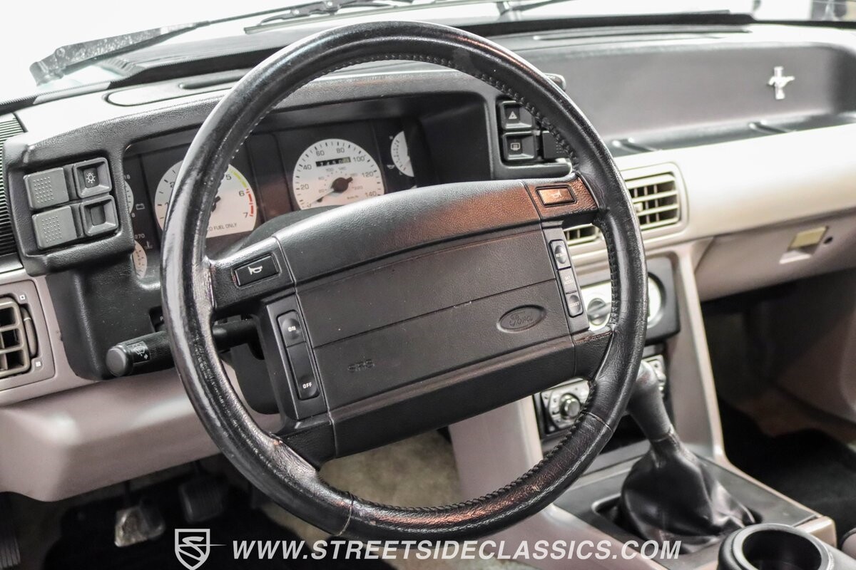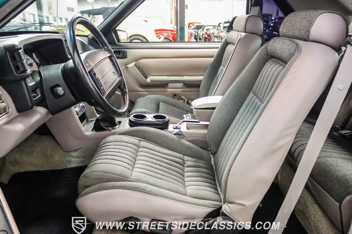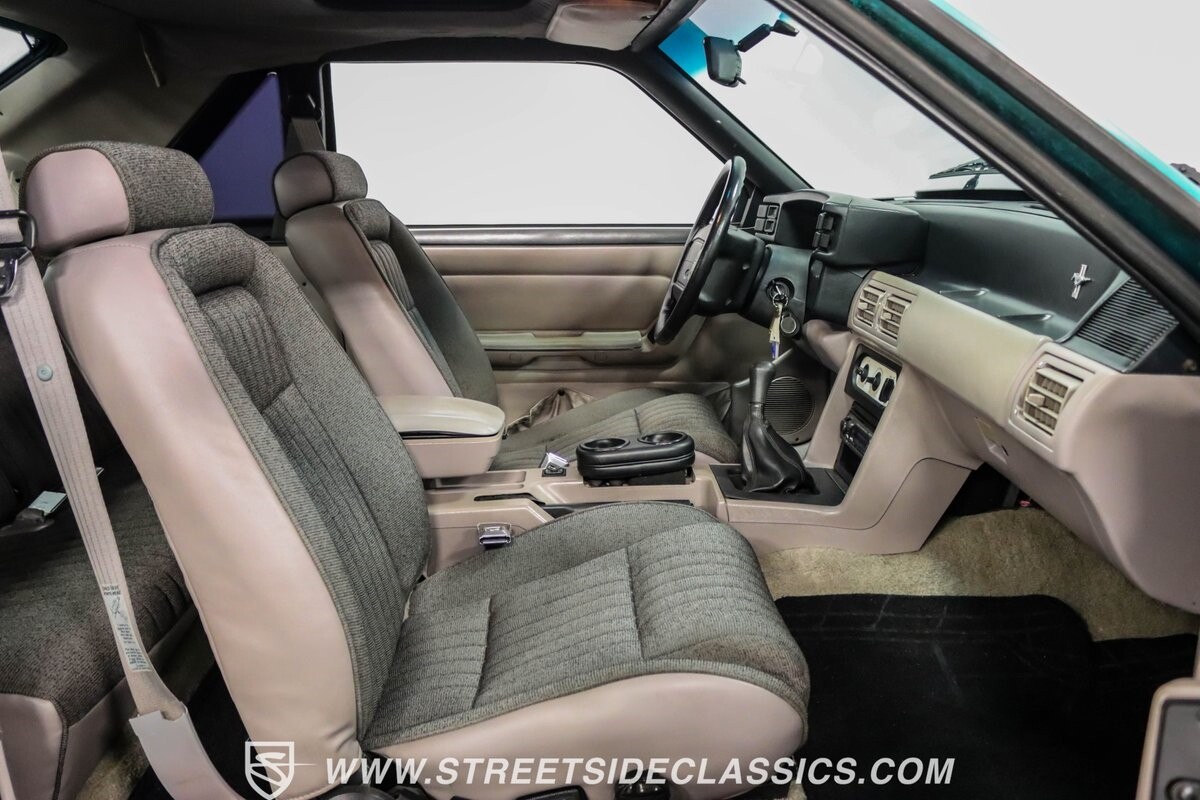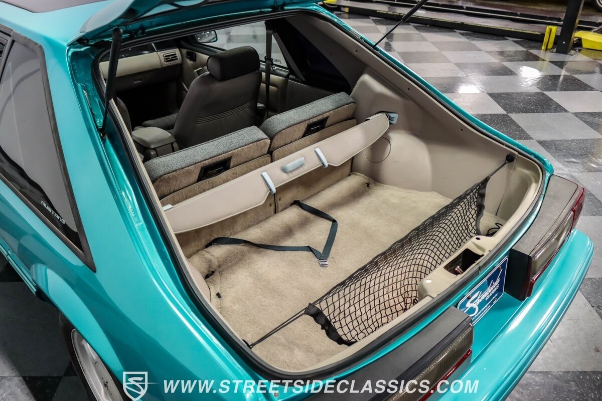 The gray cloth and vinyl interior is in great shape, offering stock bucket seats that provide plenty of bolster support for both the driver and passenger. The door panels, center console and the rear seat are all quite nice, and even the headliner remains taut, further showing off the limited wear accrued with only 54K miles on the clock. Ford's fat steering wheel feels great in your hands, with an airbag added just a couple years before, and the relatively upright greenhouse makes the Mustang very user-friendly in traffic, where it's the ultimate point-and-shoot machine. The factory A/C blows cold, so this is a car you can still drive every day. Other options include sunroof, power windows and locks, cruise control and an upgraded Sony AM/FM/CD/AUX stereo, making this a fairly loaded grand tourer that looks today like it did in 1992. With rear seats that fold down, cargo capacity is impressive and the trunk area shows only minor wear despite being nearly 30 years old. Even the original cargo cover is still in great shape!