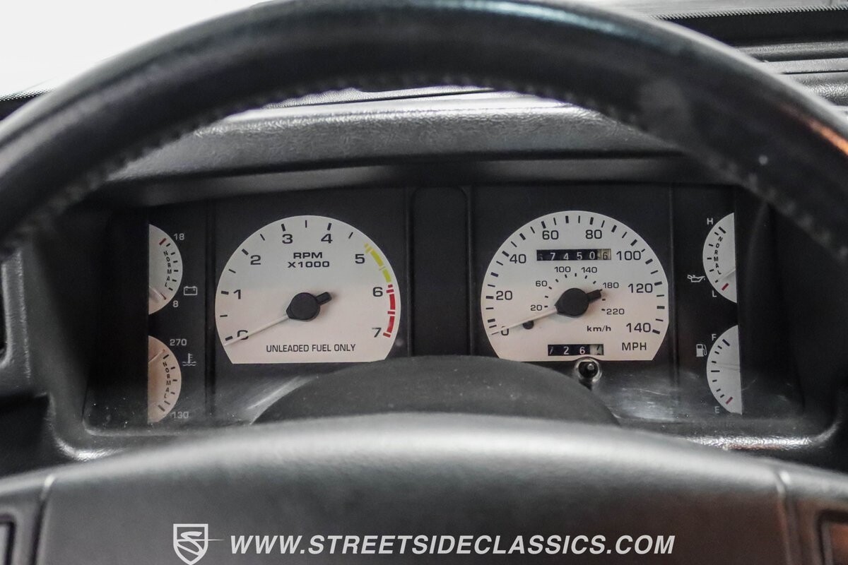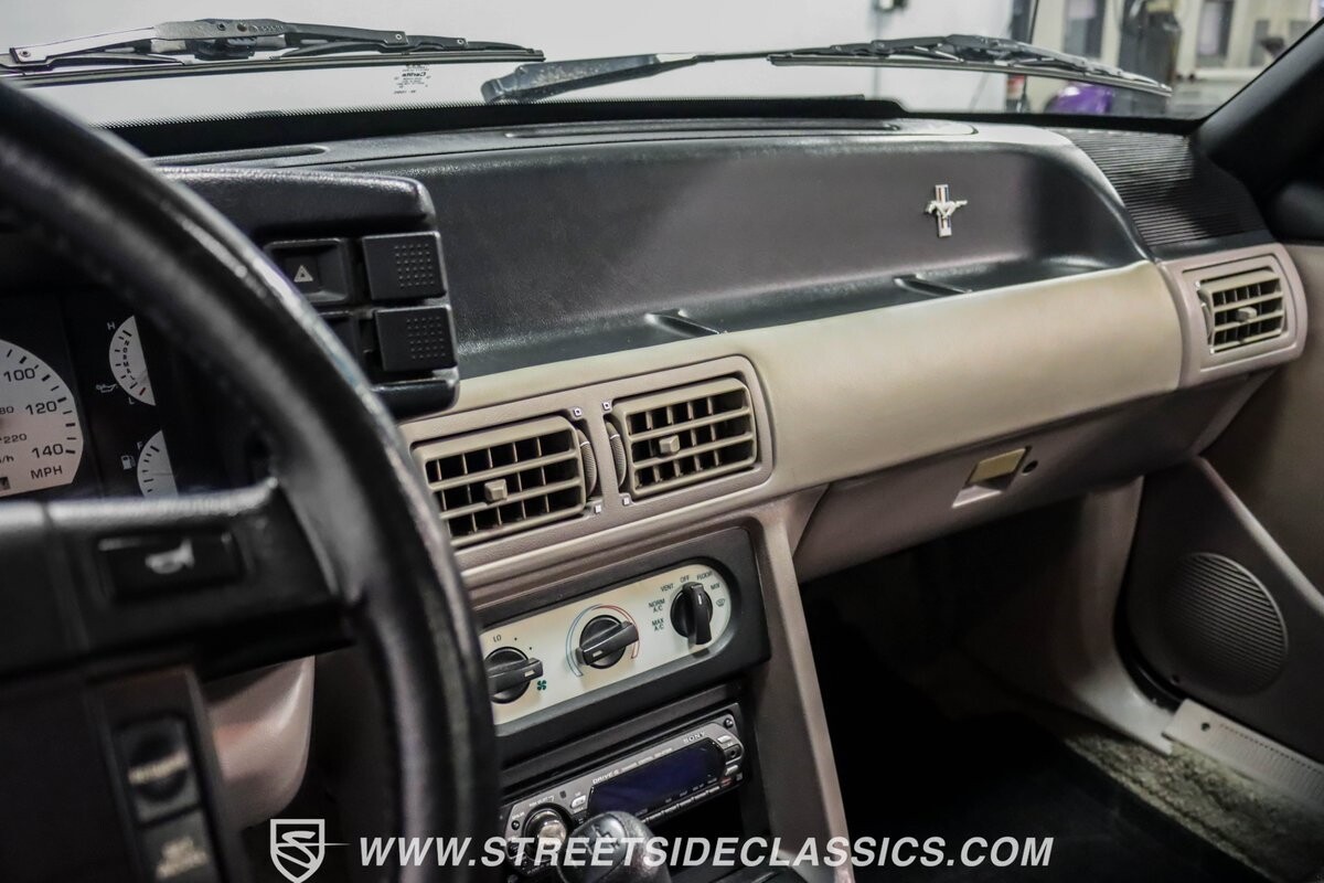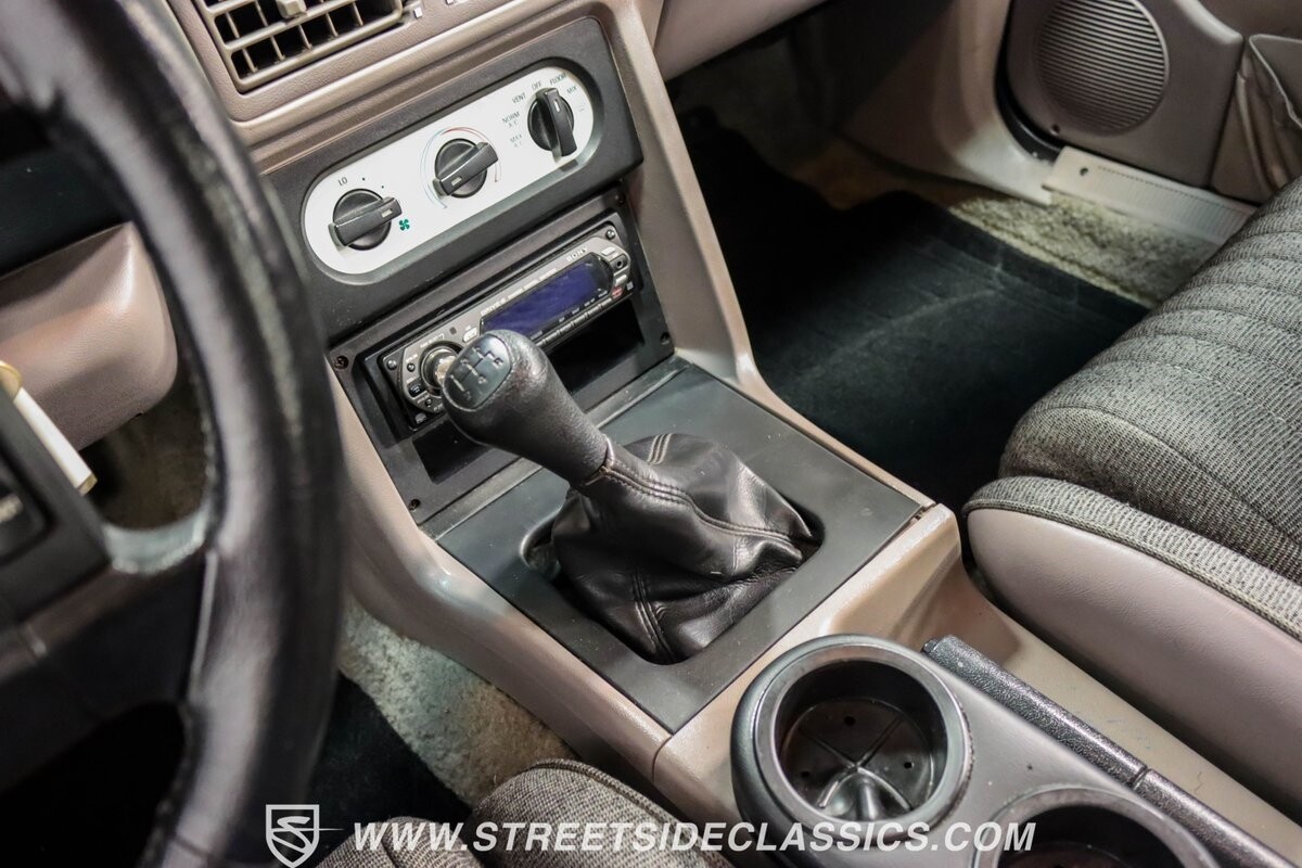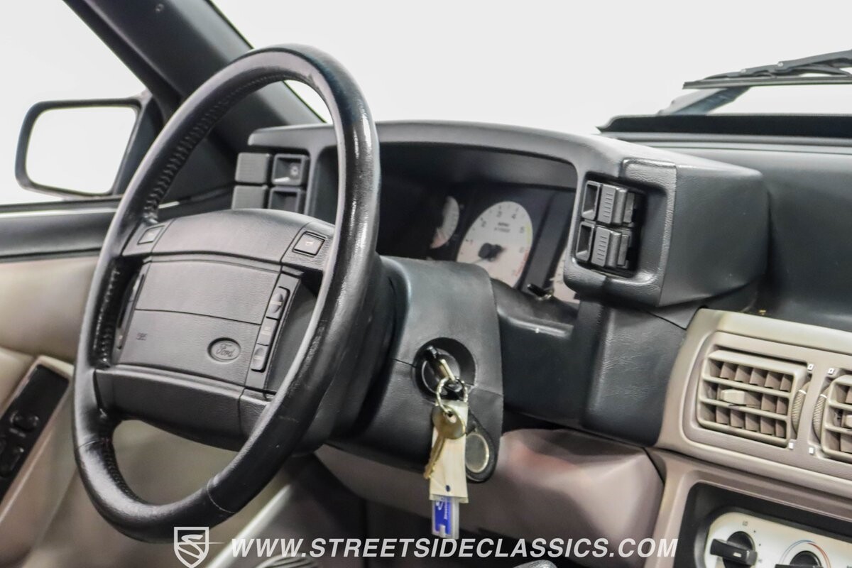 The gray cloth and vinyl interior is in great shape, offering stock bucket seats that provide plenty of bolster support for both the driver and passenger. The door panels, center console and the rear seat are all quite nice, and even the headliner remains taut, further showing off the limited wear accrued with only 54K miles on the clock. Ford's fat steering wheel feels great in your hands, with an airbag added just a couple years before, and the relatively upright greenhouse makes the Mustang very user-friendly in traffic, where it's the ultimate point-and-shoot machine. The factory A/C blows cold, so this is a car you can still drive every day. Other options include sunroof, power windows and locks, cruise control and an upgraded Sony AM/FM/CD/AUX stereo, making this a fairly loaded grand tourer that looks today like it did in 1992. With rear seats that fold down, cargo capacity is impressive and the trunk area shows only minor wear despite being nearly 30 years old. Even the original cargo cover is still in great shape!