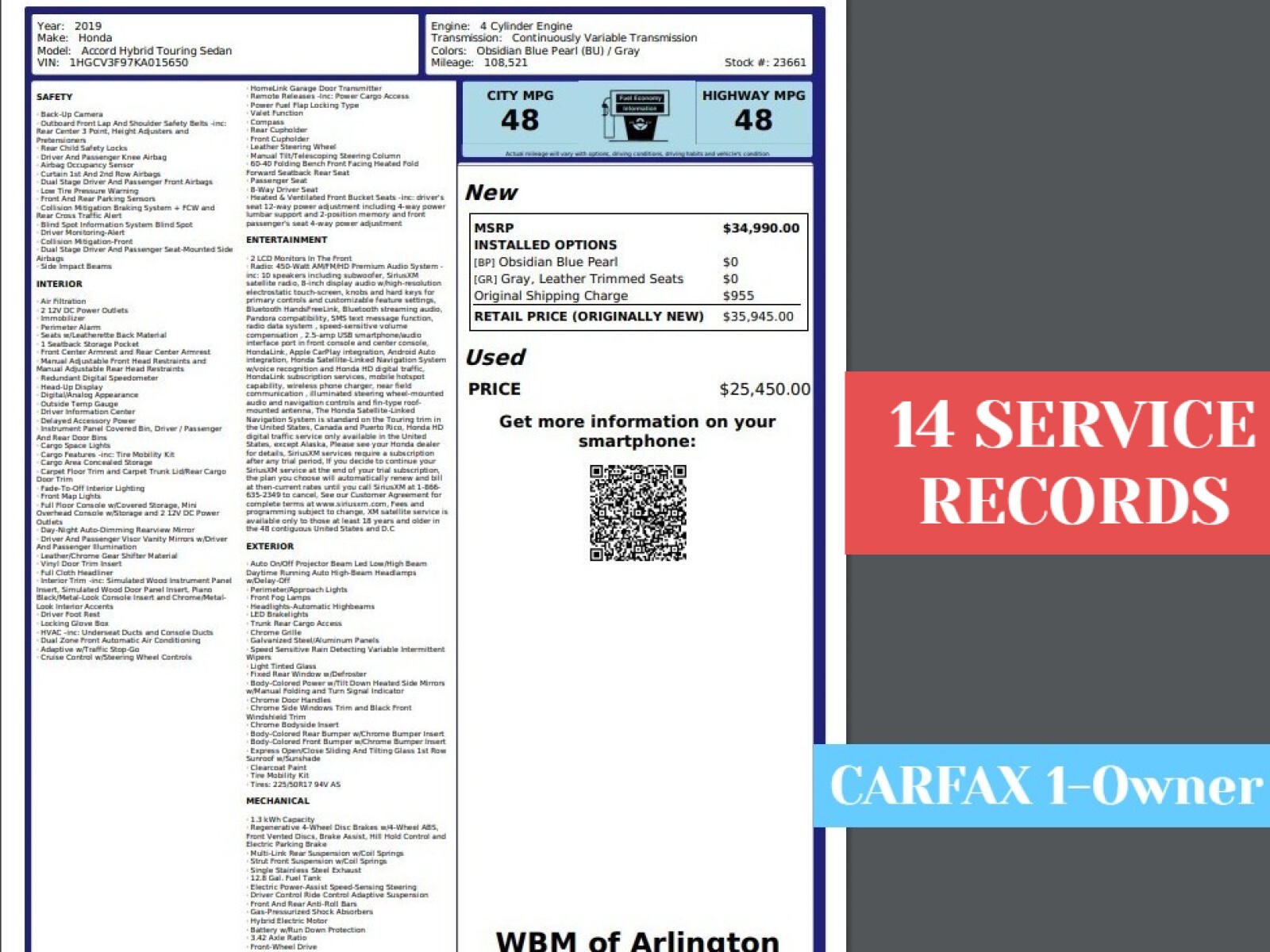 * Thank you for visiting another one of W B M of Arlington's exclusive listings! W B M of Arlington is a small family operated business established in 1988. * Our competitive pricing primarily stems from our lean operational costs, not compromised quality. We prioritize customer value over higher profit margins. * We welcome pre-buy inspections. * We offer extended service warranties for this vehicle. * We exclusively source our vehicles from non-auction channels. * 100% CARFAX guaranteed! * CARFA X reports this to be a 1- owner car . * Every car in our inventory undergoes meticulous inspection and comes with a verified CARFAX history report. * To view more pictures, please visit our website at . * A few vehicles may exhibit slightly higher mileage than initially advertised, primarily attributed to test drives, inspections, and servicing. * We kindly request you to verify the precision of vehicle options with your designated sales representative. In very rare instances, discrepancies may arise in the transmission of electronic data feeds, potentially affecting the accurate representation of certain options.