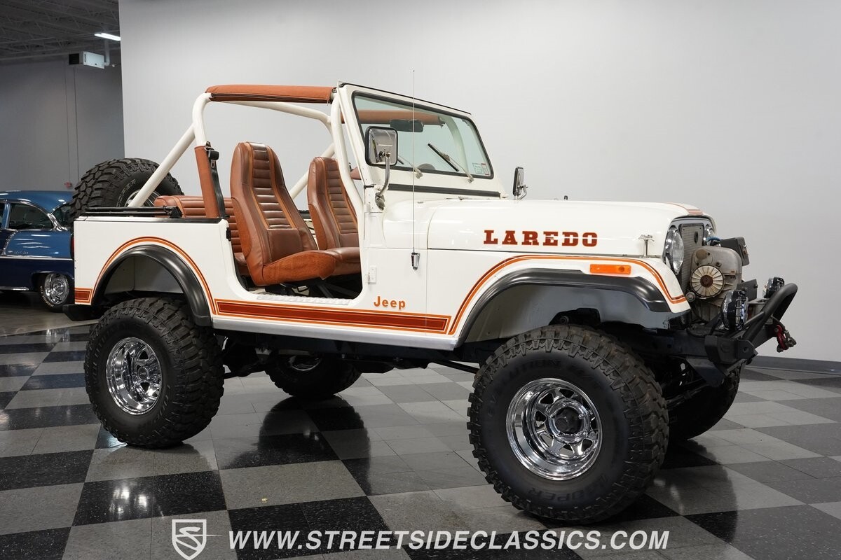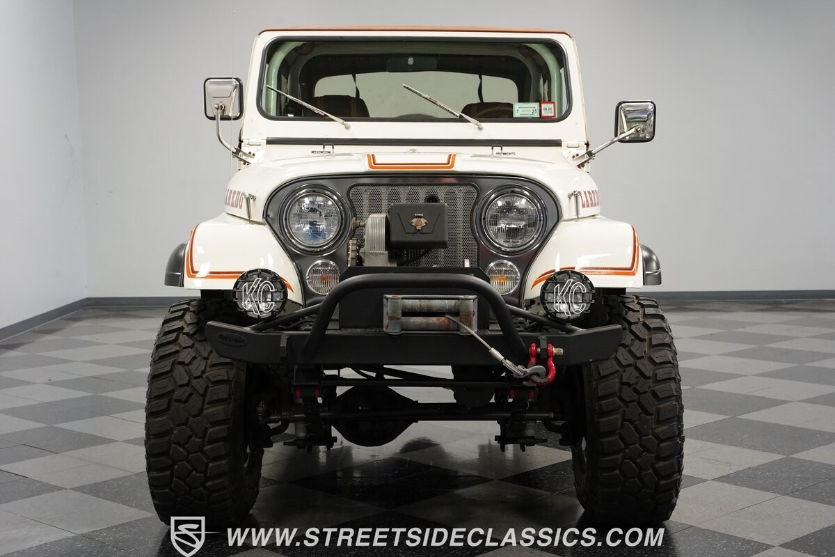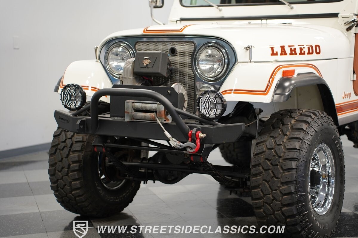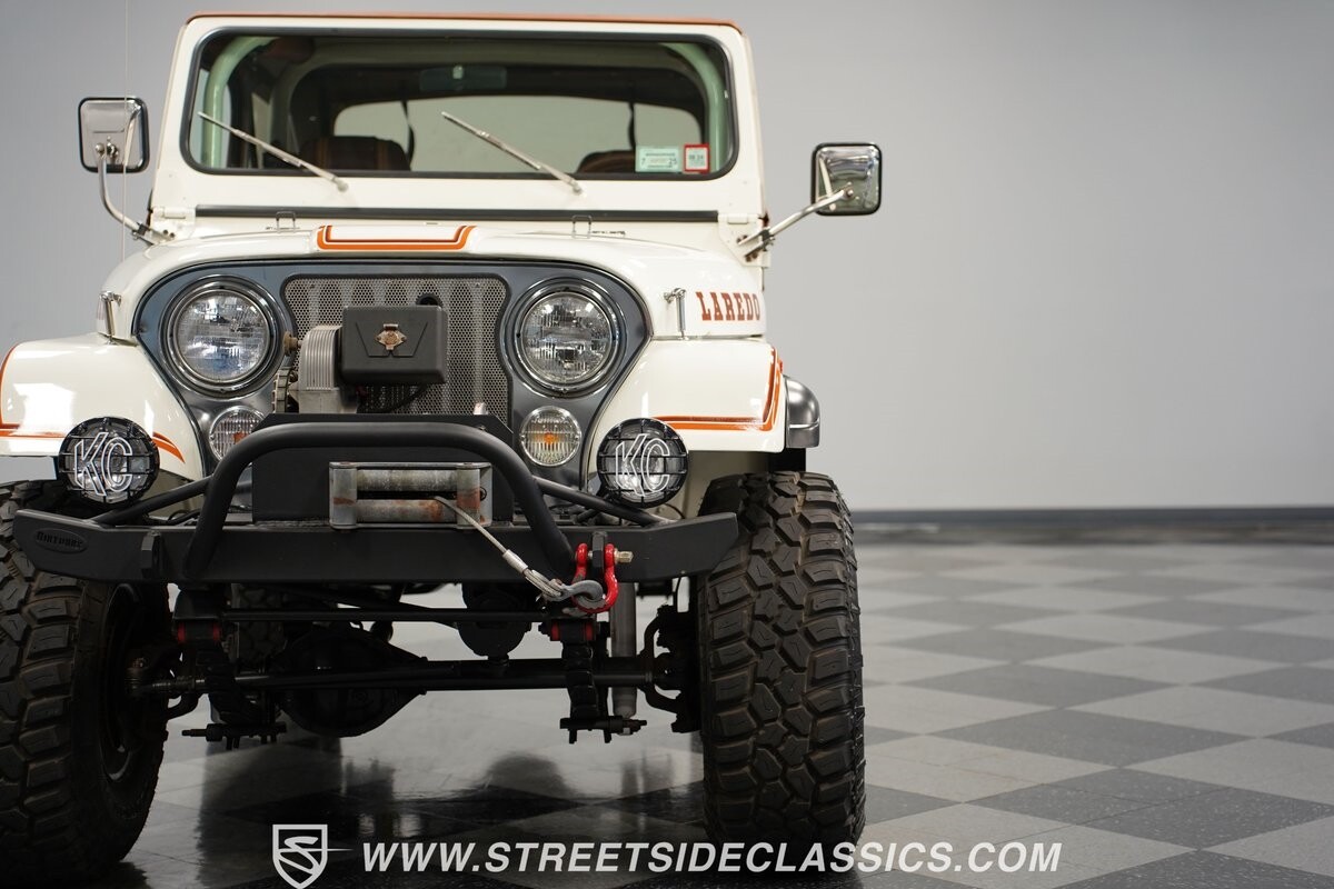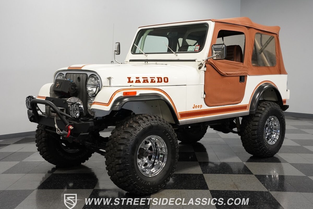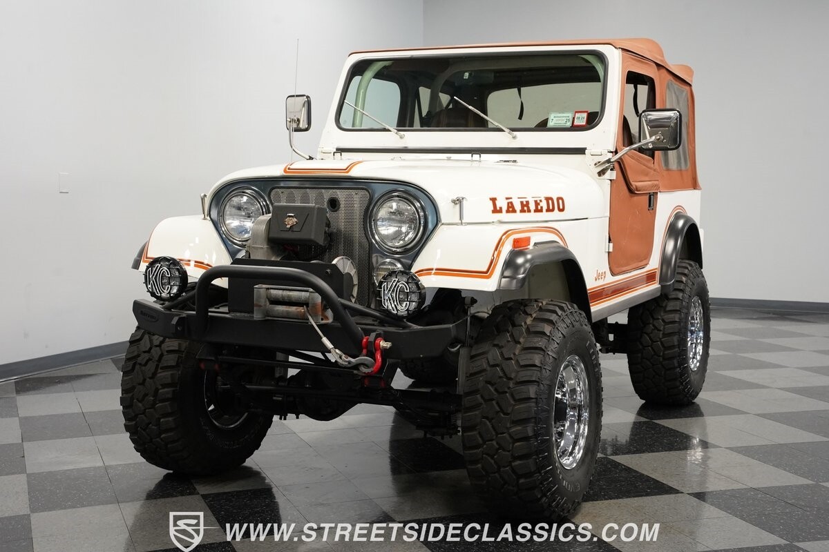This 1981 Jeep CJ7 Laredo is a rugged off-road warrior, forged in the Arizona desert and now ready to conquer new terrain. Its white exterior, adorned with vibrant orange Laredo decals, exudes classic Jeep charisma. The 4.5-inch lift kit gives this CJ7 an imposing stance, complemented by chrome 15-inch wheels wrapped in beefy 33x12.50LT15 Cooper tires. A full soft top and doors, along with a bikini top option, offer versatile protection from the elements. The DirtWorx front winch mount bumper, housing a factory AMC Jeep Warn Winch M8274, stands ready for any obstacle, while KC lights illuminate the path ahead.