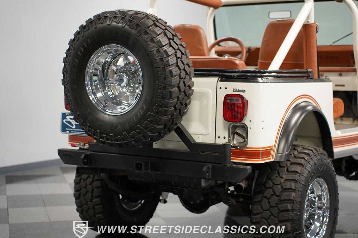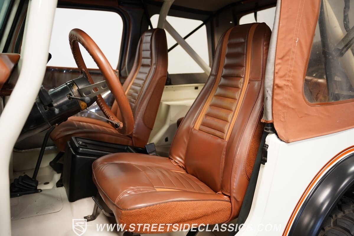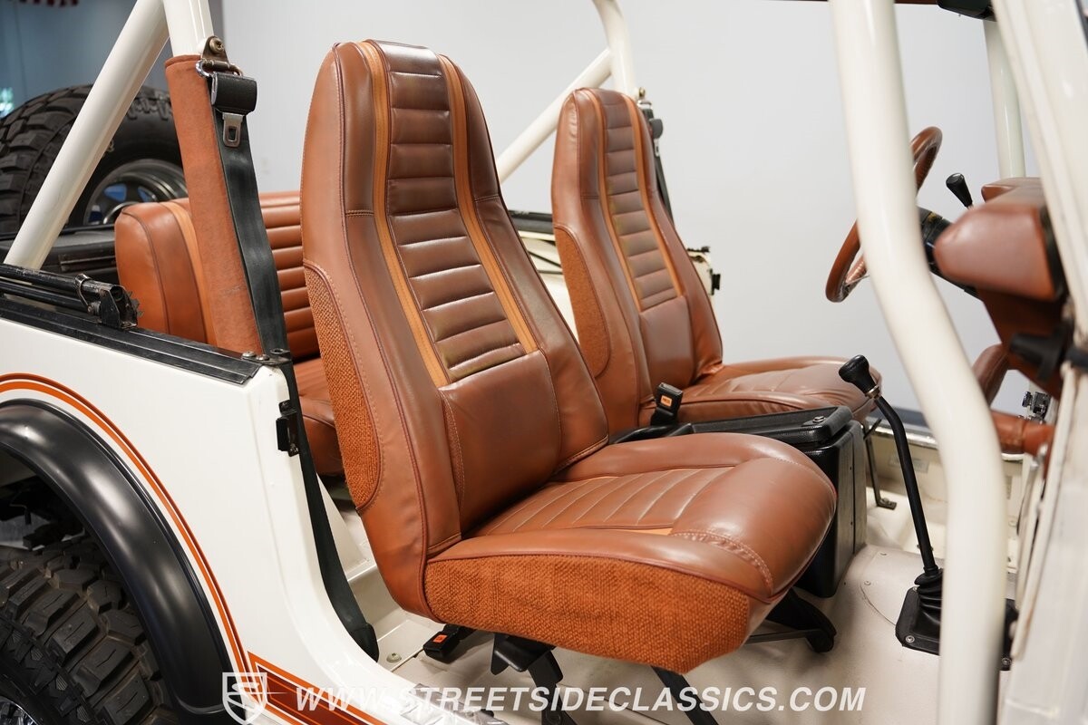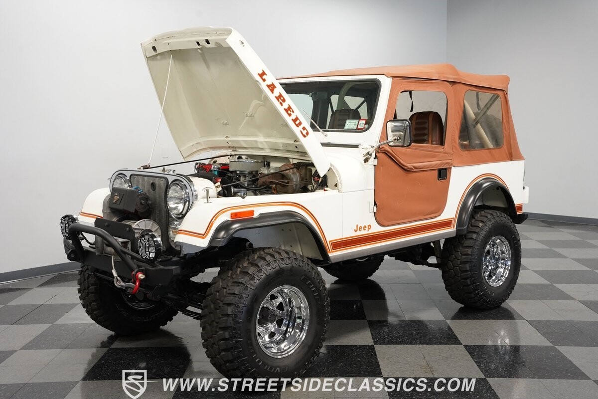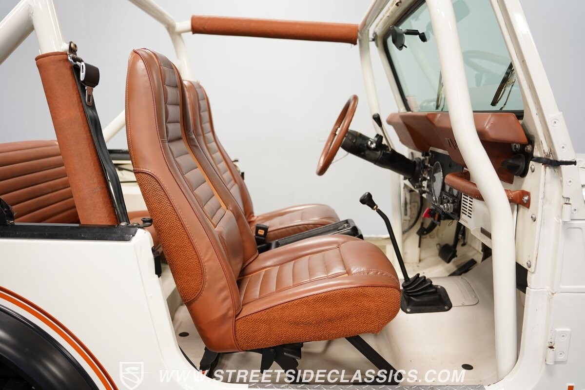 This 1981 Jeep CJ7 Laredo is a rugged off-road warrior, forged in the Arizona desert and now ready to conquer new terrain. Its white exterior, adorned with vibrant orange Laredo decals, exudes classic Jeep charisma. The 4.5-inch lift kit gives this CJ7 an imposing stance, complemented by chrome 15-inch wheels wrapped in beefy 33x12.50LT15 Cooper tires. A full soft top and doors, along with a bikini top option, offer versatile protection from the elements. The DirtWorx front winch mount bumper, housing a factory AMC Jeep Warn Winch M8274, stands ready for any obstacle, while KC lights illuminate the path ahead.