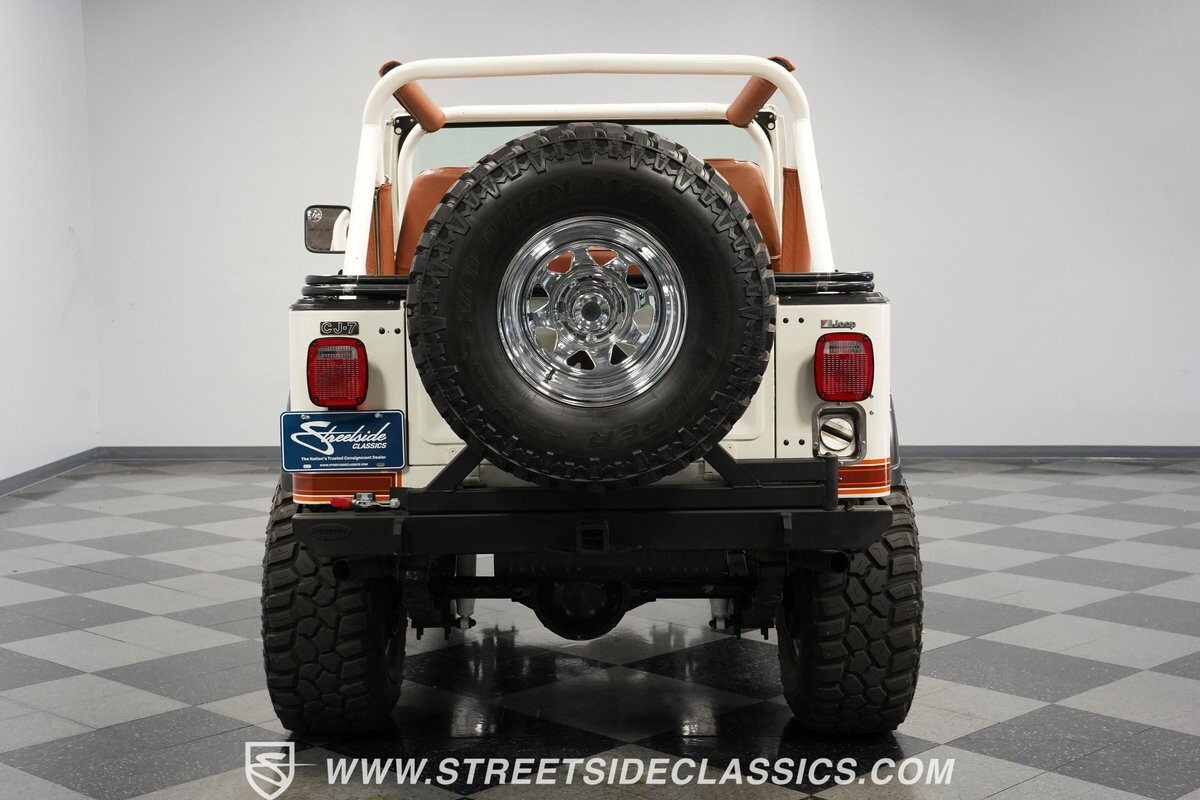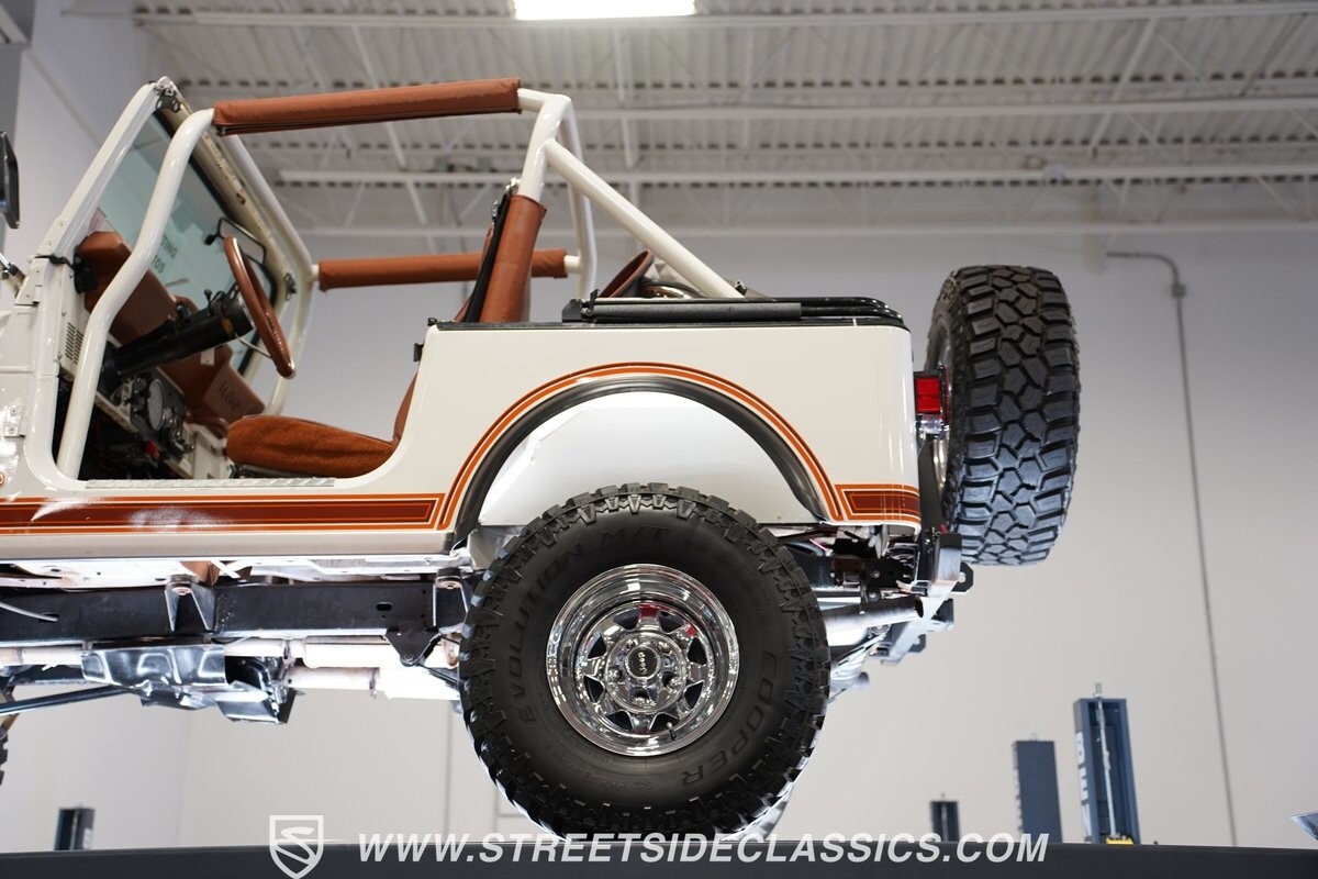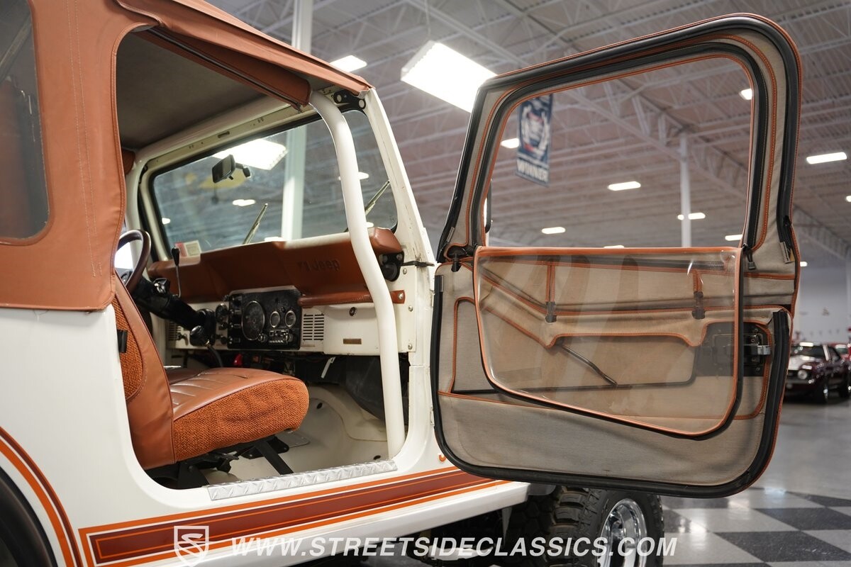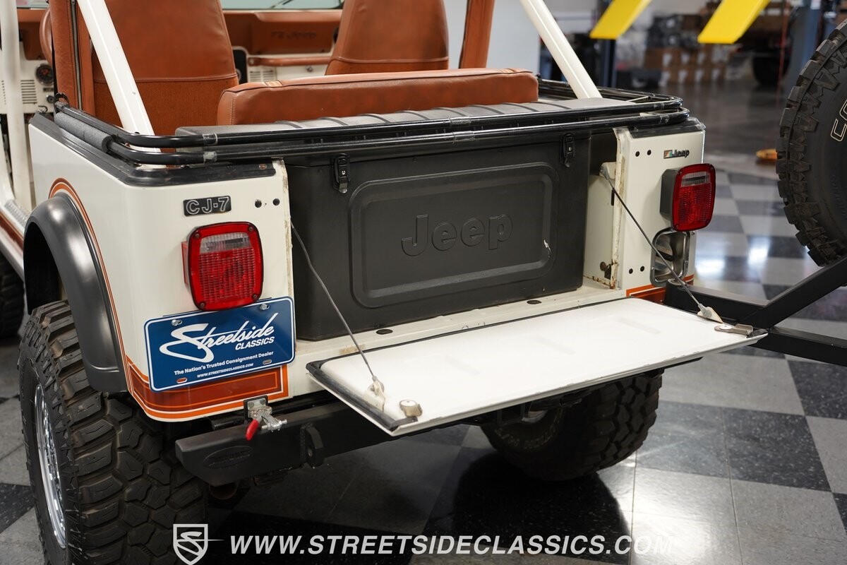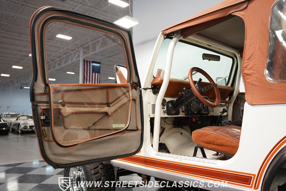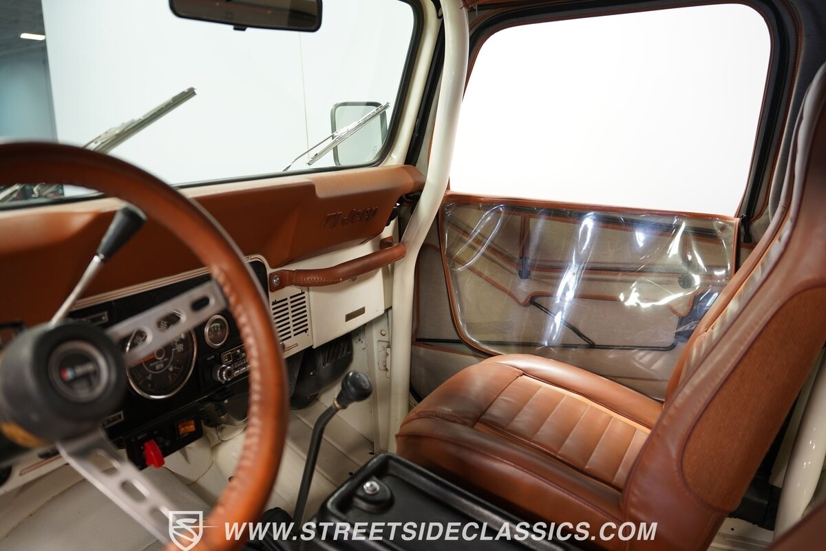 This 1981 Jeep CJ7 Laredo is a rugged off-road warrior, forged in the Arizona desert and now ready to conquer new terrain. Its white exterior, adorned with vibrant orange Laredo decals, exudes classic Jeep charisma. The 4.5-inch lift kit gives this CJ7 an imposing stance, complemented by chrome 15-inch wheels wrapped in beefy 33x12.50LT15 Cooper tires. A full soft top and doors, along with a bikini top option, offer versatile protection from the elements. The DirtWorx front winch mount bumper, housing a factory AMC Jeep Warn Winch M8274, stands ready for any obstacle, while KC lights illuminate the path ahead.