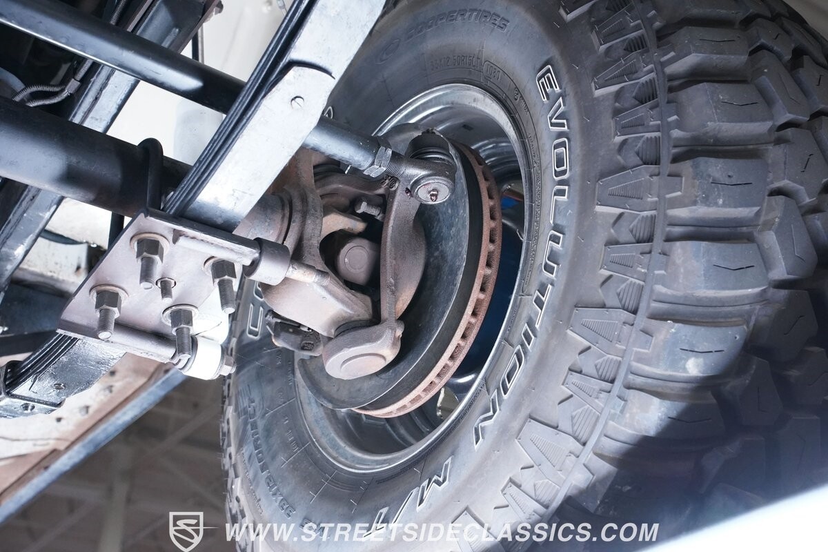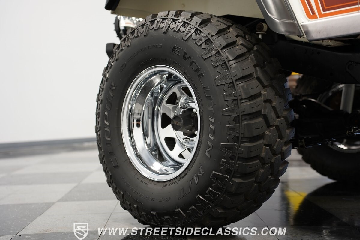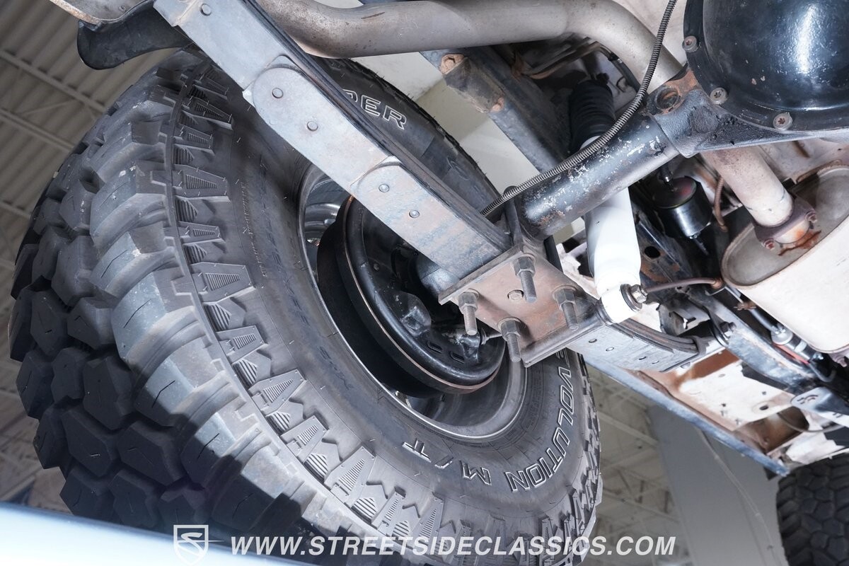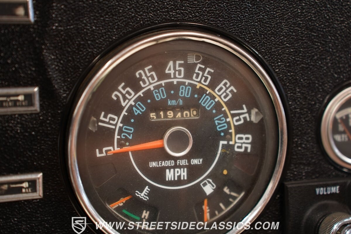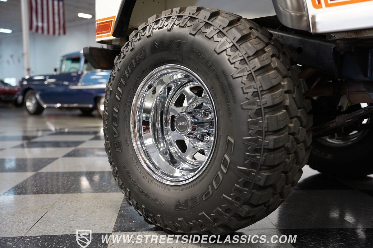 Under the hood, a freshly overhauled 304 AMC V8 engine roars to life, mated to a rebuilt 3-speed automatic transmission. This powerplant boasts roller rockers, an Isky custom ground camshaft, and a .30 overbore, all balanced for optimal performance. An Edelbrock intake with Howell fuel injection and MSD ignition system ensure reliable power delivery. The drivetrain is further enhanced by a rebuilt rear axle featuring new axles and a Trac-Lok positraction differential. Power steering and power disc brakes up front provide confident control, while the dual exhaust with aftermarket mufflers produces a satisfying growl.