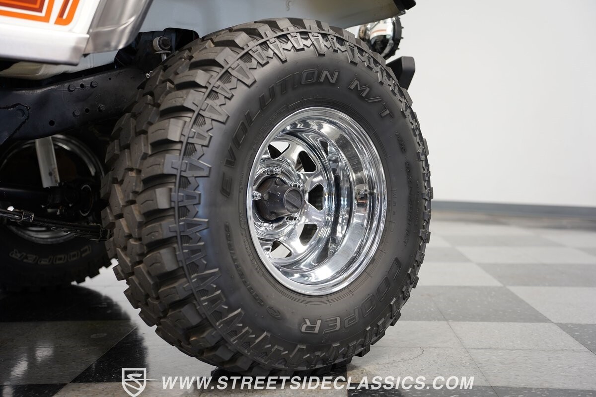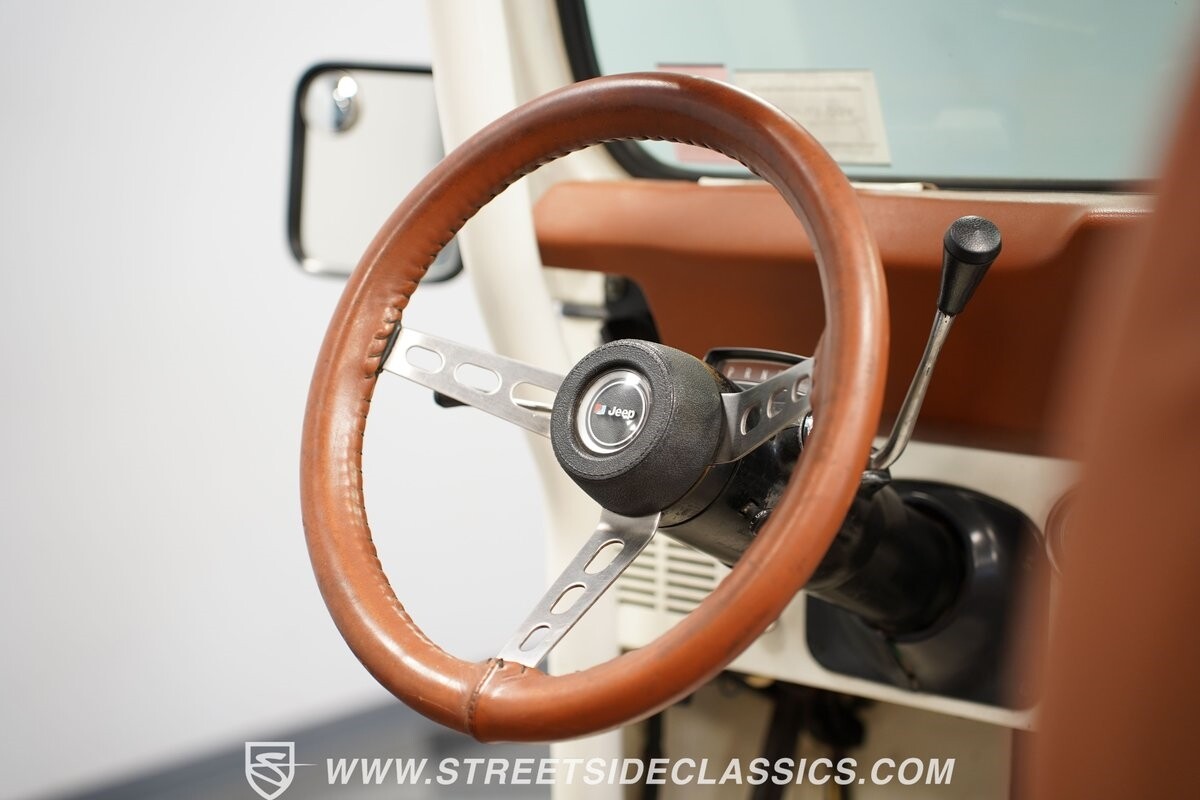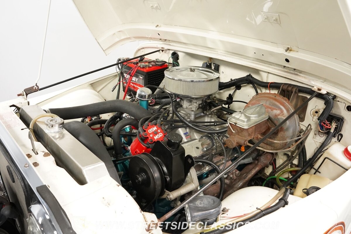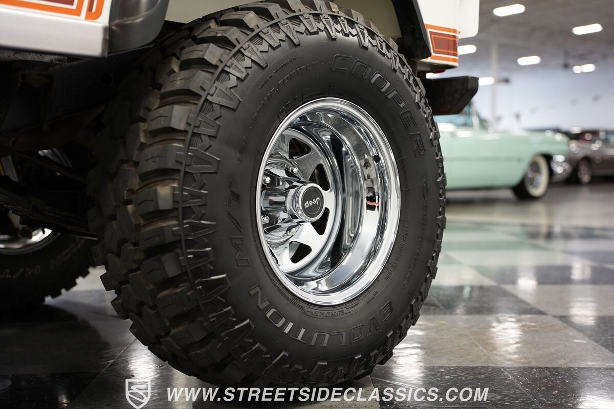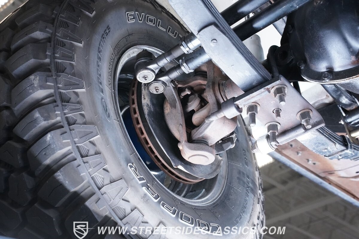 Under the hood, a freshly overhauled 304 AMC V8 engine roars to life, mated to a rebuilt 3-speed automatic transmission. This powerplant boasts roller rockers, an Isky custom ground camshaft, and a .30 overbore, all balanced for optimal performance. An Edelbrock intake with Howell fuel injection and MSD ignition system ensure reliable power delivery. The drivetrain is further enhanced by a rebuilt rear axle featuring new axles and a Trac-Lok positraction differential. Power steering and power disc brakes up front provide confident control, while the dual exhaust with aftermarket mufflers produces a satisfying growl.