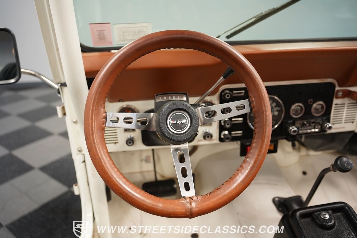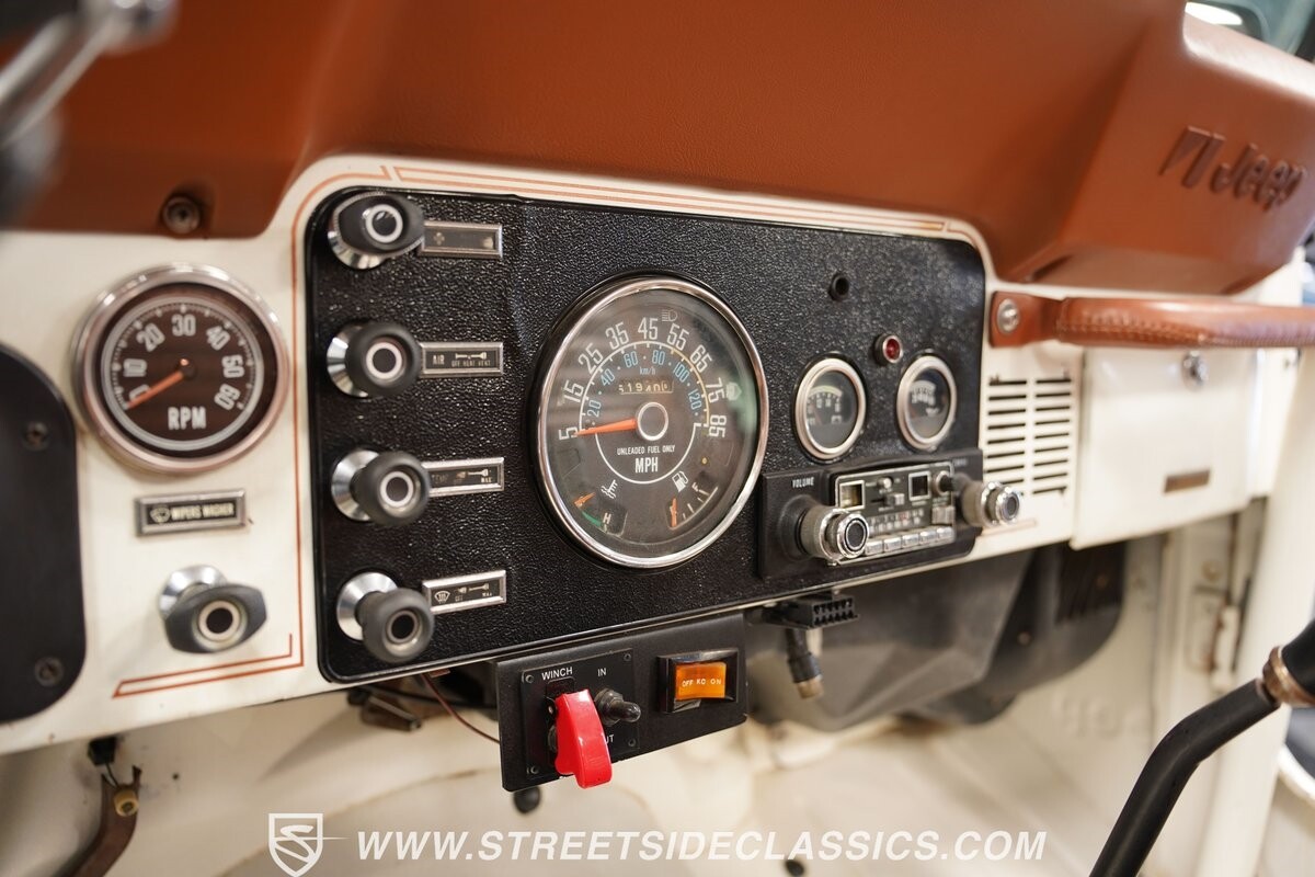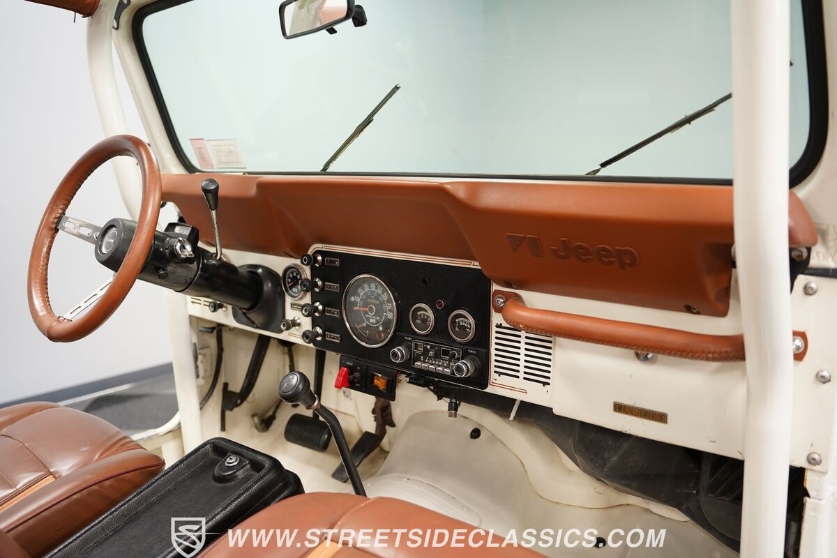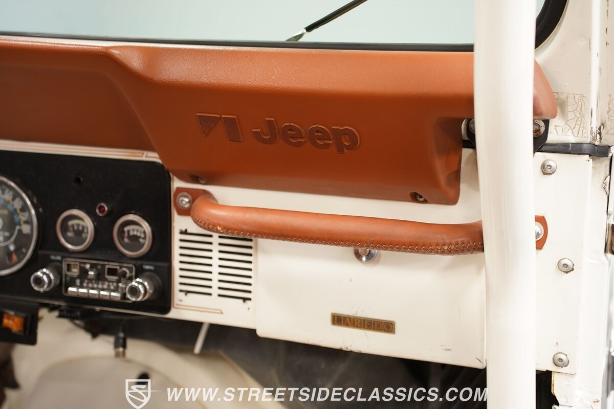 Inside, the tan vinyl interior maintains its original Laredo style, with bucket seats that provide comfort for trail adventures, while the factory Jeep rear storage bin and center console offer practicality. The dash houses a rare factory working JEEP CB/Radio combo, perfect for staying connected on remote expeditions. A tilt steering column enhances driver comfort, and the full front roll bar with padding adds an extra layer of safety. The rhino-lined floor showcases durability, ready for mud-caked boots after a day of off-roading.