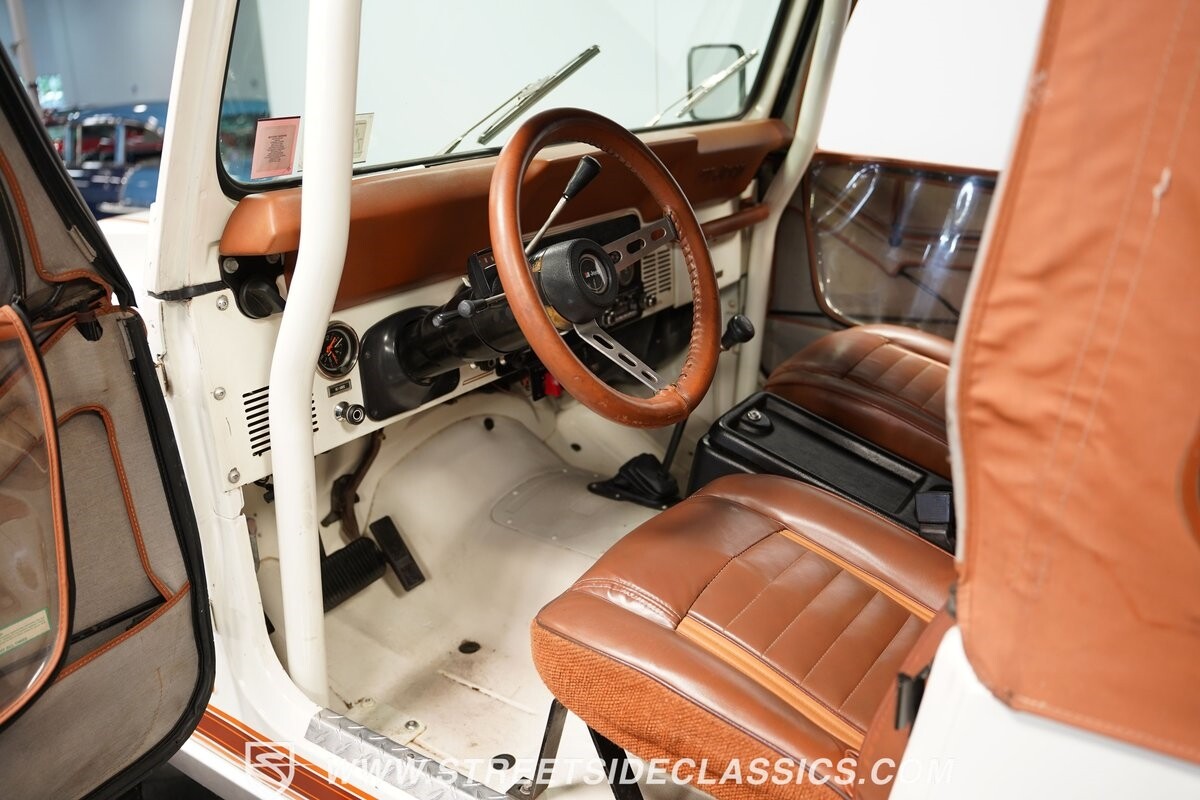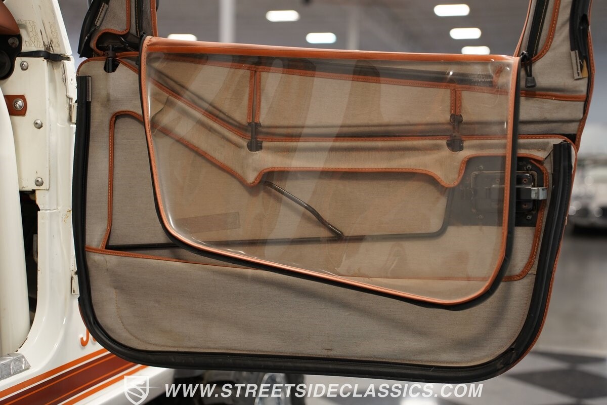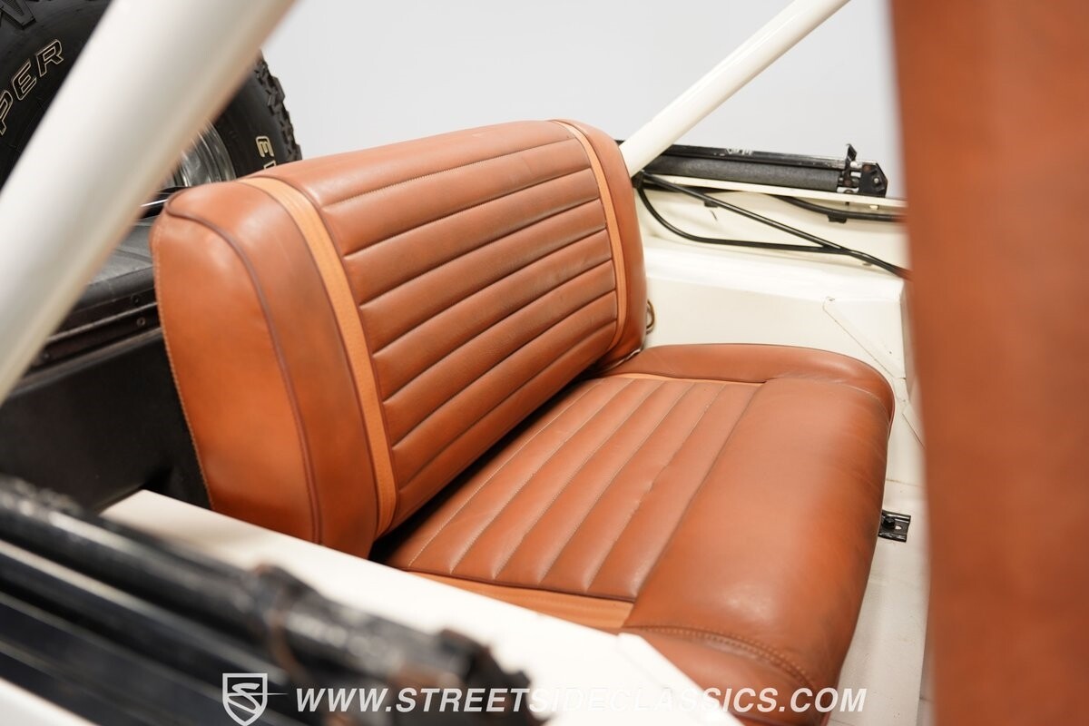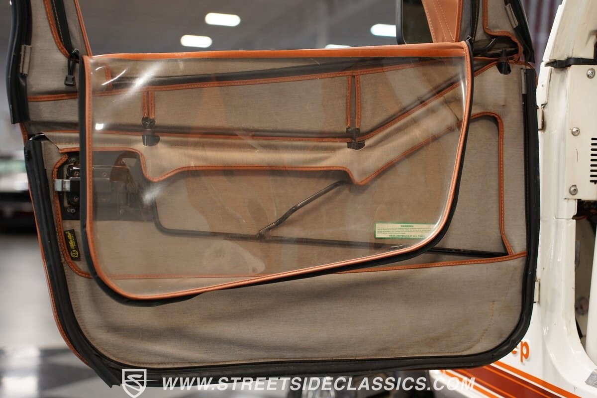 Inside, the tan vinyl interior maintains its original Laredo style, with bucket seats that provide comfort for trail adventures, while the factory Jeep rear storage bin and center console offer practicality. The dash houses a rare factory working JEEP CB/Radio combo, perfect for staying connected on remote expeditions. A tilt steering column enhances driver comfort, and the full front roll bar with padding adds an extra layer of safety. The rhino-lined floor showcases durability, ready for mud-caked boots after a day of off-roading.