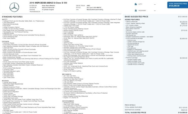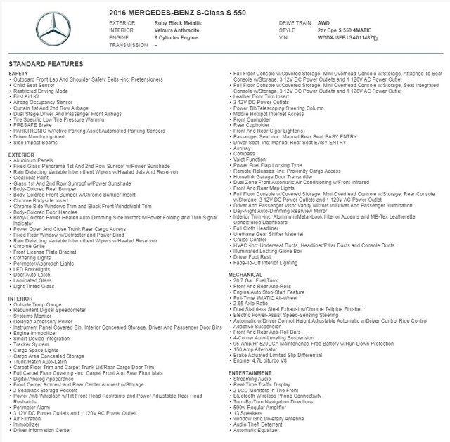 $134,595 ORIGINAL MSRP!! 2016 MERCEDES-BENZ S 550 COUPE 4MATIC AWD, RUBY BLACK METALLIC, DESIGNO BLACK EXCLUSIVE NAPPA LEATHER, WOOD/LEATHER STEERING WHEEL, 20-INCH 5-SPOKE WHEELS, BLACK DINAMICA HEADLINER, BURL WALNUT WOOD TRIM, SPLITVIEW, DRIVER ASSISTANCE PACKAGE, PREMIUM PACKAGE, DISTRONIC PLUS, CENTER CONSOLE STORAGE BOX, SPEED LIMIT ASSIST, CMS REAR, PRE-SAFE PLUS, STEERING ASSIST, ACTIVE BLIND SPOT ASSIST, ACTIVE LANE KEEPING ASSIST, VARIABLE HEATED & COOLED DRIVING DYNAMIC FRONT SEATS W/ MASSAGE, HEAD UP DISPLAY, NAVIGATION, BACKUP CAMERA W/ BIRDS EYE VIEW1-OWNER, CLEAN CARFAX!! This vehicle will be reviewed by an independent certified mechanic in accordance with PA state inspection regulations. If for any reason this vehicle does not pass inspection it will be noted. !!PLEASE CONTACT OUR SALES TEAM AT 877-864-0274 WITH ANY QUESTIONS!! We are pleased to show you another great opportunity! Sky Motor Cars is in the wholesale business and that represents the majority of what we do. When we have a vehicle this nice we present it to the public. Our turn time is quick and depending on auction schedules we may end listings early and take the vehicle to a dealer-only auction. Do not hesitate if you are interested! We have supplied many detailed photos to give you an accurate sense of just how nice this one is! !!A VARIETY OF EXTENDED WARRANTY OPTIONS ARE AVAILABLE!! !!NATIONWIDE SHIPPING & FINANCING ARE AVAILABLE!! This is a previously enjoyed vehicle so there MAY be a few light scratches and small chips around the vehicle. Please study the photos provided. Anything unusual or significant will be shown in the pictures. PLEASE NOTE THAT UNLESS SPECIFIED OUR VEHICLES ARE NOT MATTE-FINISHED. THE PICTURES OFTEN SHOW THE REFLECTION OF OUR PHOTO BOOTH CURTAINS IN SHINY PAINT AND THAT CAN MAKE THE FINISH APPEAR DULL. Also, note there are many shadows cast on the vehicle due to the conditions in which the photos were taken. If you are unclear of anything please contact us PRIOR to purchasing!