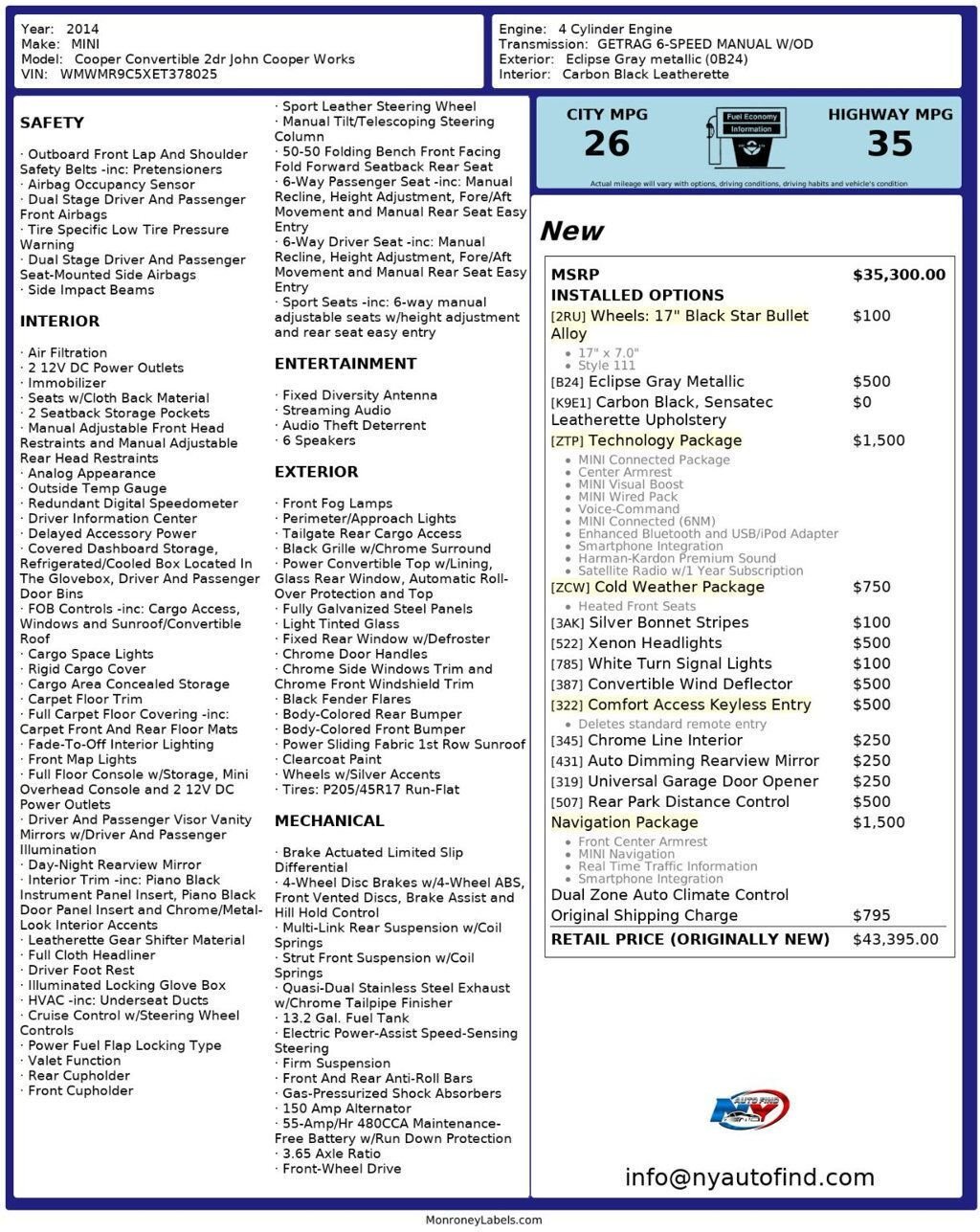 Take a look at this 2014 Eclipse Gray Metallic MINI Cooper Convertible John Cooper Works with Carbon Black Leatherette Interior, a Clean Carfax and only 89,215 miles. Would you like a car with a very clean history, low mileage, amazing looks, gorgeous wheels and a boat load of amazing options? If so, this is the car for you. Just take a look at those pictures. It's a dream come true. It comes equipped with a 1.6L 4-cylinder engine paired to a 6-speed Manual Transmission, Navigation Package (with MINI Navigation, Front Center Armrest, Real Time Traffic Information, Smartphone Integration), 17 Black Star Bullet Alloy Wheels, Technology Package (with MINI Connected Package, MINI Visual Boost, Harman/Kardon Premium Sound, Center Armrest, MINI Wired Package, Voice-Command, Enhanced Bluetooth and USB, Smartphone Integration, Harman Kardon Premium Sound, Satellite Radio), Silver Bonnet Stripes, Xenon Headlights, White Turn Signal Lights, Comfort Access Keyless Entry, Chrome Line Interior, Auto Dimming Rearview Mirror, Universal Garage Door Opener, Rear Park Distance Control, Dual Zone Automatic Climate Control, Cruise Control, Steering Wheel Controls, AM/FM Radio, Power Windows, Power Locks, Air Conditioning and so much more. Every NY Auto Find vehicle comes with a complimentary Limited Warranty and a Carfax Vehicle Report. Our vehicles are priced to sell quickly. Please call to check availability and to schedule an appointment. -