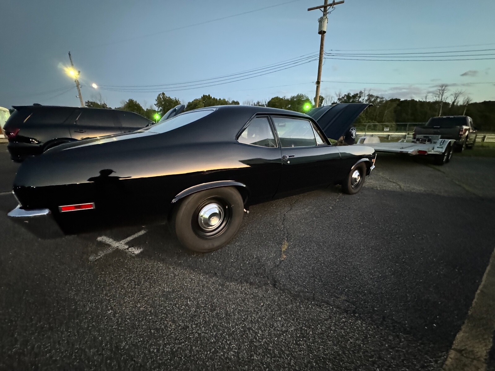 I'm selling my 1972 nova, this car was built within a year ago and everything is new. This is 100% a street car that runs on pump gas and you could drive it anywhere. The drive train is a Dart block built to a 516 cubic inch with 10:1 compression that makes 650 hp on a dyno with an under carbureted 750 cfm I added a 950 and it woke up nicely. It has an FB 400 tranny reverse manual with a tranny brake and a 8" converter with a 5000 stall converter that is very streetable. The rear has strange axcles 32 spline c clip eliminators with a 4 series carrier and 373 gears. The tank is from tanks incorporated with electric pump in the tank. The rear has a 9 way adjustable shocks with cal track split leaf and sliders, and no shackles and works extremely well!! This car on the parkway runs and drives very nice. The ignition is an MSD with delay box and is all tucked in the glove box nice and neat. The front has QA1 coil overs with adjustable shock. You can set the front end to any hight if you want to put a set of rally wheels on it for that stock look. It has wellwood disc brakes up front with drum in the rear. The body is not mint but very nice! It's never been wet sanded or polished and looks very nice. It has new full quarters, outer wheel houses, tail panel, intermediate panel, 2" cowl hood, trunk pan by previous owner does not look bad and can use a good detailing. the wheels are 15x8 with M/T 275/60/15 and the front are 15x3 1/2 with M/T 26". The rims are weld wheels with custom clips to hold the dog dish caps. The interior has a custom powder coated roll cage that is completely removable and you would never know it was there. The seats are very comfortable and recline back. Tiger cage makes a cage very similar for $3,500. The exhaust has hooker headers with 3" all the way back that sounds very good. I'm sure I"m forgetting a lot so if you has any questions please ask. Due to the age this is being sold as is. Please do not hit the buy now unless you are able to send a non refundable $500. deposit at that time. These auctions take time and cost money. Thank you for looking