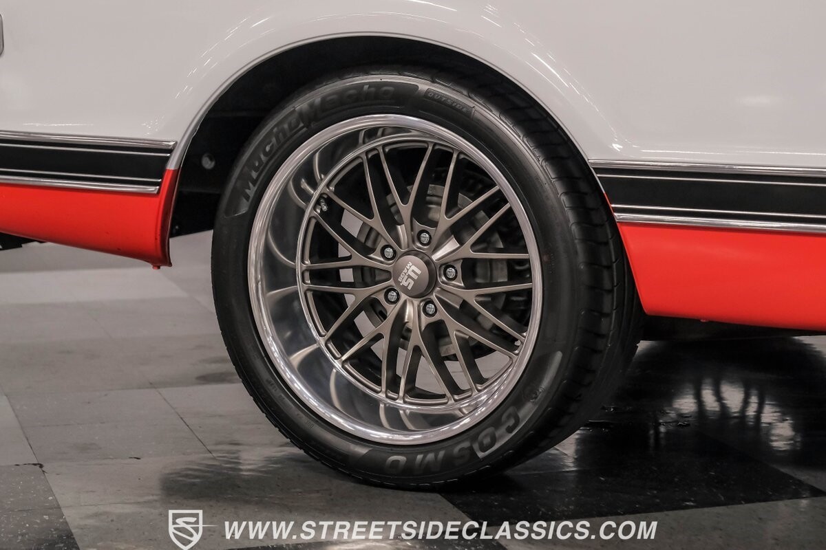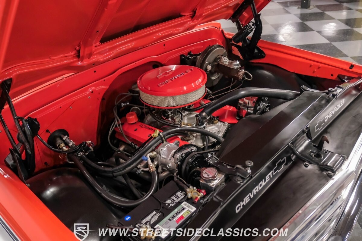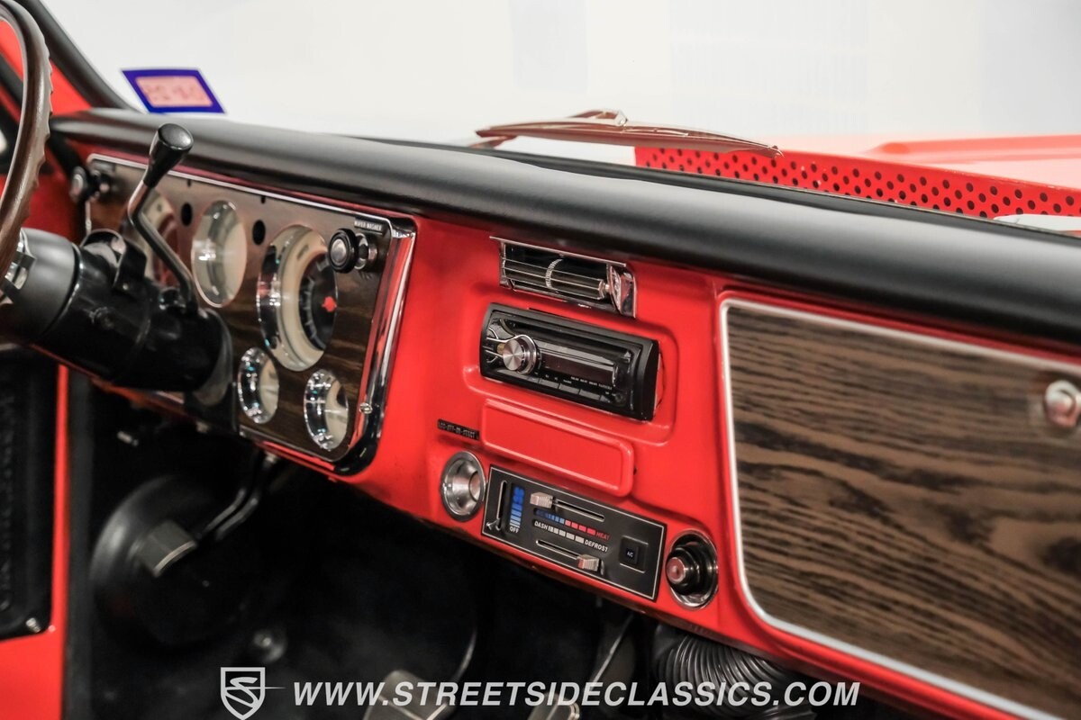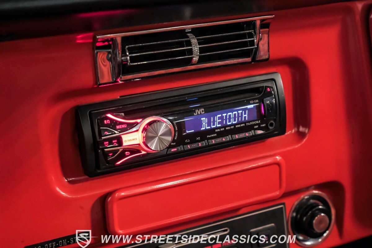 The carefully restored interior looks amazing with a black bench seat with orange and black houndstooth pattern insert, black carpets, black headliner and black CST western style door panels with woodgrain insert. Other interior highlights are a tilt steering column, freshly updated white-faced gauges, JVC AM/FM/CD/AUX/Bluetooth stereo with kick panel speakers, seat belts, Chevrolet logoed floor mats, a Chevelle SS style woodgrain sports steering wheel and an Old Air air conditioning system.