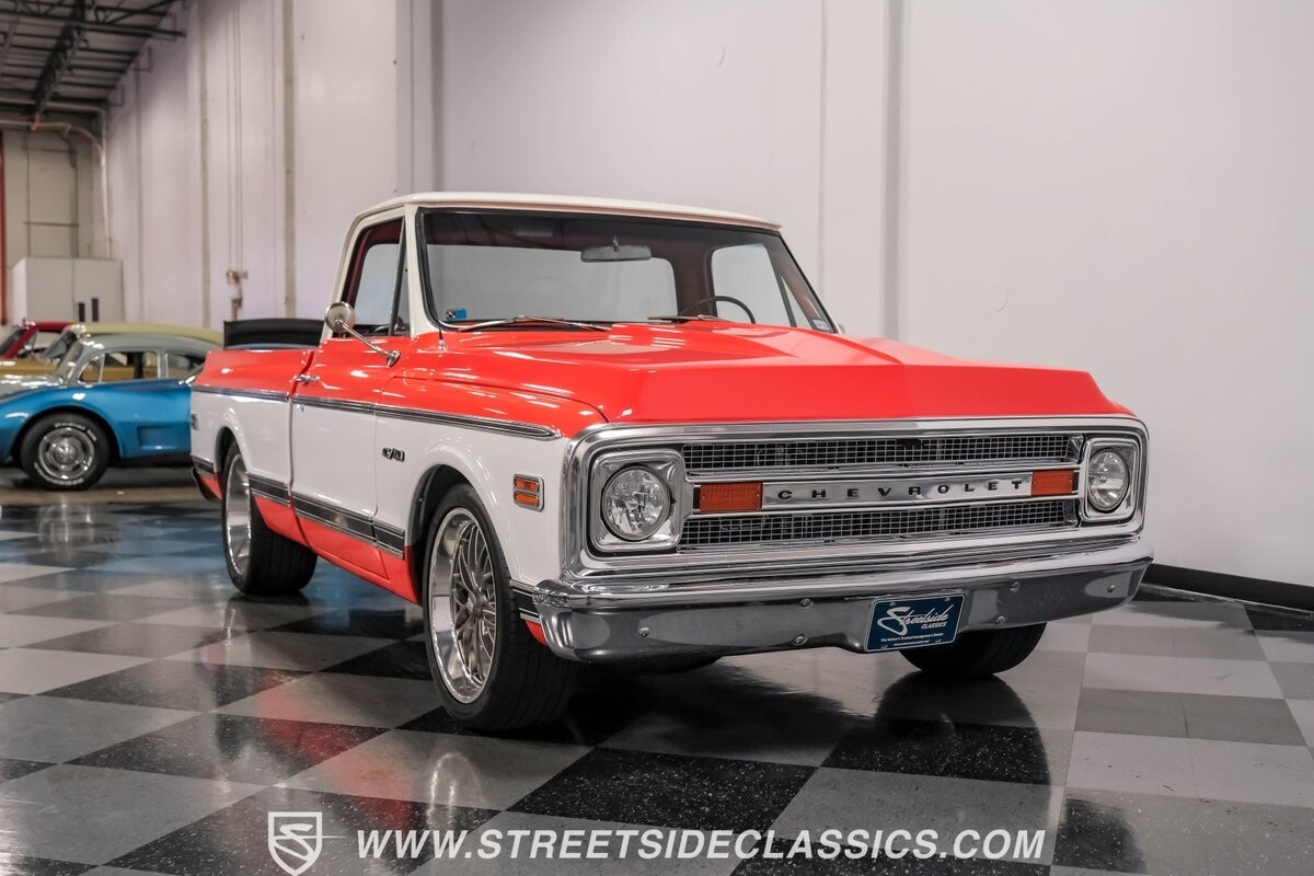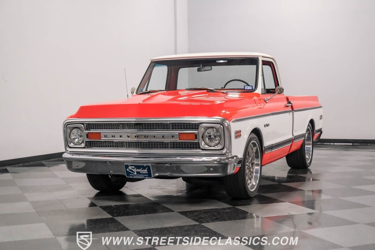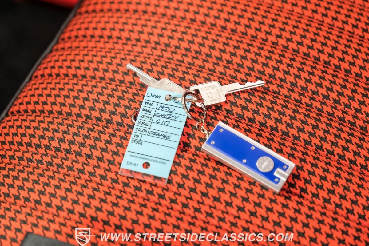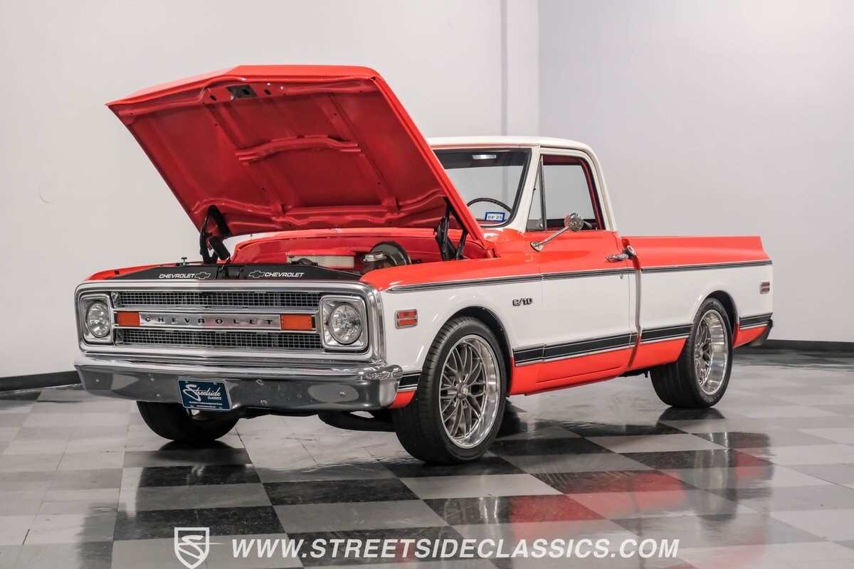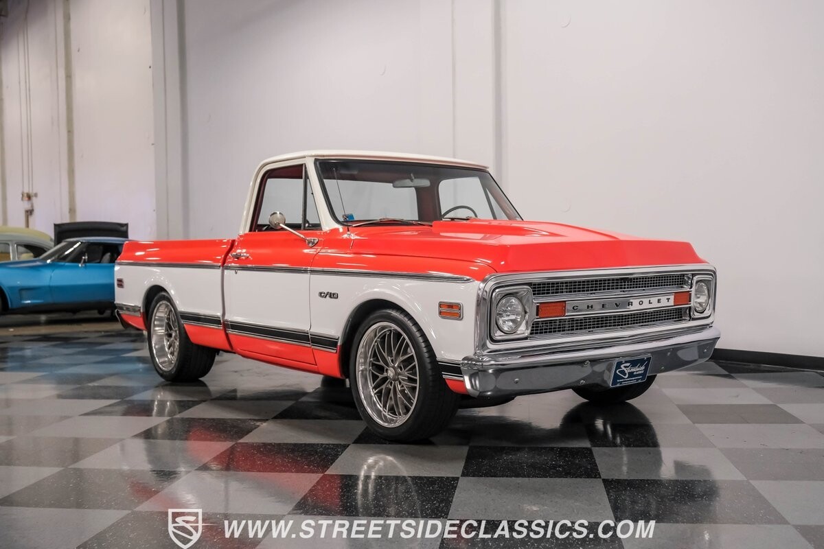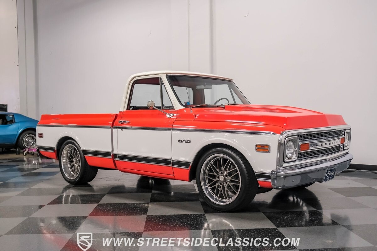 If you like 1967-1972 Chevy trucks, it does not get much better than this exceptional 1970 Chevrolet C/10 Fleetside short bed pickup. This beautifully restored truck is finished attractively in orange with a contrasting white top and side panels. The two-tone paint treatment is divided by deluxe upper and lower body side moldings that run the length of the truck, as well as the tailgate. Other exterior features include a large rear window, cowl induction hood, black lined bed, tinted glass, dual chrome mirrors and bright chrome bumpers. A set of 20-inch U.S. mag wheels with tires staggered 275/40ZR20 front and 315/35ZR20 rear give this classic truck a confidant stance.