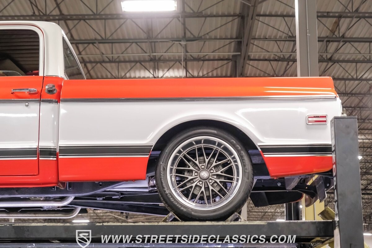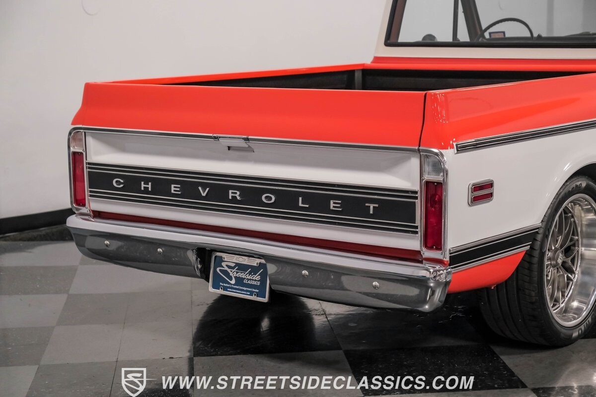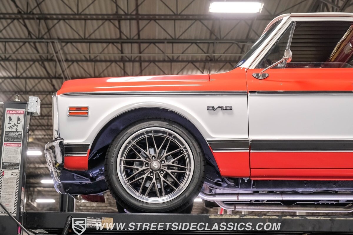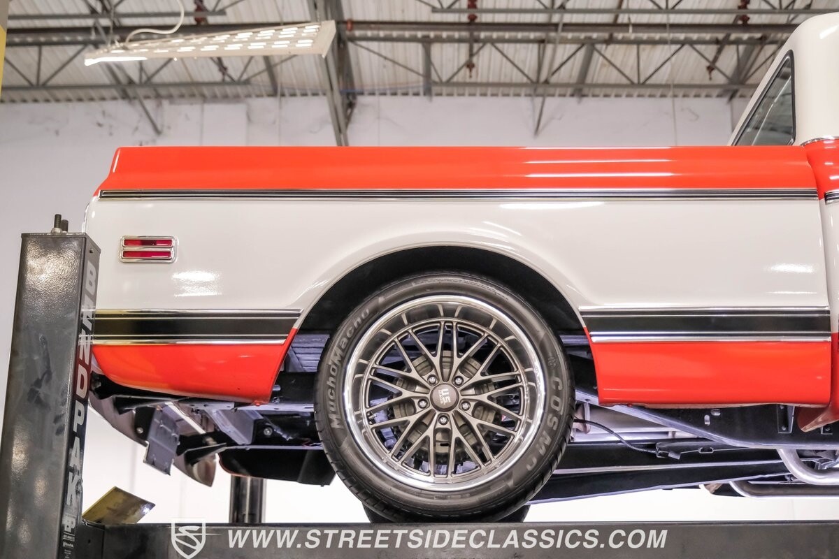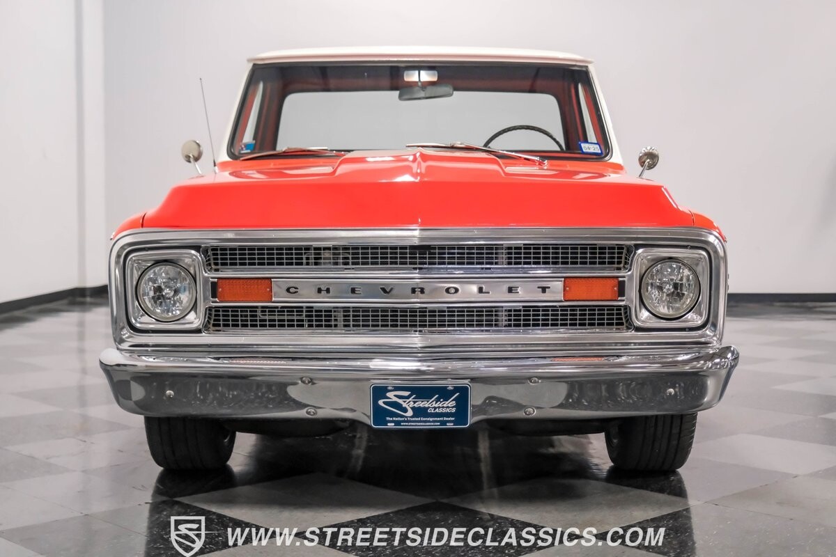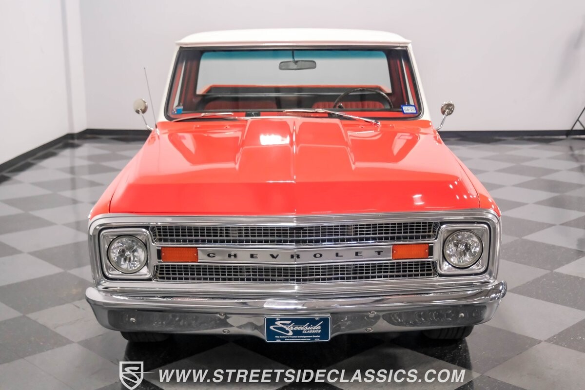 If you like 1967-1972 Chevy trucks, it does not get much better than this exceptional 1970 Chevrolet C/10 Fleetside short bed pickup. This beautifully restored truck is finished attractively in orange with a contrasting white top and side panels. The two-tone paint treatment is divided by deluxe upper and lower body side moldings that run the length of the truck, as well as the tailgate. Other exterior features include a large rear window, cowl induction hood, black lined bed, tinted glass, dual chrome mirrors and bright chrome bumpers. A set of 20-inch U.S. mag wheels with tires staggered 275/40ZR20 front and 315/35ZR20 rear give this classic truck a confidant stance.