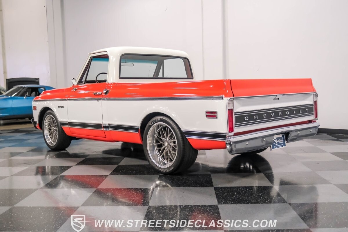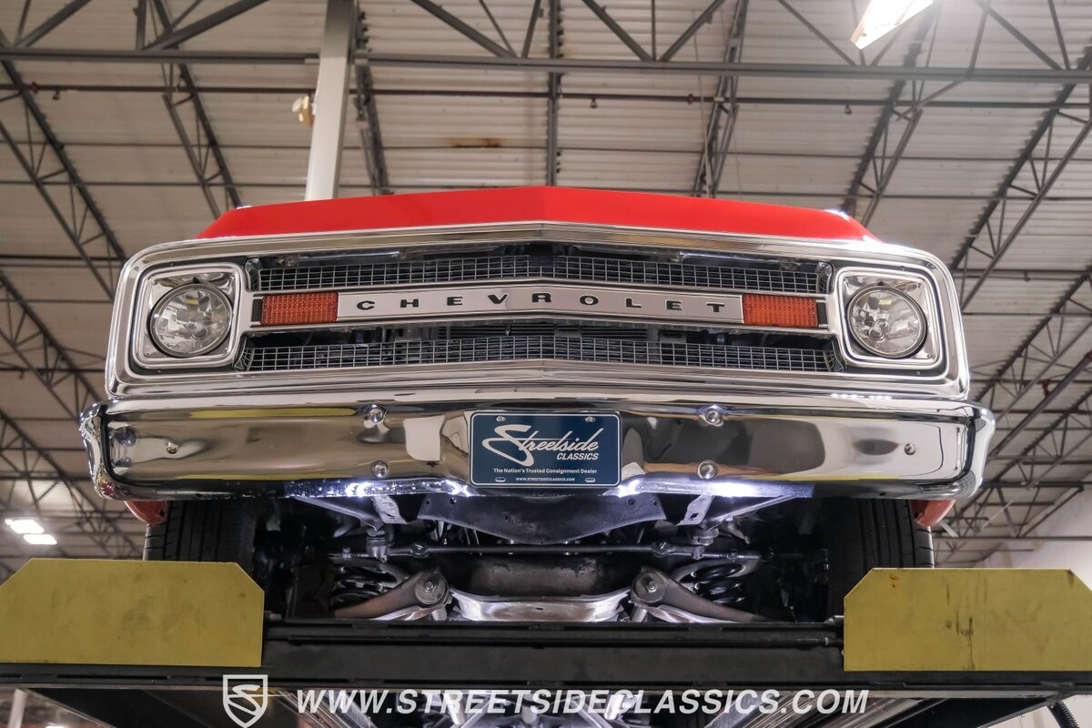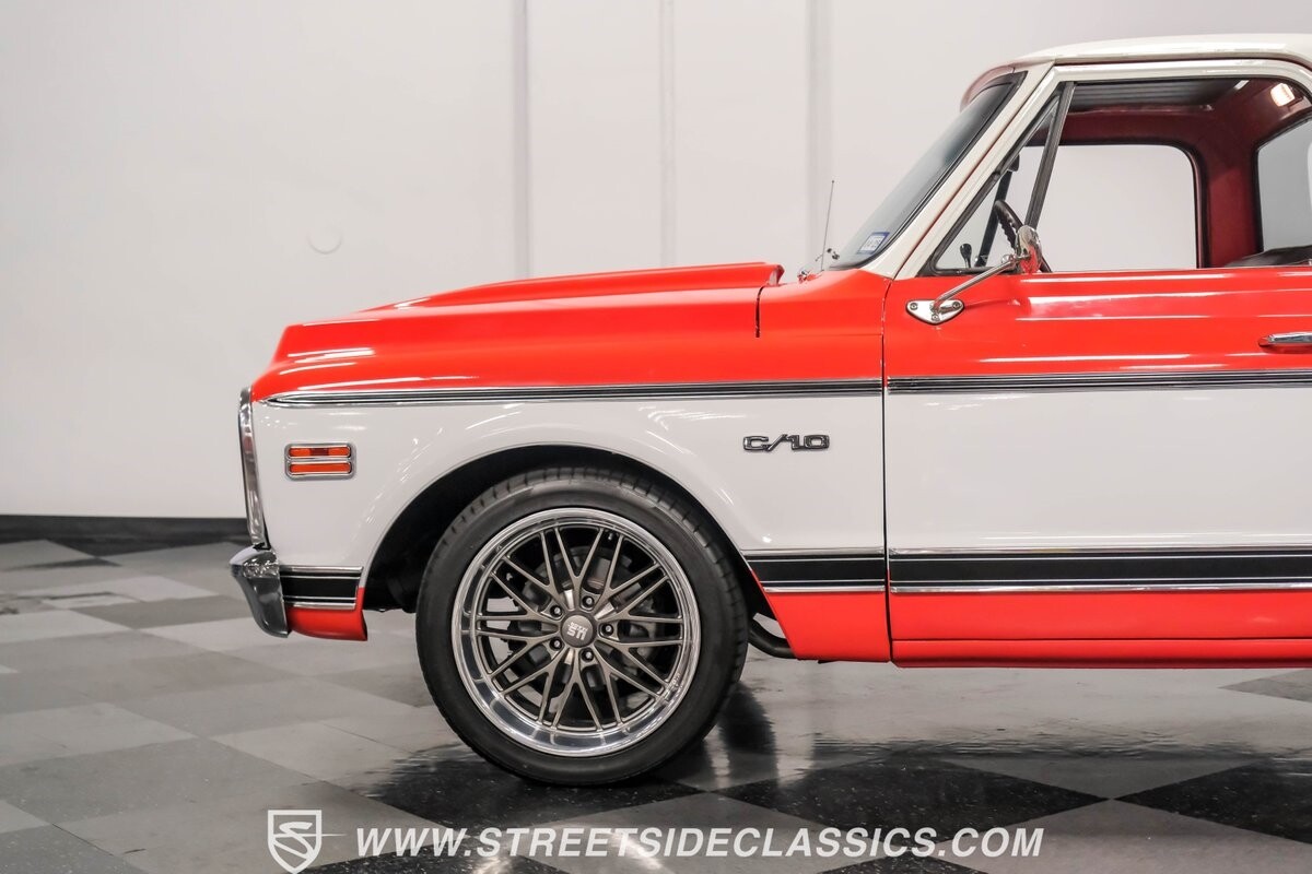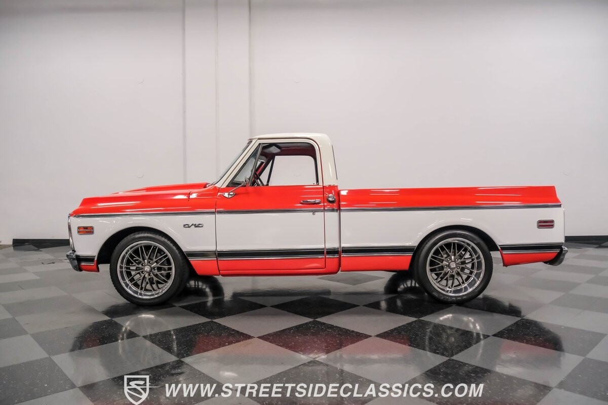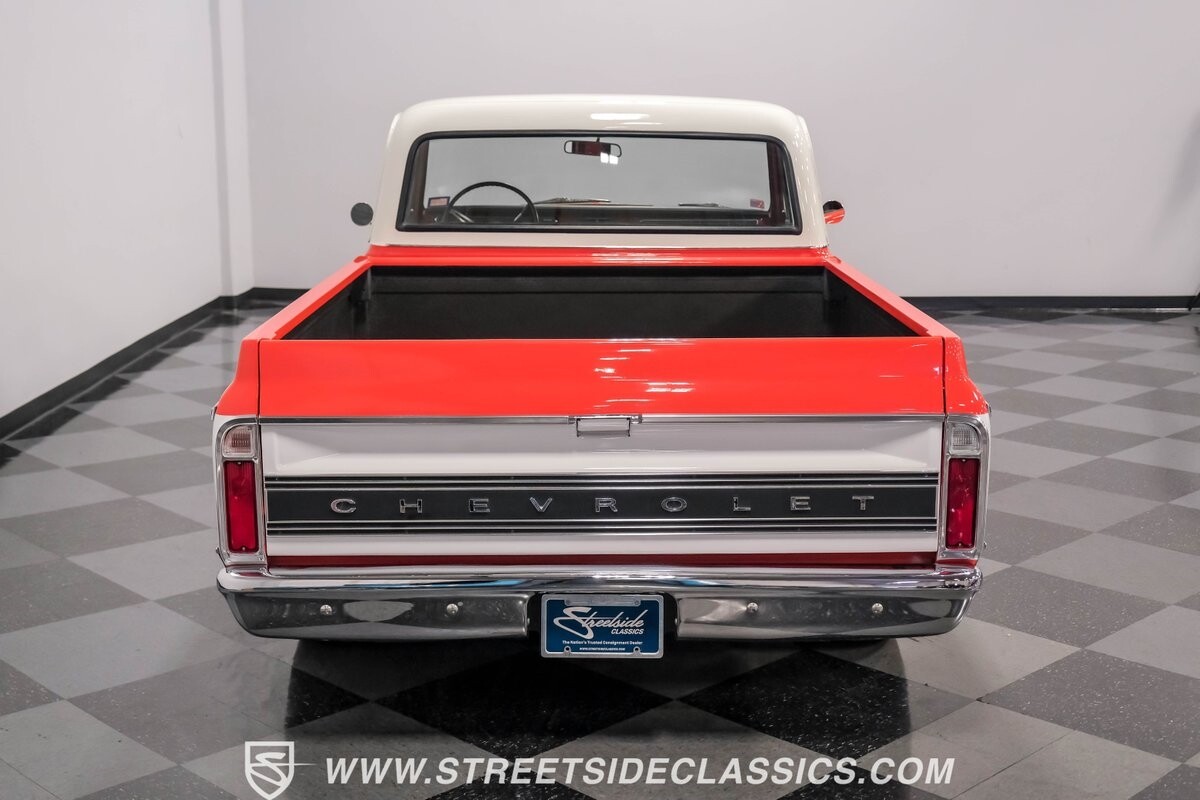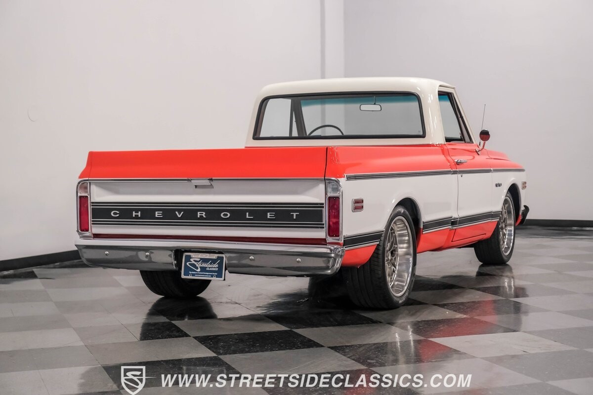 If you like 1967-1972 Chevy trucks, it does not get much better than this exceptional 1970 Chevrolet C/10 Fleetside short bed pickup. This beautifully restored truck is finished attractively in orange with a contrasting white top and side panels. The two-tone paint treatment is divided by deluxe upper and lower body side moldings that run the length of the truck, as well as the tailgate. Other exterior features include a large rear window, cowl induction hood, black lined bed, tinted glass, dual chrome mirrors and bright chrome bumpers. A set of 20-inch U.S. mag wheels with tires staggered 275/40ZR20 front and 315/35ZR20 rear give this classic truck a confidant stance.