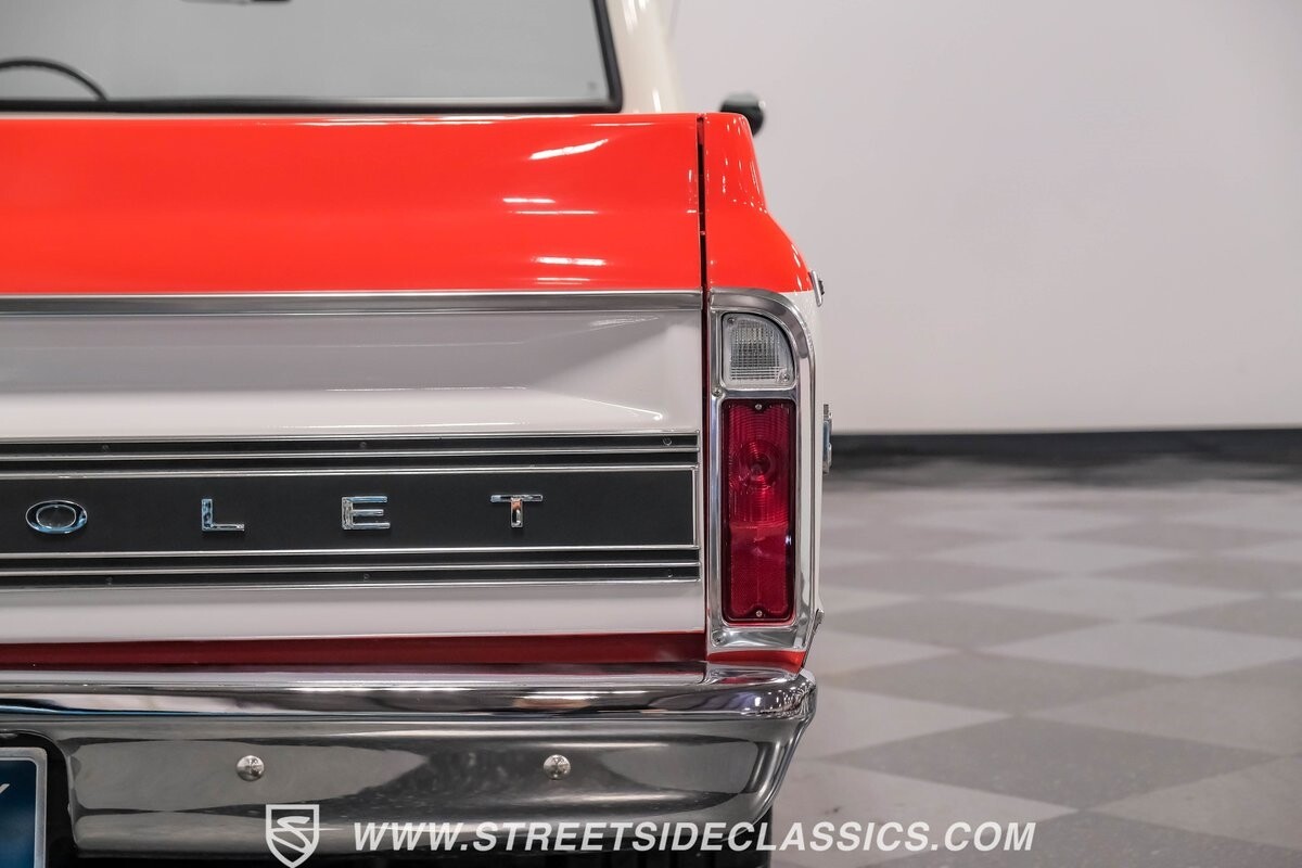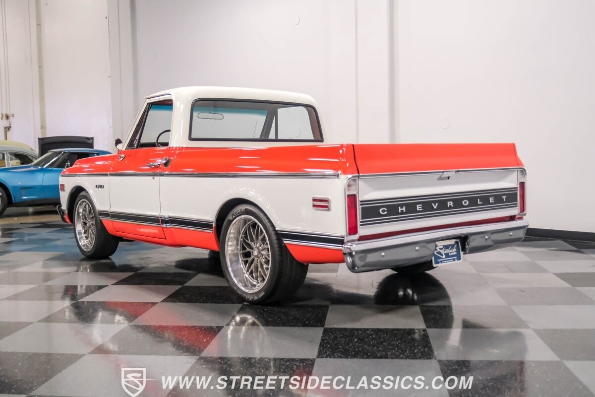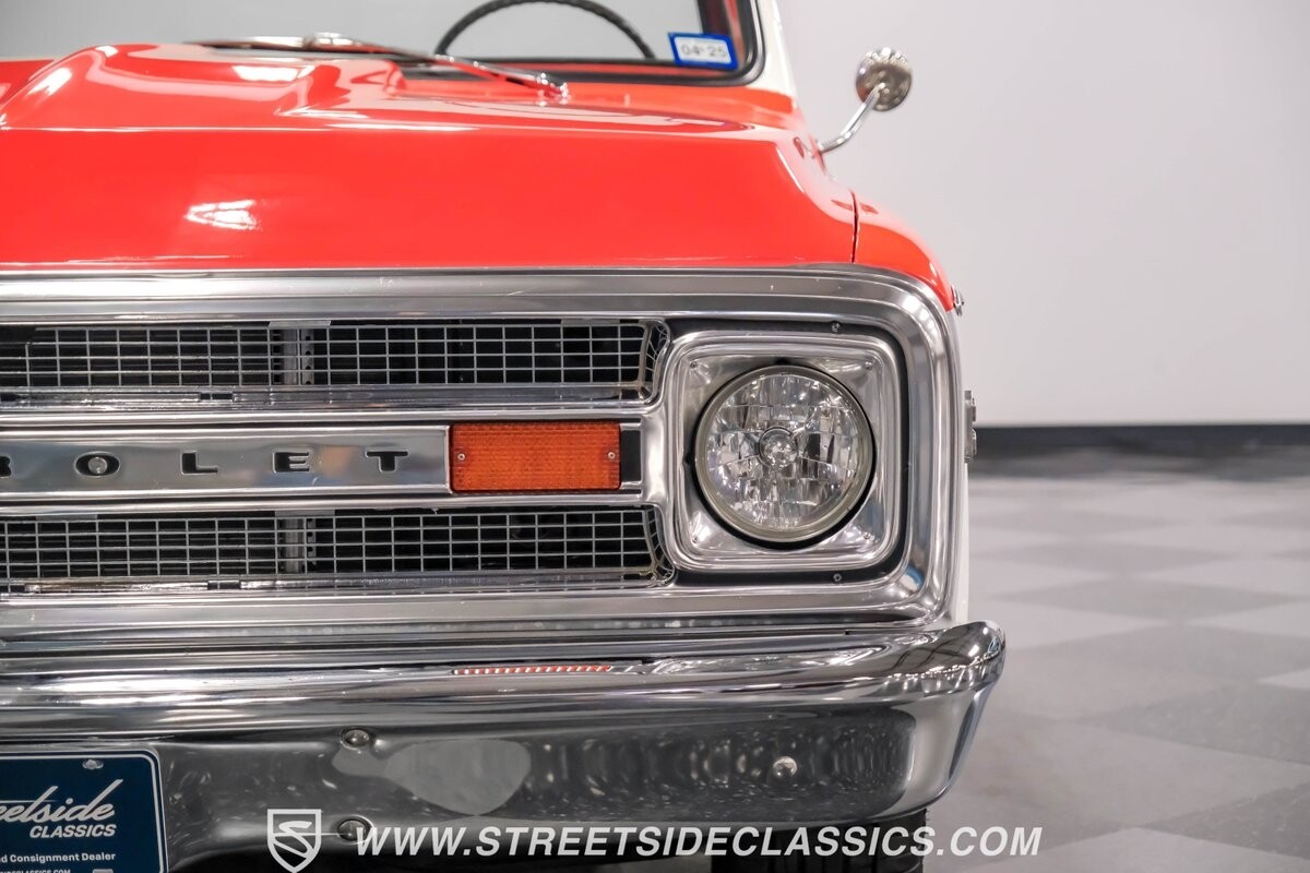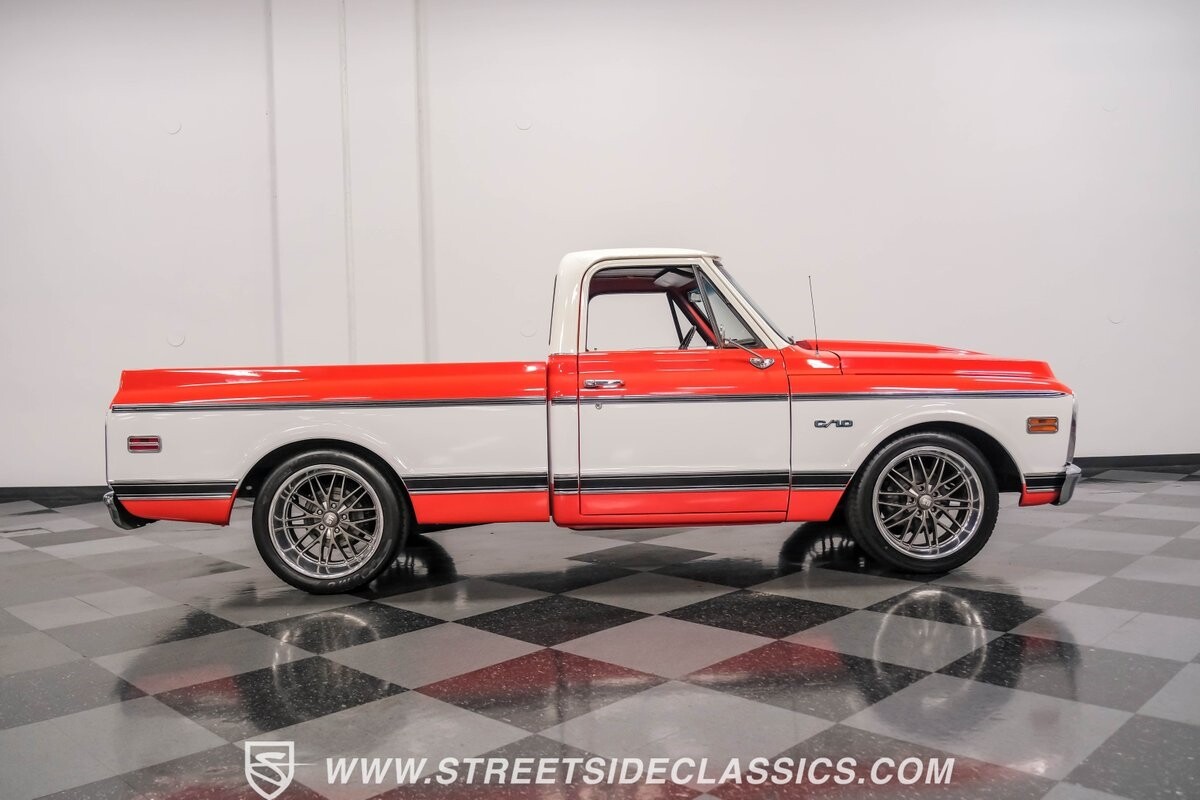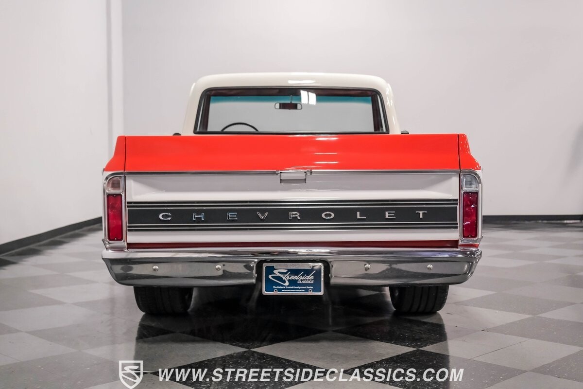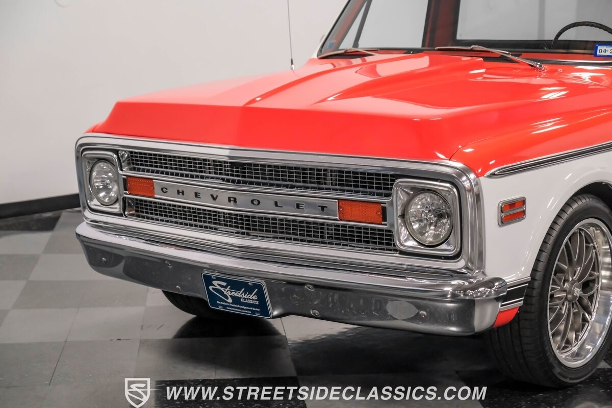 If you like 1967-1972 Chevy trucks, it does not get much better than this exceptional 1970 Chevrolet C/10 Fleetside short bed pickup. This beautifully restored truck is finished attractively in orange with a contrasting white top and side panels. The two-tone paint treatment is divided by deluxe upper and lower body side moldings that run the length of the truck, as well as the tailgate. Other exterior features include a large rear window, cowl induction hood, black lined bed, tinted glass, dual chrome mirrors and bright chrome bumpers. A set of 20-inch U.S. mag wheels with tires staggered 275/40ZR20 front and 315/35ZR20 rear give this classic truck a confidant stance.