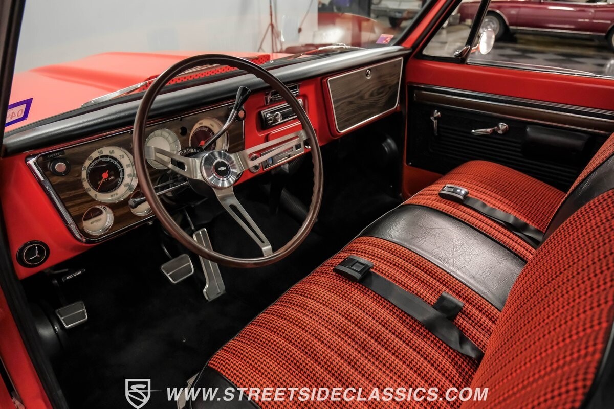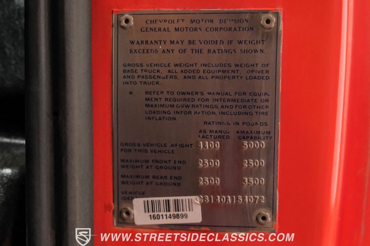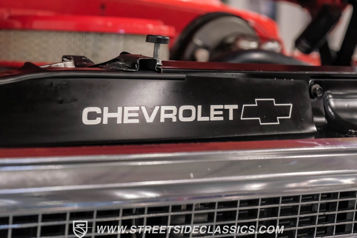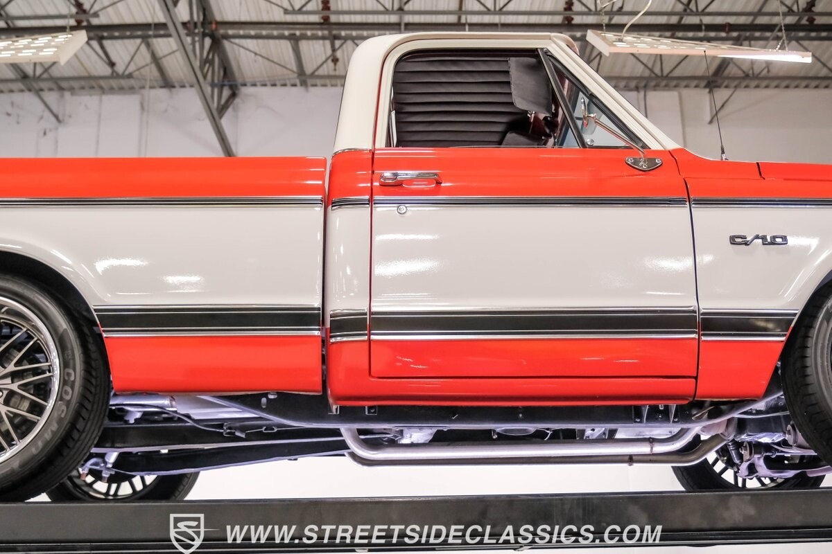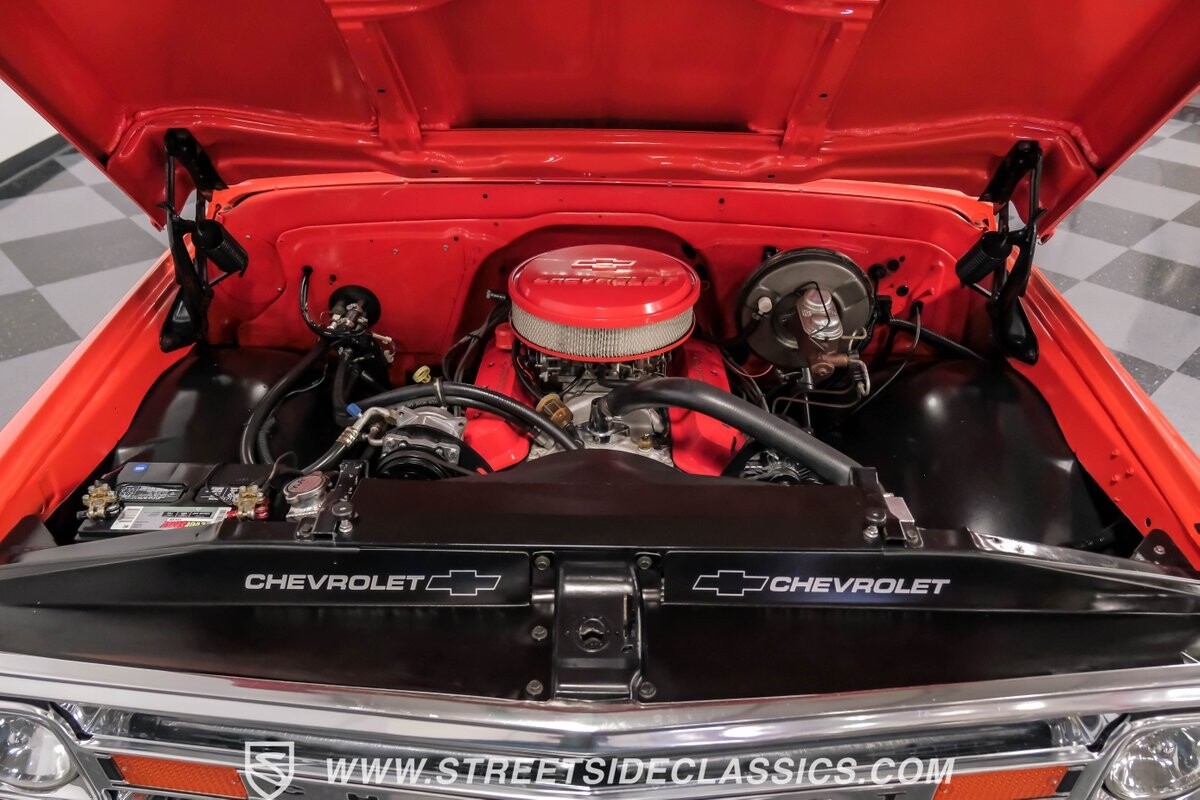 Under the cowl hood, the engine bay is highly detailed with a 5.0-litre Chevy small block engine paired with 700R4 automatic transmission that sends power back to a 12-bolt rear end. Additionally, this C/10 is equipped with an aluminum intake manifold, Edelbrock carburetor, Headman headers, great-sounding Flowmaster mufflers, power steering, power brakes with front discs and a cool orange Chevrolet air cleaner with matching valve covers.