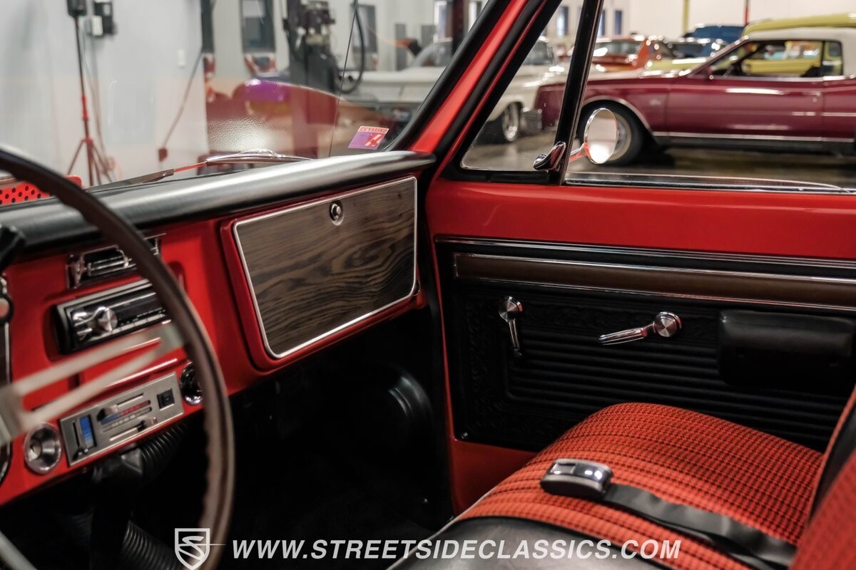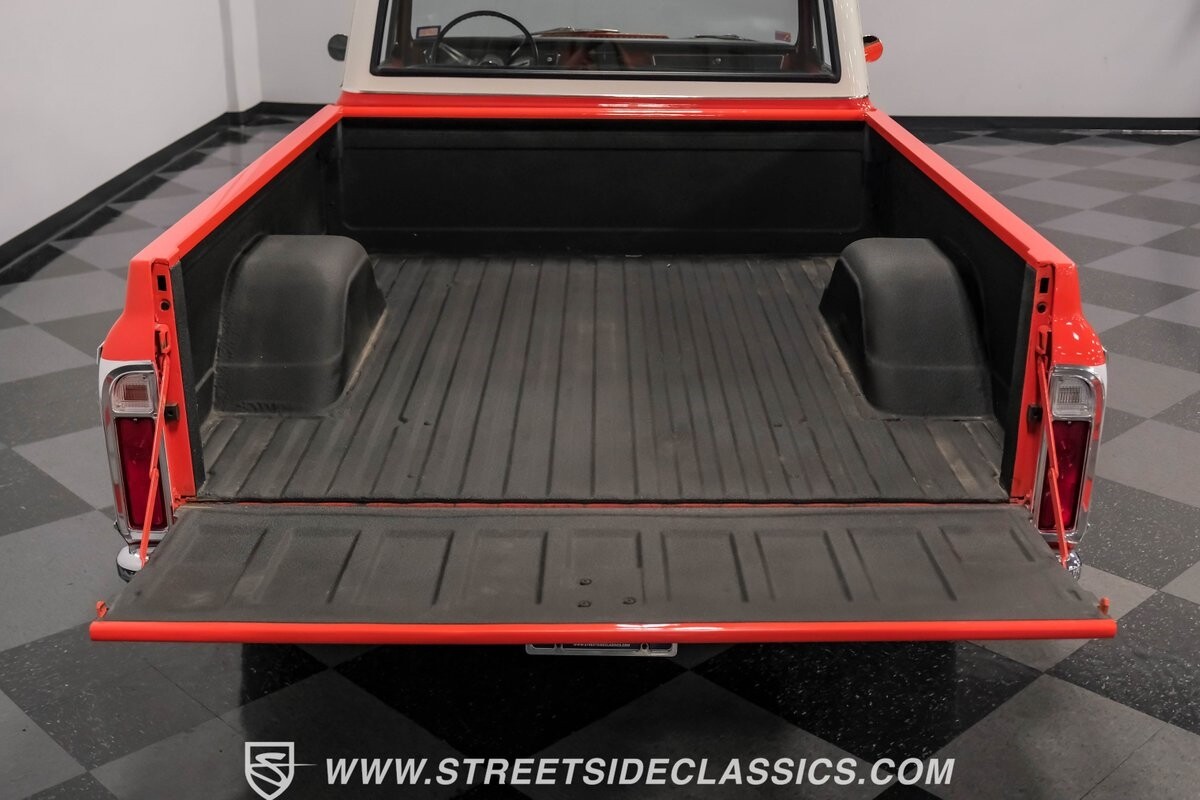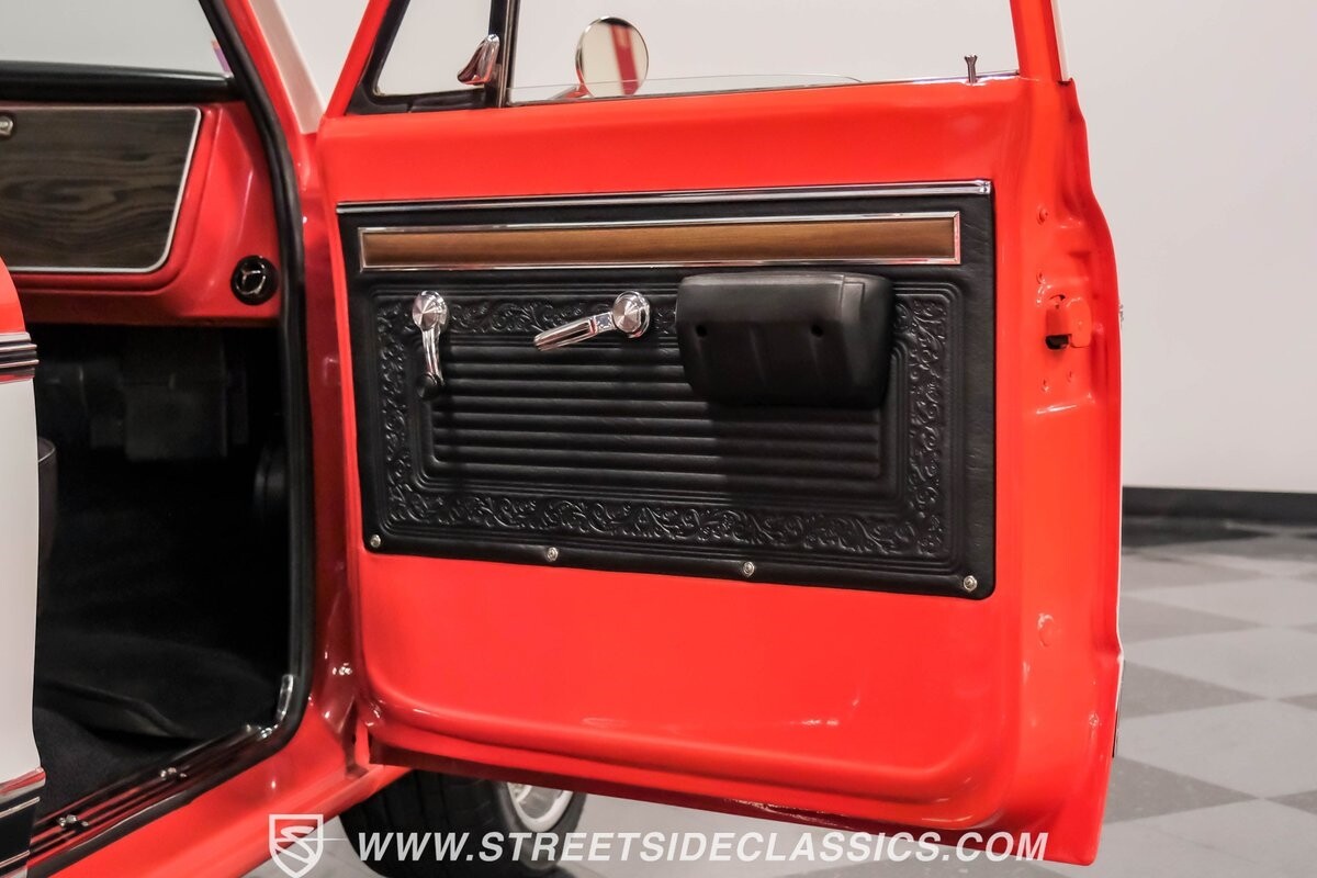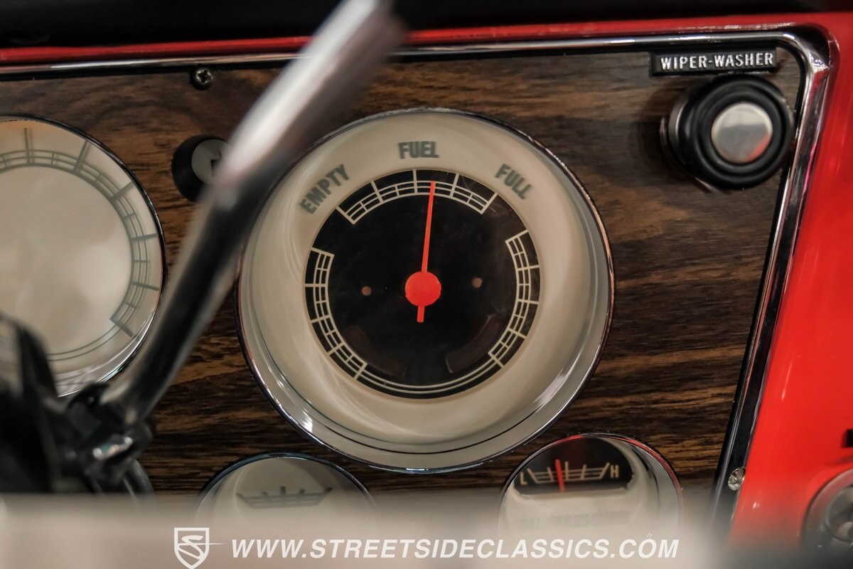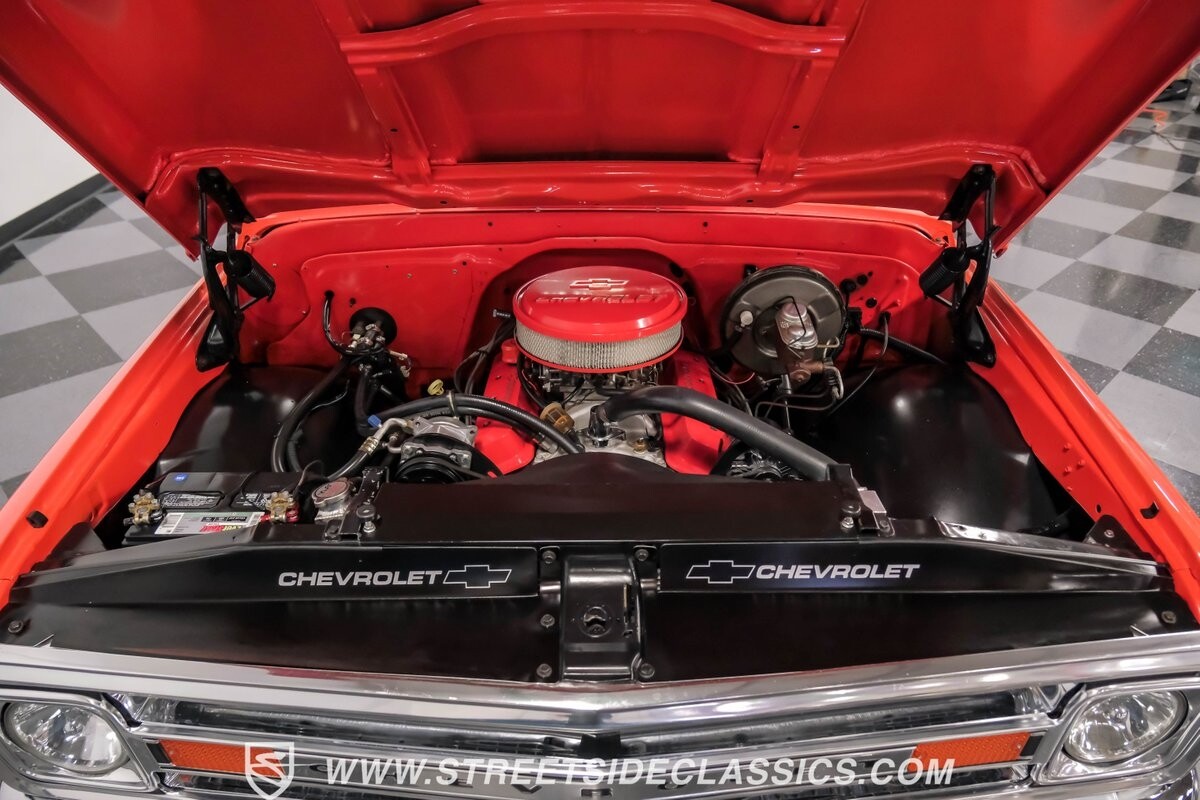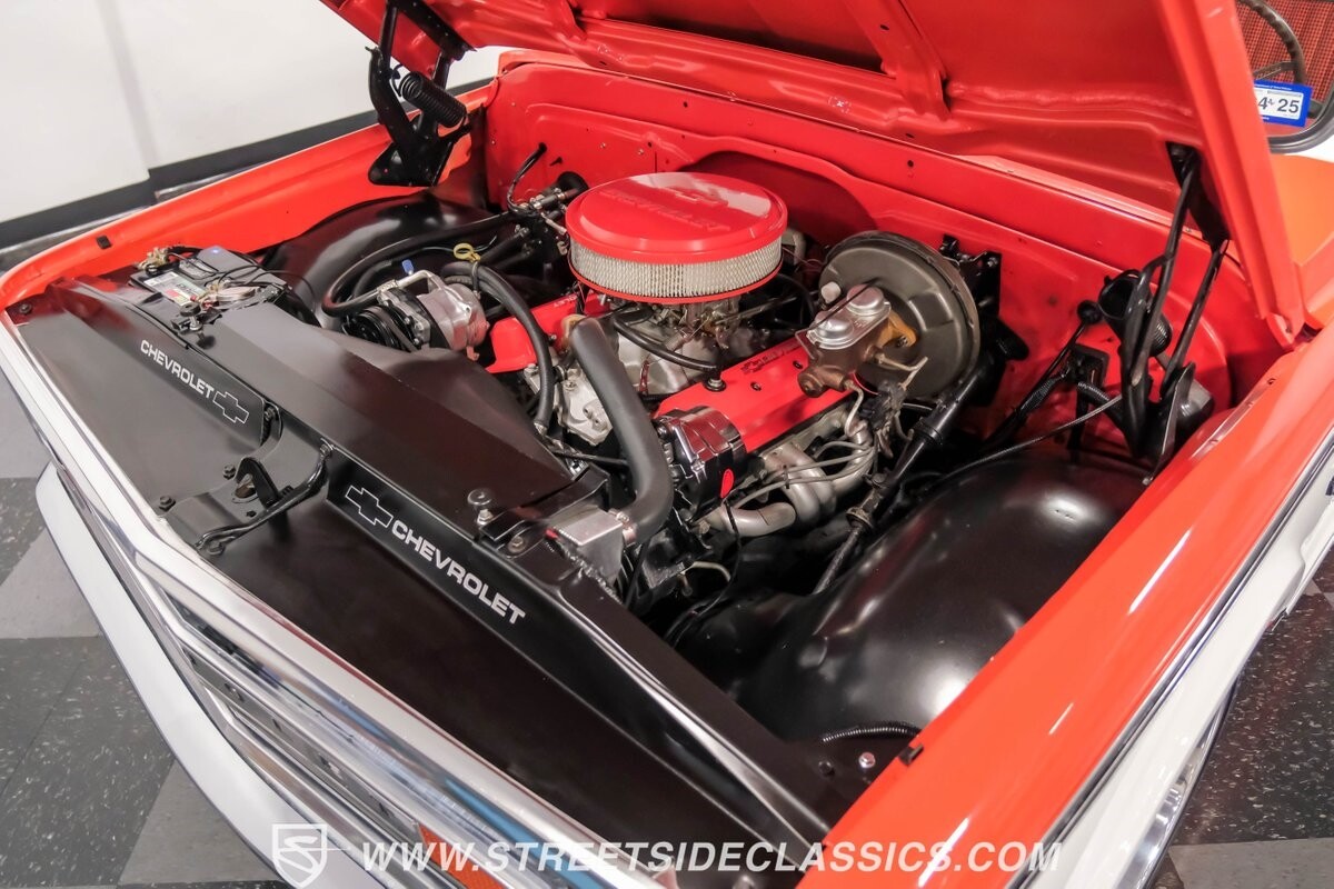 Under the cowl hood, the engine bay is highly detailed with a 5.0-litre Chevy small block engine paired with 700R4 automatic transmission that sends power back to a 12-bolt rear end. Additionally, this C/10 is equipped with an aluminum intake manifold, Edelbrock carburetor, Headman headers, great-sounding Flowmaster mufflers, power steering, power brakes with front discs and a cool orange Chevrolet air cleaner with matching valve covers.