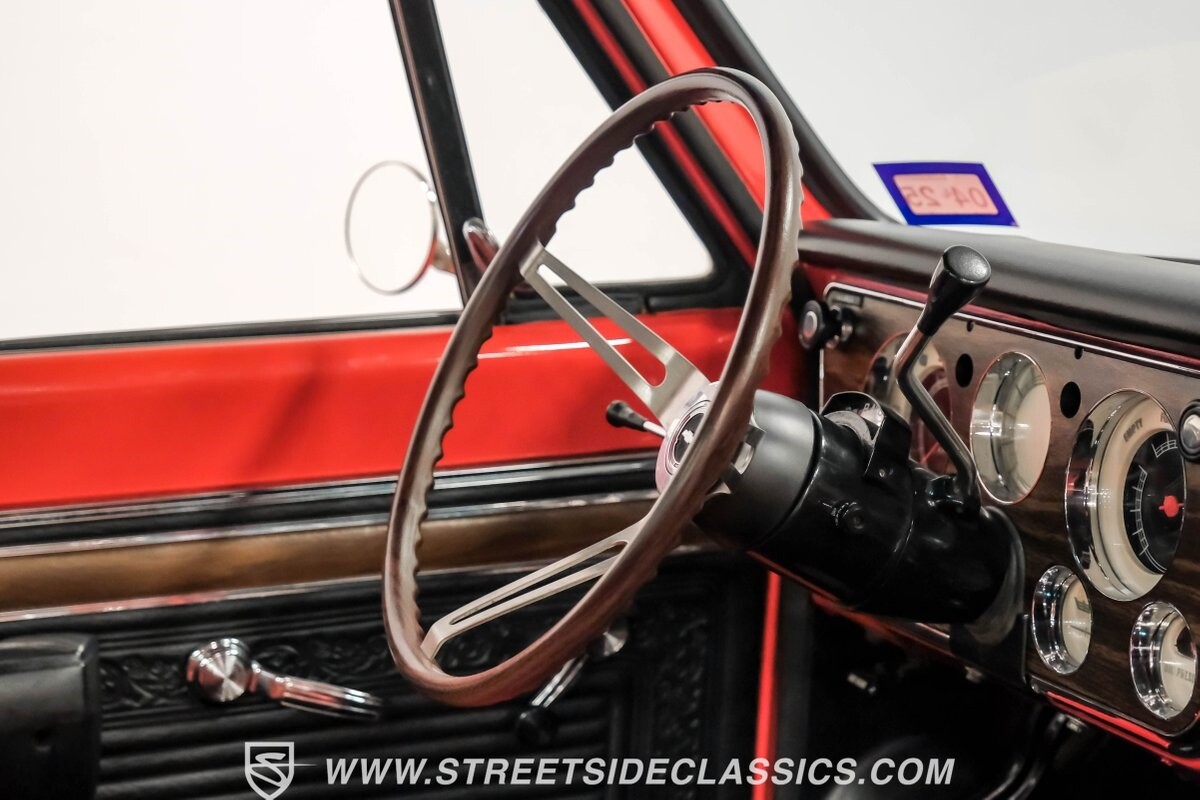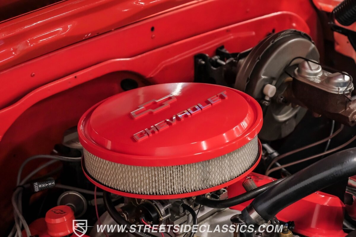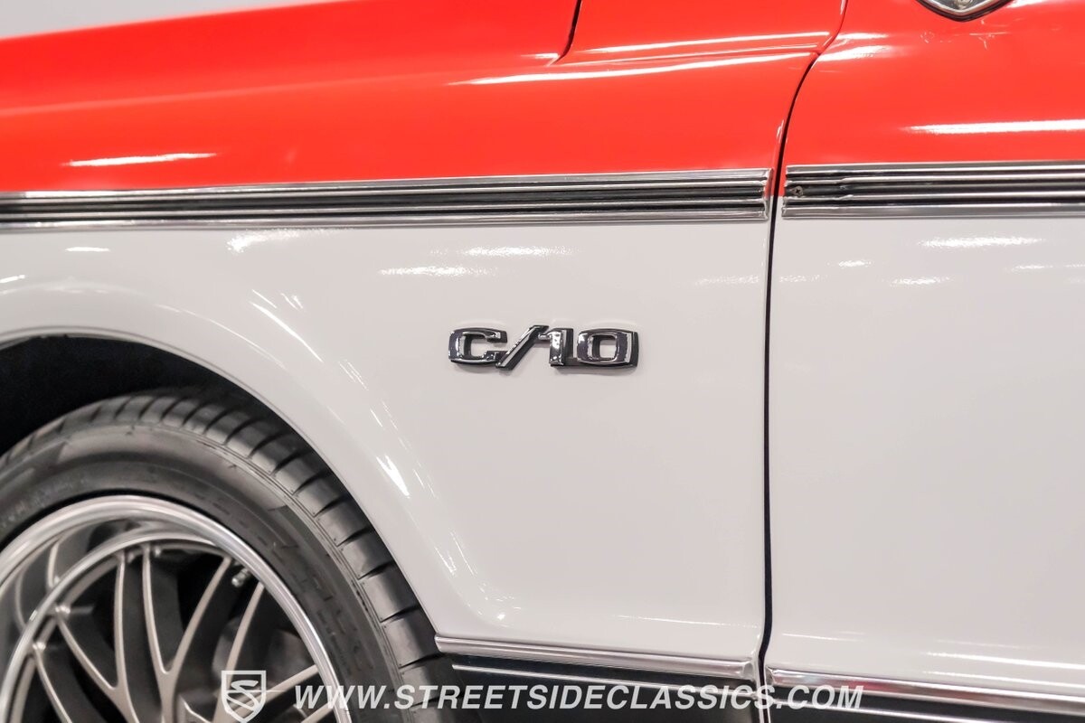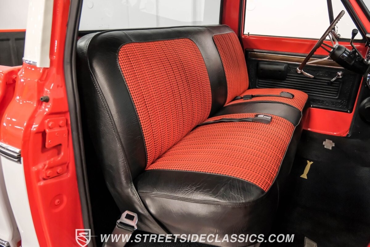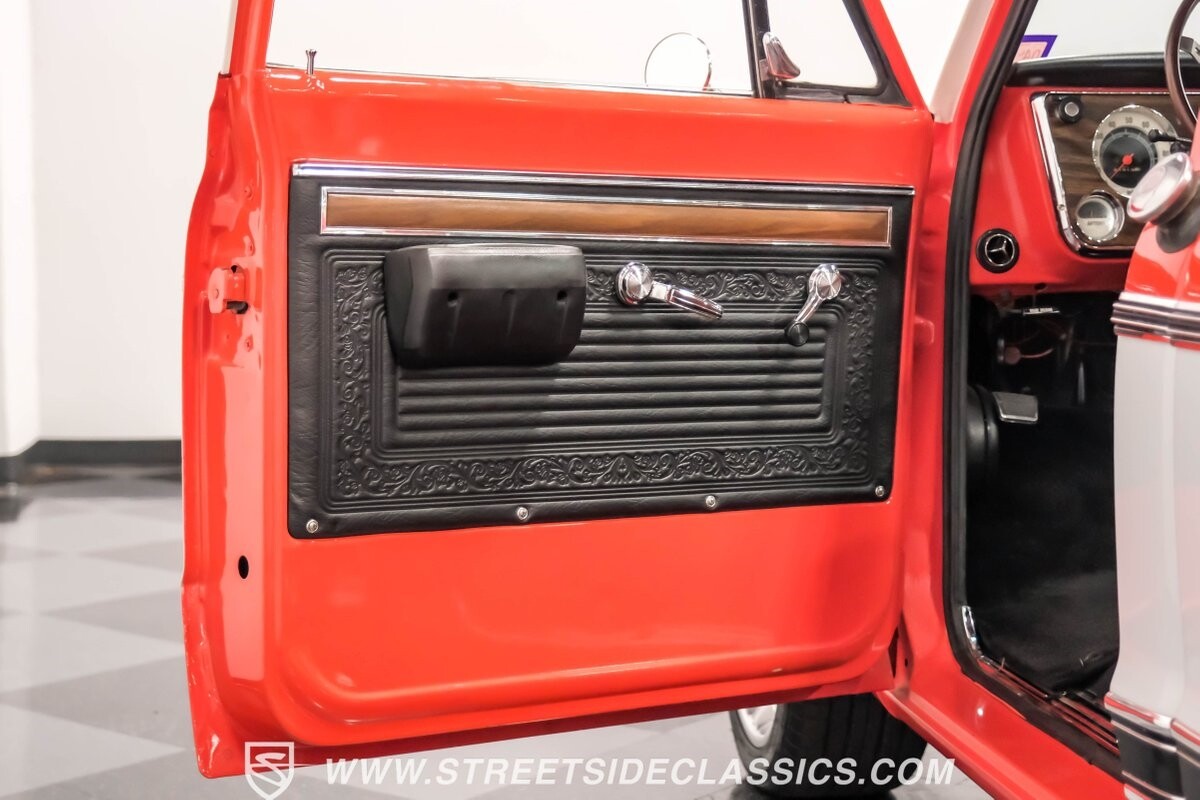 Under the cowl hood, the engine bay is highly detailed with a 5.0-litre Chevy small block engine paired with 700R4 automatic transmission that sends power back to a 12-bolt rear end. Additionally, this C/10 is equipped with an aluminum intake manifold, Edelbrock carburetor, Headman headers, great-sounding Flowmaster mufflers, power steering, power brakes with front discs and a cool orange Chevrolet air cleaner with matching valve covers.
