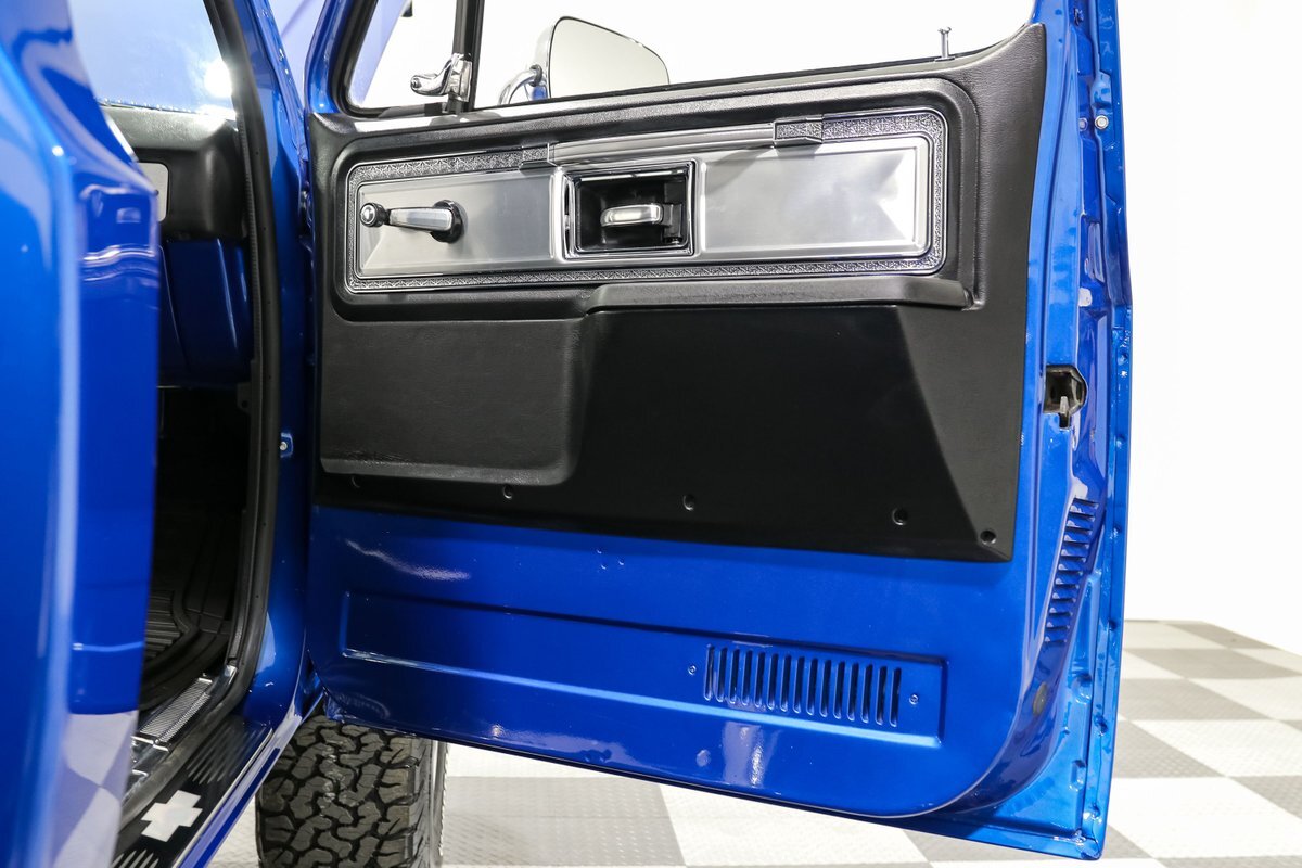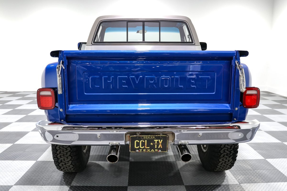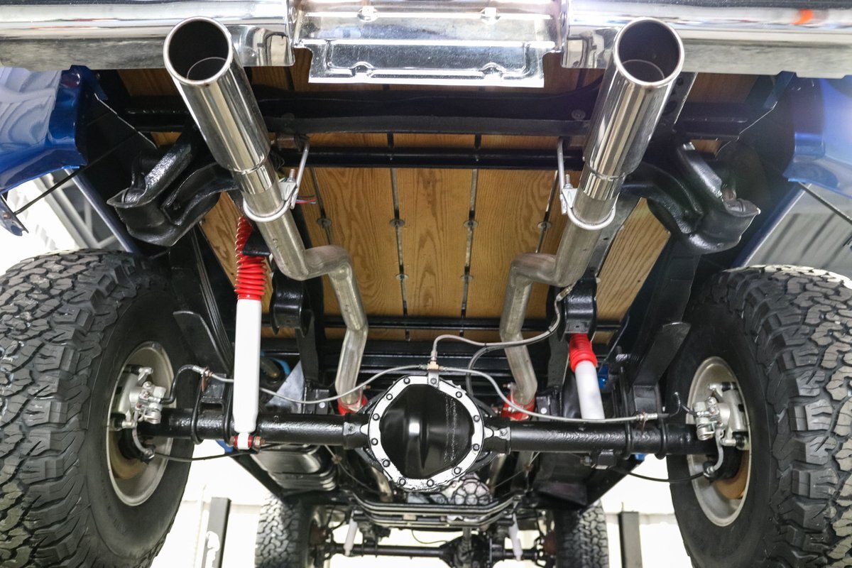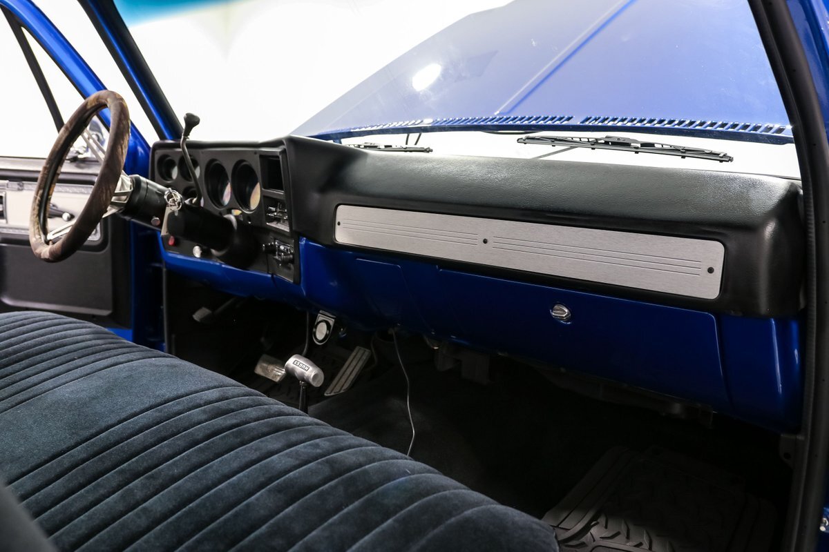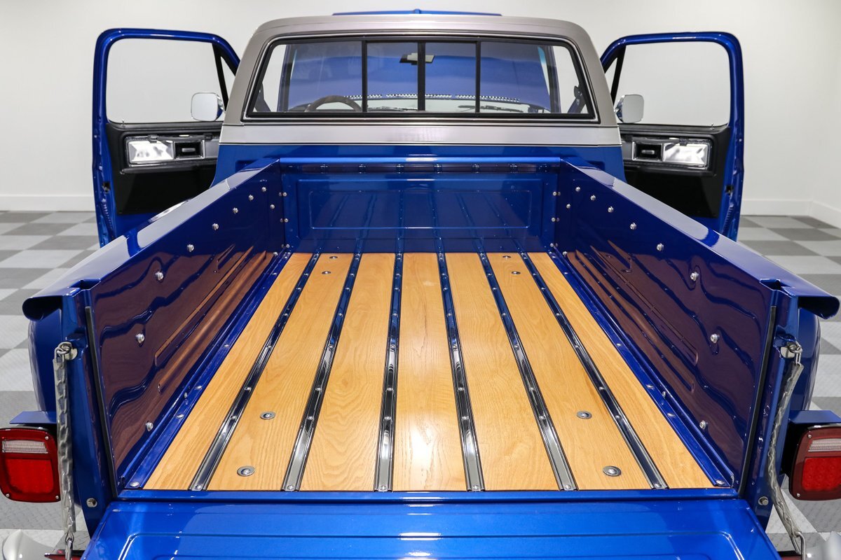 The exterior of this K10 is finished to perfection, with a wood bed featuring stainless steel stripes that add a touch of elegance to its rugged persona. The vibrant Blue paint highlights the truck's bold lines and muscular stance, making it a standout on any road. This truck isn't just about looks; it's built to perform and is ready for any adventure.
