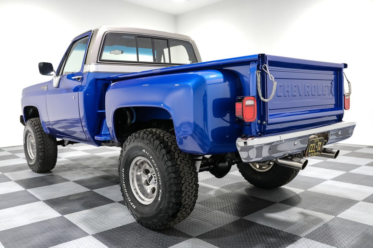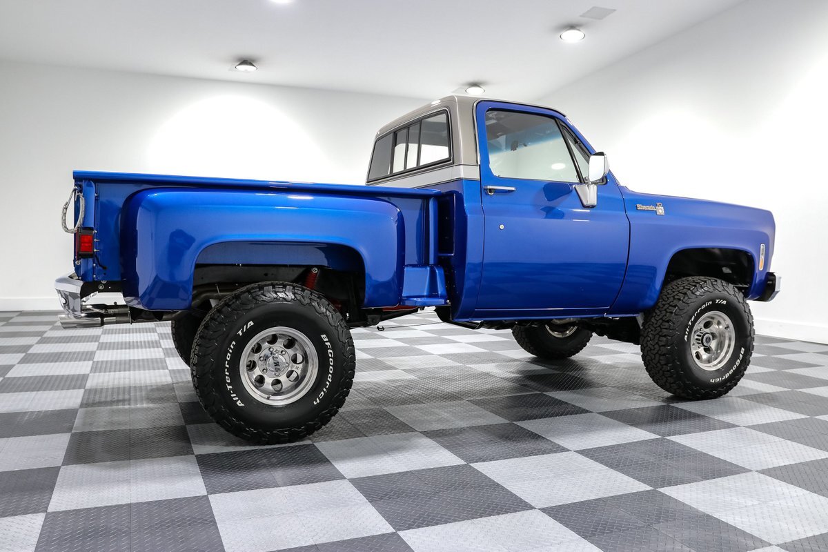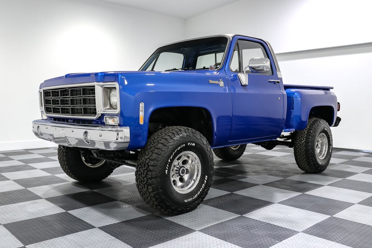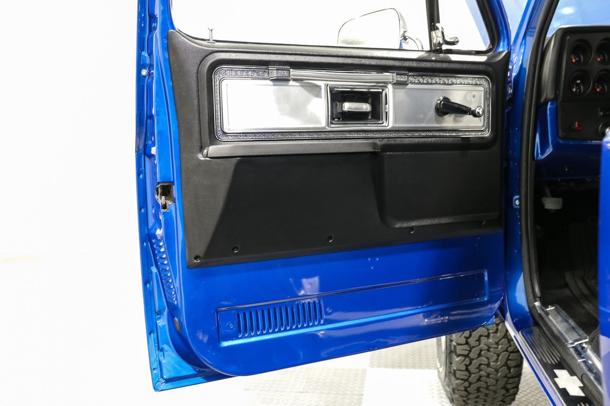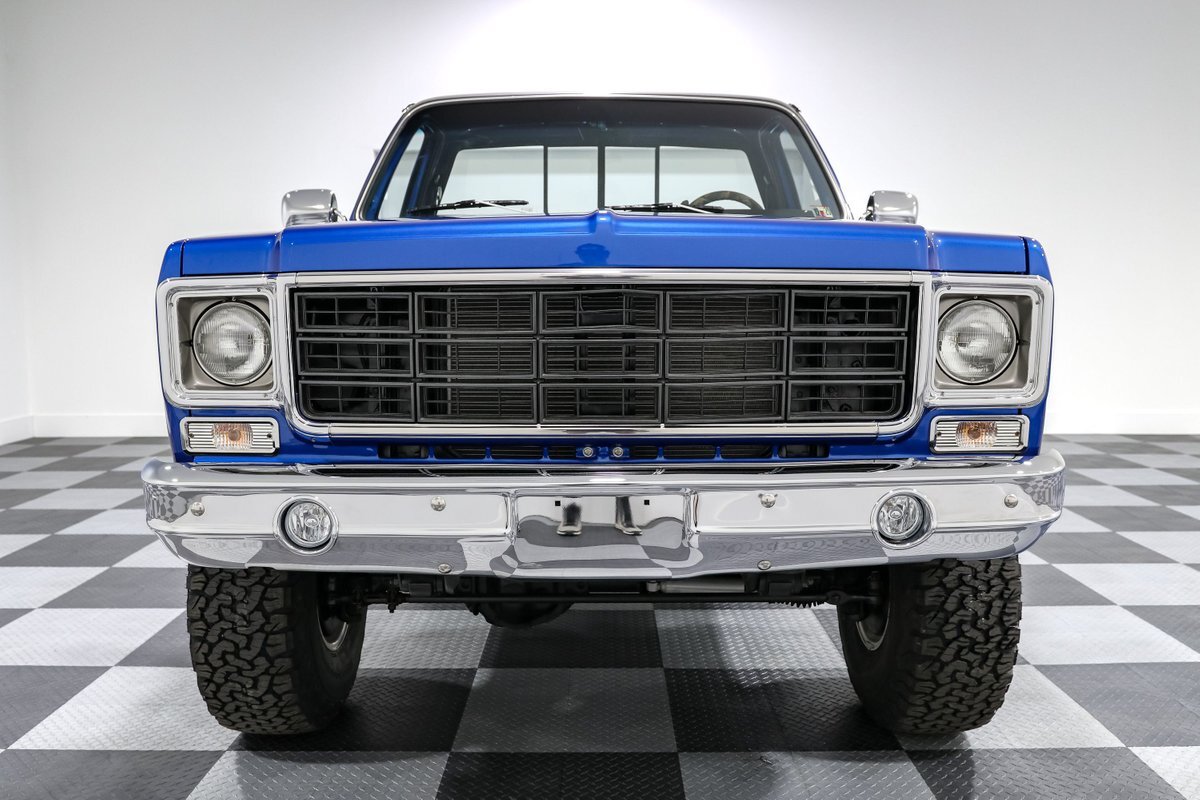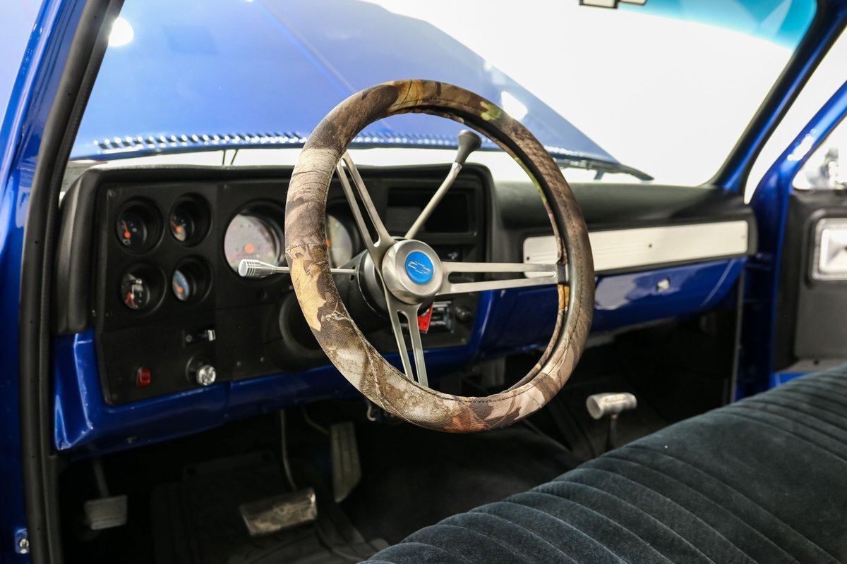 The exterior of this K10 is finished to perfection, with a wood bed featuring stainless steel stripes that add a touch of elegance to its rugged persona. The vibrant Blue paint highlights the truck's bold lines and muscular stance, making it a standout on any road. This truck isn't just about looks; it's built to perform and is ready for any adventure.