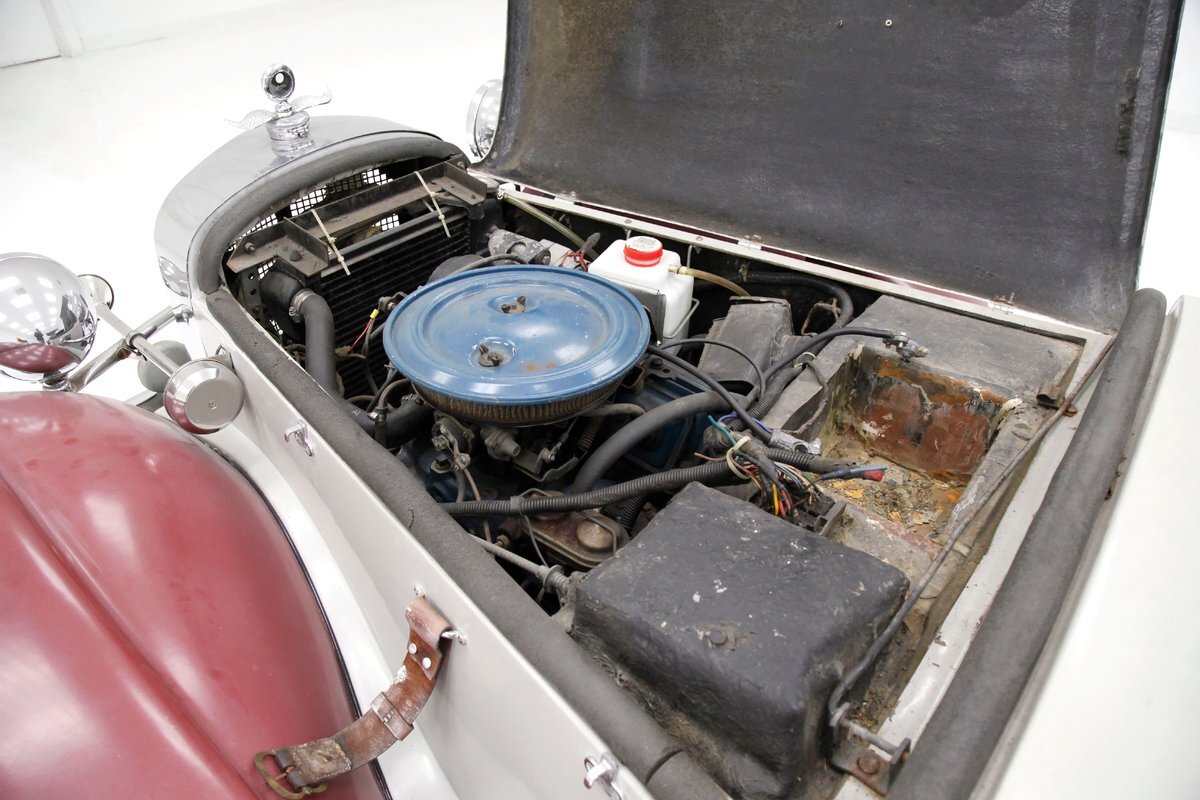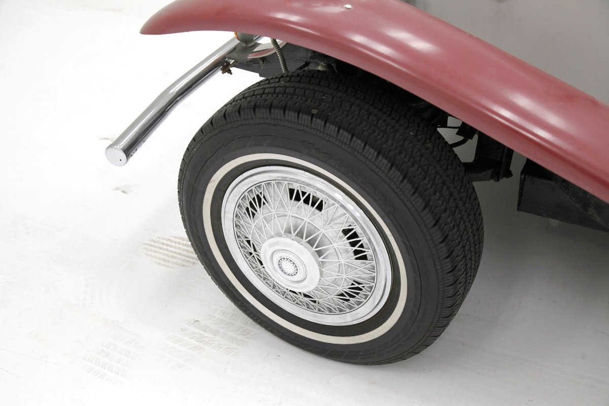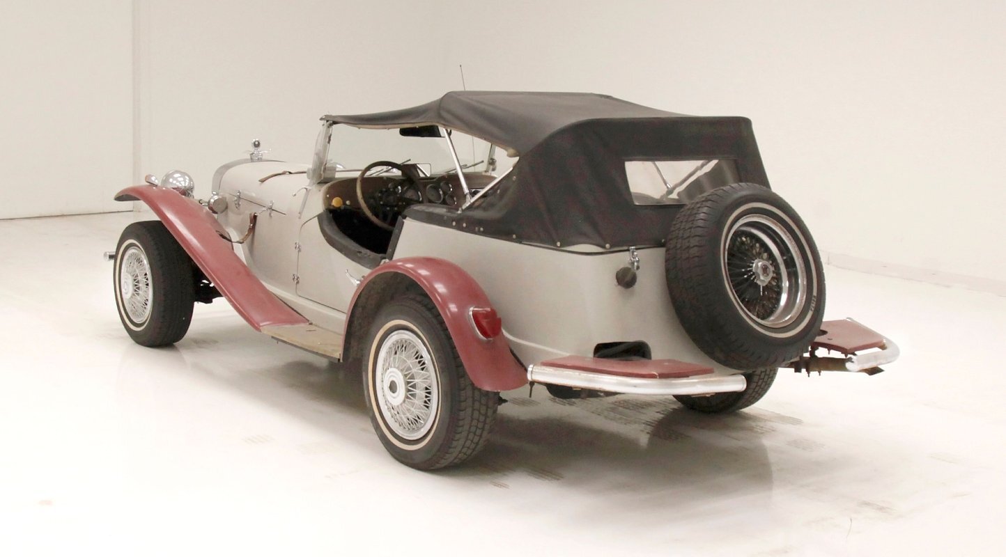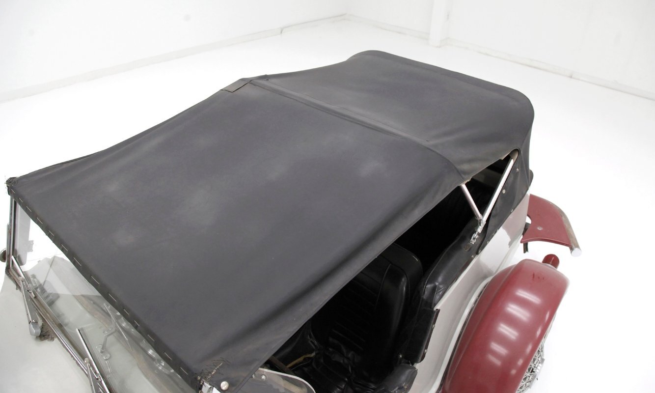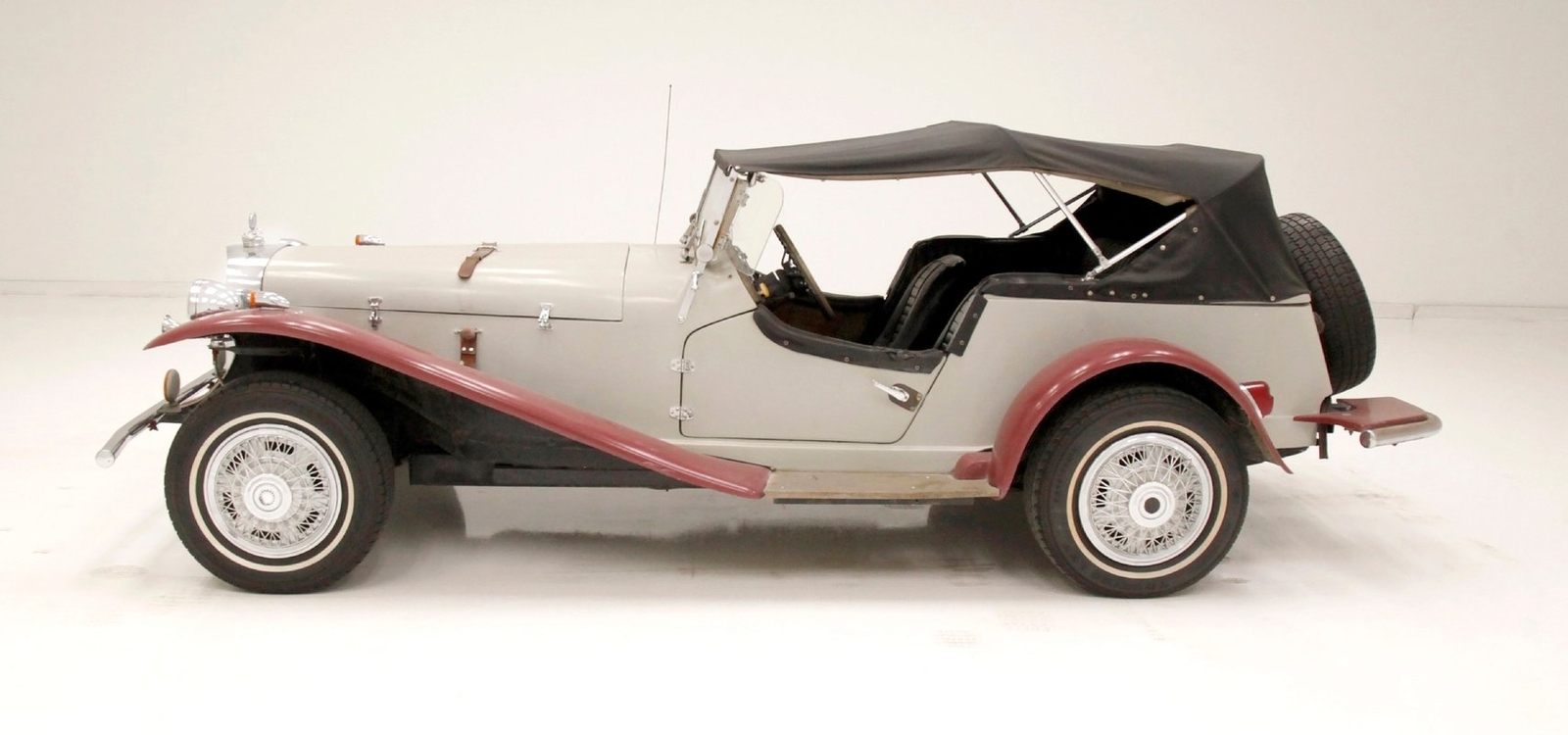 For a fiberglass kit car, fit and finish are remarkably good, with even door gaps, a snug-fitting trunk lid, and glossy paint that is familiar to anyone who has driven, built, or even seen another Gazelle. This one is highlighted by a 2 tone body in gray and maroon which draws attention and your eyes to the long hood wrapped in a leather belt and sweeping fenders. Other details like the chrome grille, rubber covered running boards, and chromed wire wheel covers, are all part of the vintage illusion and everything remains in very good condition. So you know the car was loved and treated right. And with a black canvas top, side wind wing windows and continental rear bumper complete with a wire wheel spare, looks the part of a wealthy aristocrat showing up at the club for dinner.